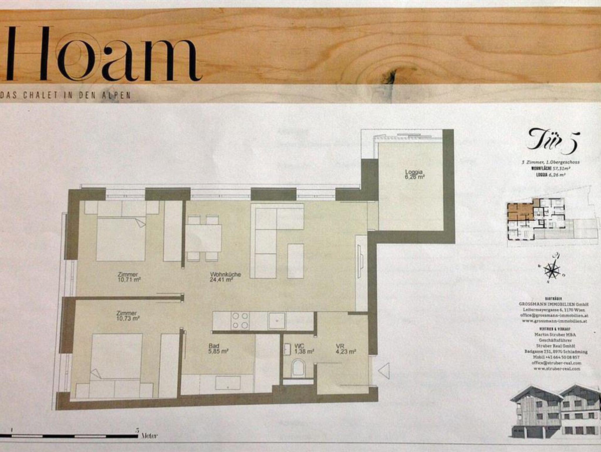 Auf alpinen Traditionen aufbauend eine zeitgeistige Formensprache zu entwickeln, war die Vision des Architekten Hans Posch. 2015 wurde diese Vision in die Tat umgesetzt und im Zentrum von Schladming das Appartementhaus „Hoam - das Chalet in den Alpen“ errichtet. Stücke aus verschiedenen Kontinenten, Epochen, Designstilen und Skulpturen prägen die Appartements, bringen die Räume zum Klingen und erzeugen eine Harmonie mit den Menschen, die hier wohnen. Einzigartig: hier wohnt man hip und traditionsbewusst zugleich. Geboten wird im Appartement TOP 5 für 4-6 Personen auf 57 m² Wohnfläche. Ausgestattet mit einer großzügigen Wohnküche, Loggia, zwei separaten Schlafzimmern sowie einem Badezimmer bietet das Appartement alles, was das Urlauberherz begehrt. Das TOP 2 bietet auf über 100m² genügend Platz für 6-8 Personen. Ausgestattet mit einer großen Wohnküche, 3 separaten Schlafzimmern sowie 3 Bäder En-Suite eine nette Terrasse mit Garten runden das Angebot ab.