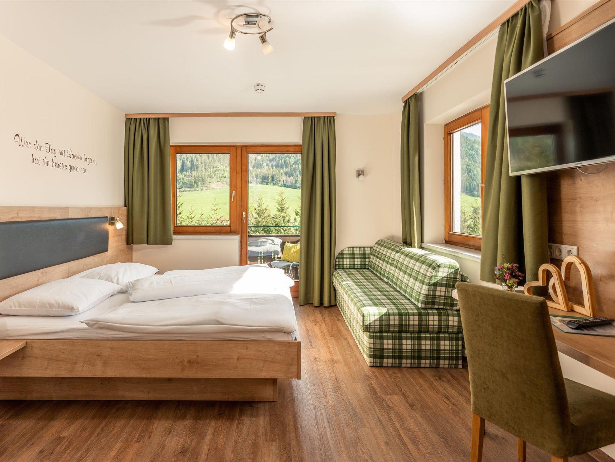 Zimmer mit DU/WC, TV und Balkon. Jedes Zimmer ist mit einem Safe ausgestattet. Das 3. Bett ist eine Couch.