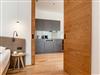 Das großzügige Studio deLuxe bietet Platz für bis zu 4 Personen und kombiniert Komfort mit stilvollem Design. Eine moderne, voll ausgestattete Küche mit einladender Essecke, ein gemütlicher Wohnbereich mit Kabel-TV und Sofa sowie ein westseitiger Balkon laden dazu ein, unvergessliche Momente zu erleben.