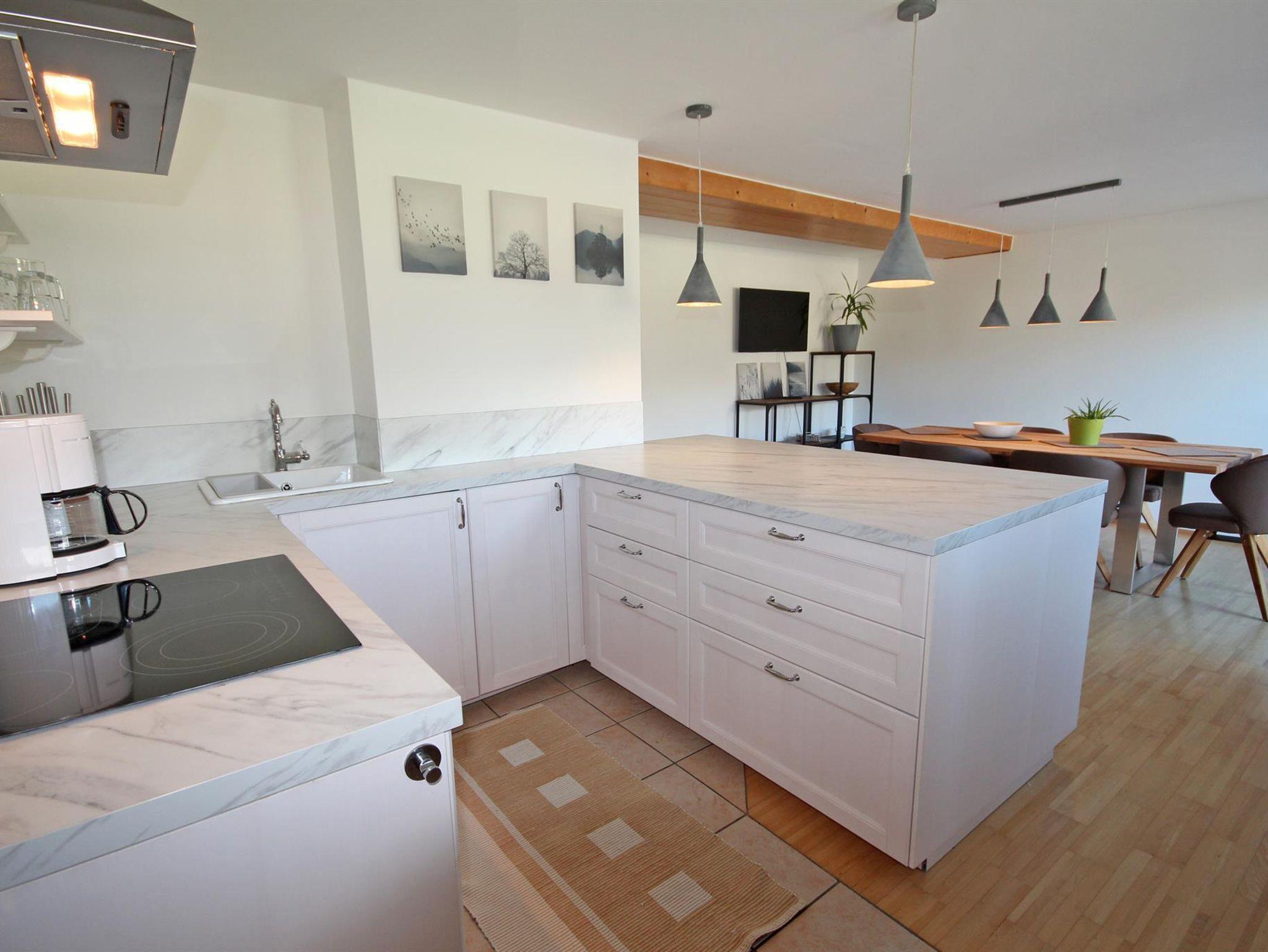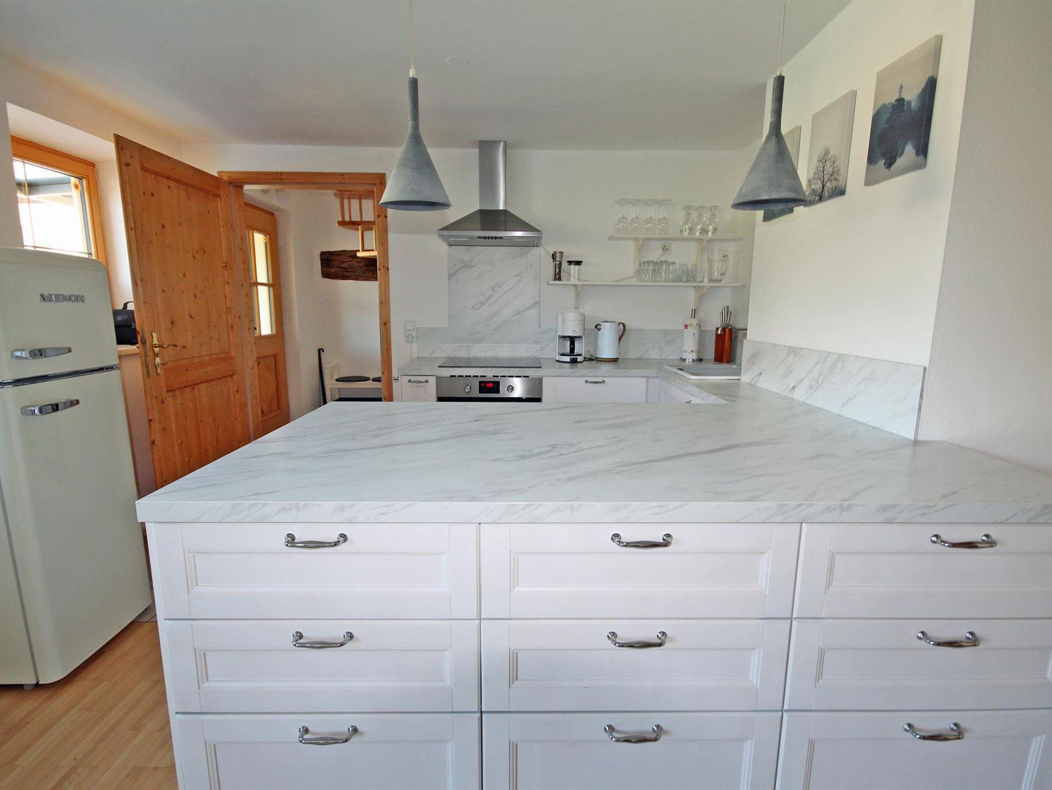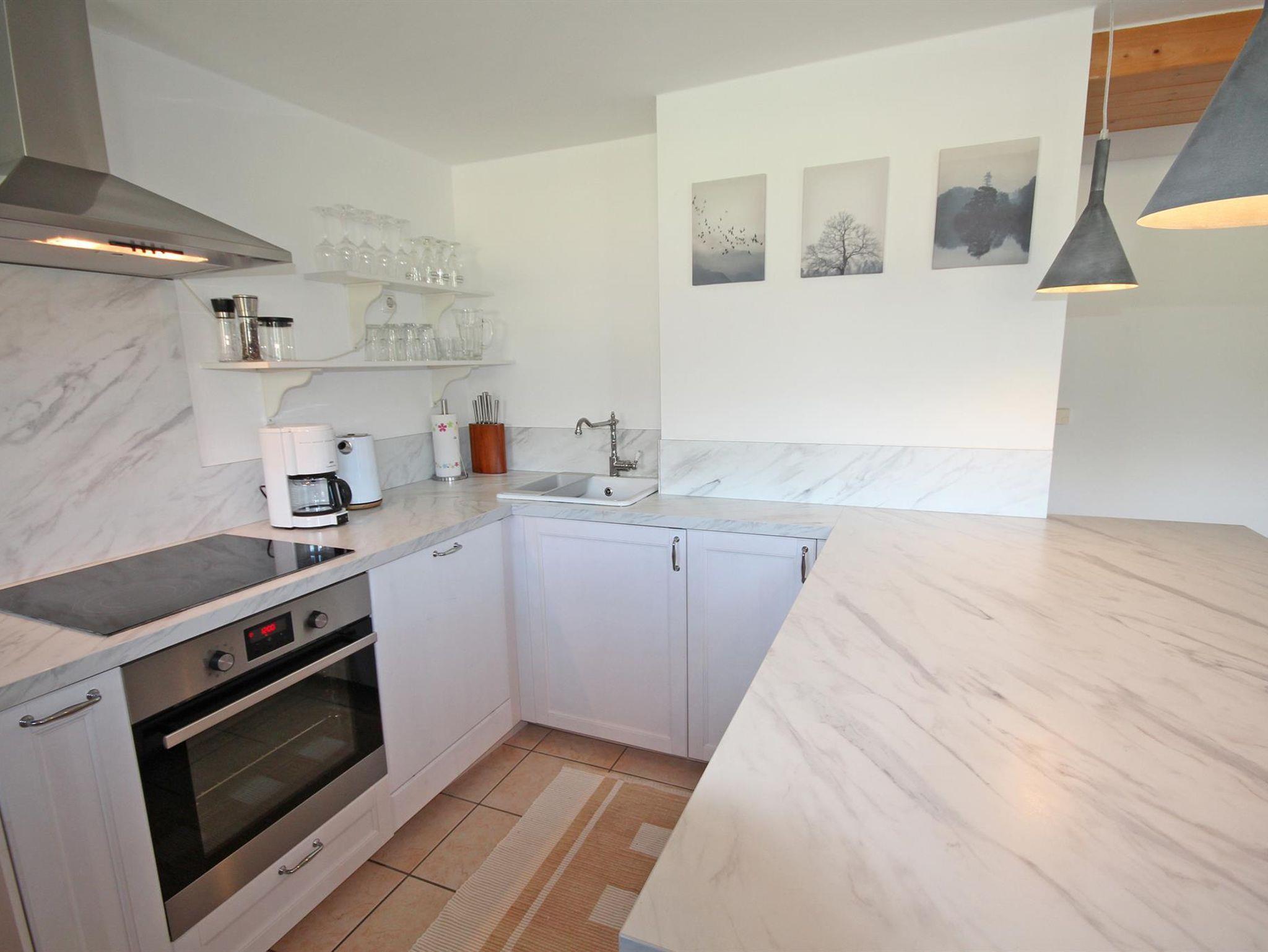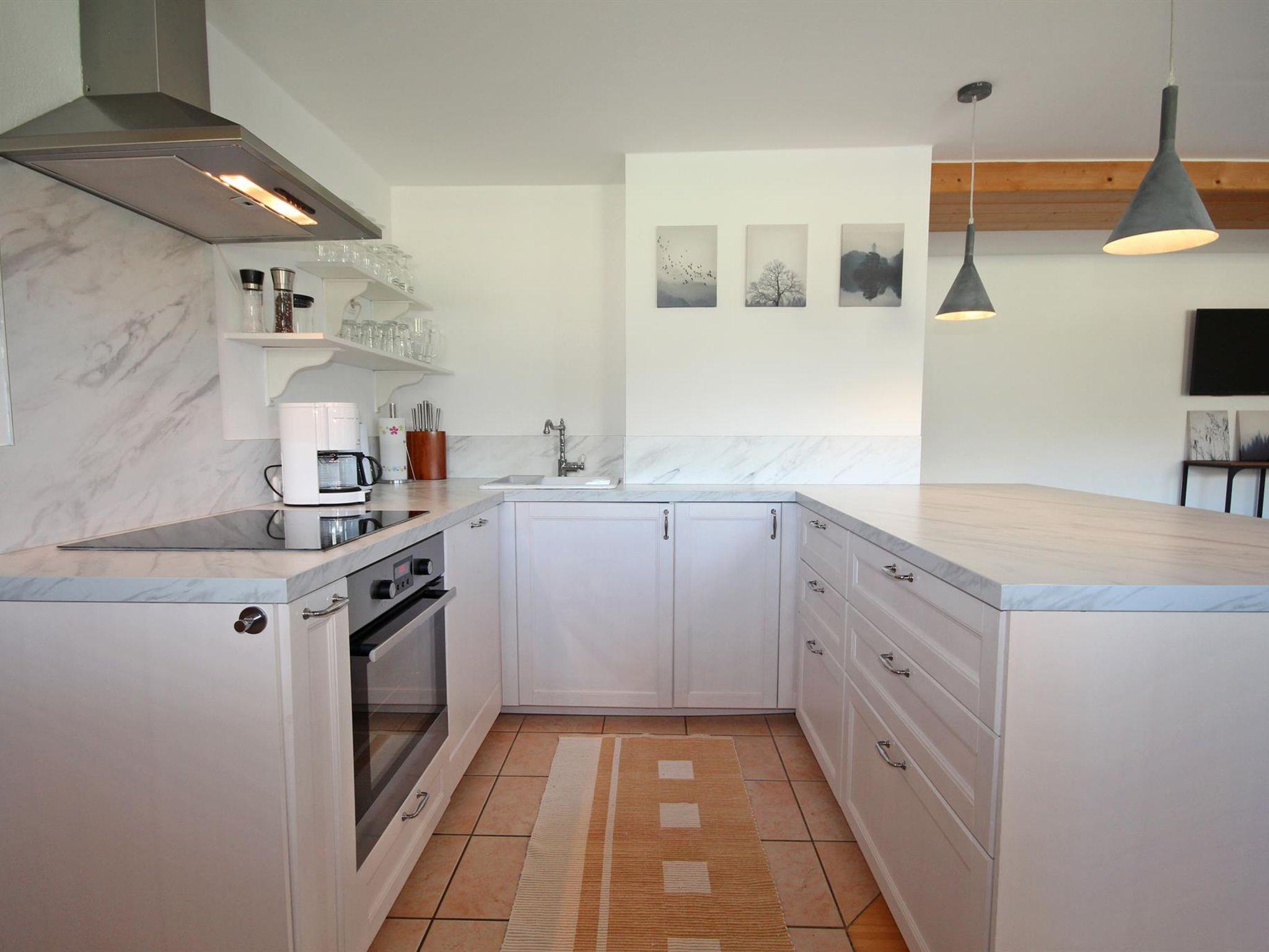-Großzügige und voll ausgestattete Wohnküche mit 4-Plattenherd, Kaffeemaschine, Wasserkocher, Toaster, Geschirrspüler, Dunstabzug, Kühlschrank mit Gefrierfach, Esstisch für 8 Personen, 2 Lounge Stühle und TV. Von der Wohnküche hat man ebenso Zugang ins Freie.