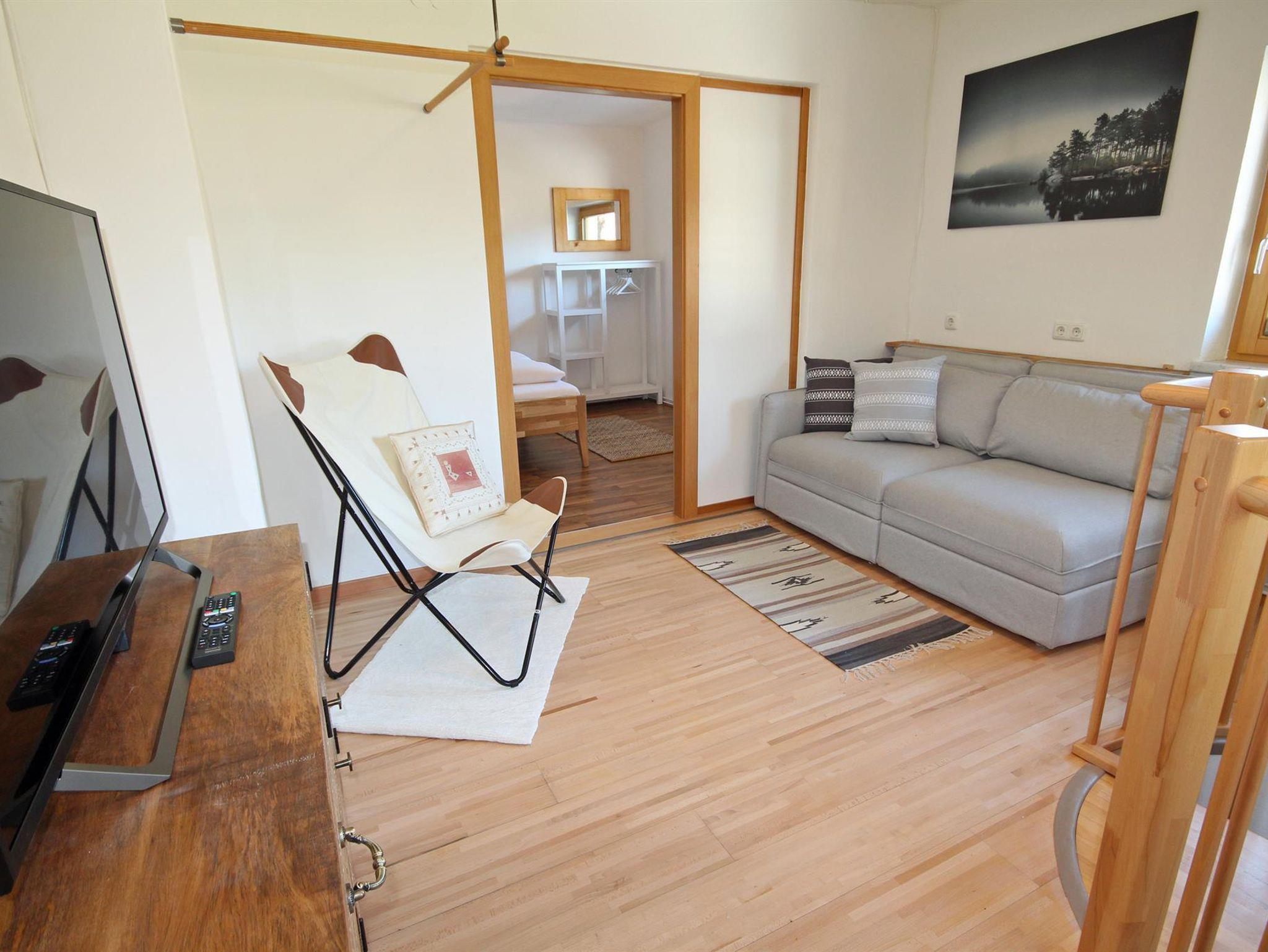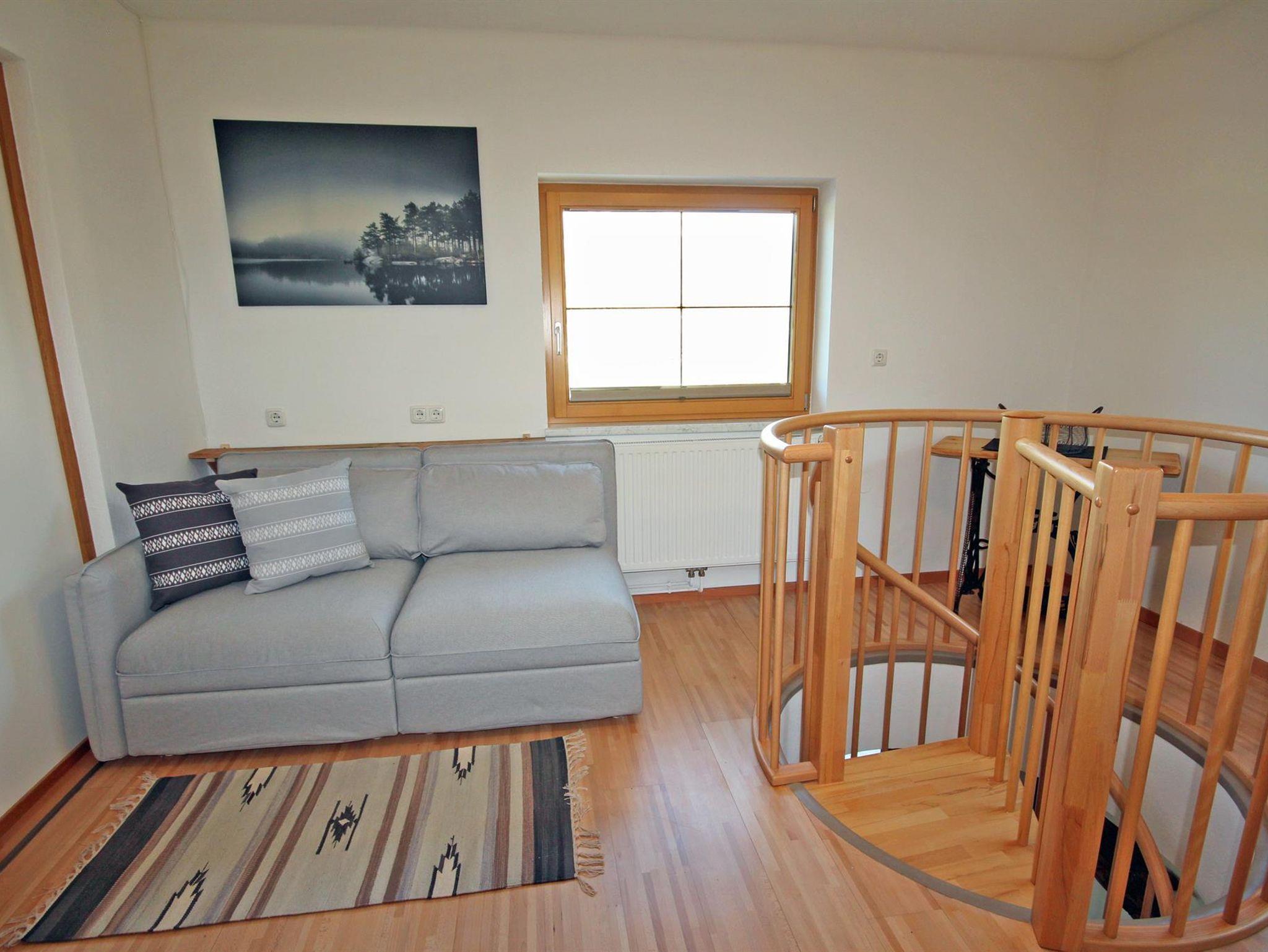 -Kleine aber feine Wohnecke mit Sofa und TV im Anschluss an die Wendeltreppe