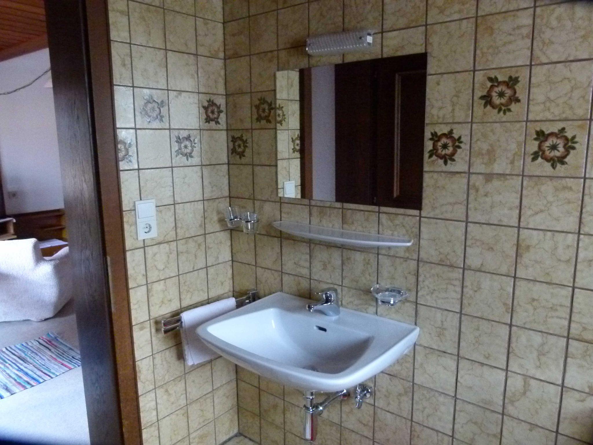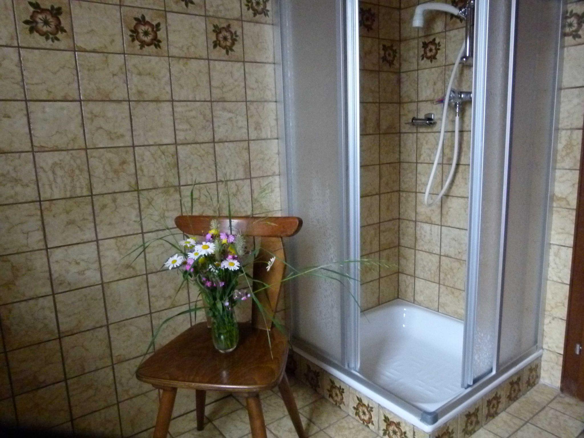 Das große Badezimmer ist mit DU/WC/Föhn ausgestattet. Die Dusch- bzw. Handtücher und WC-Papier bekommen Sie natürlich von uns. Das Badezimmer ist mit einem Fenster ausgestattet. So sind Sie mit der Natur verbunden. Die Hühner verweilen dort und im Frühjahr und Herbst grasen unsere Kühe auf der Weide, von denen wir die frische wertvolle Milch von gehornten Kühen auf Wunsch beim Frühstück servieren.