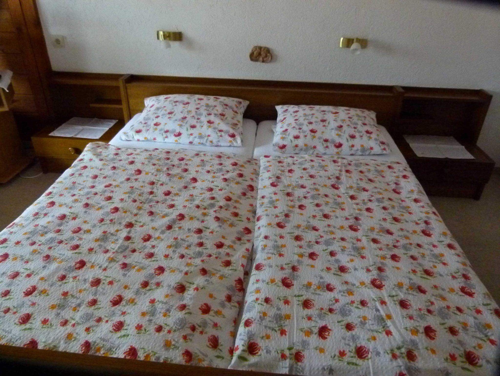 Im Sommer angenehmes kühles Zimmer Richtung Norden mit neuem Balkon. Im Zimmer steht ein Doppelbett mit 2 m Länge mit Nachtkästchen verbunden und sehr hellem Licht zum Lesen eines Buches aus unserer Bücherauswahl.