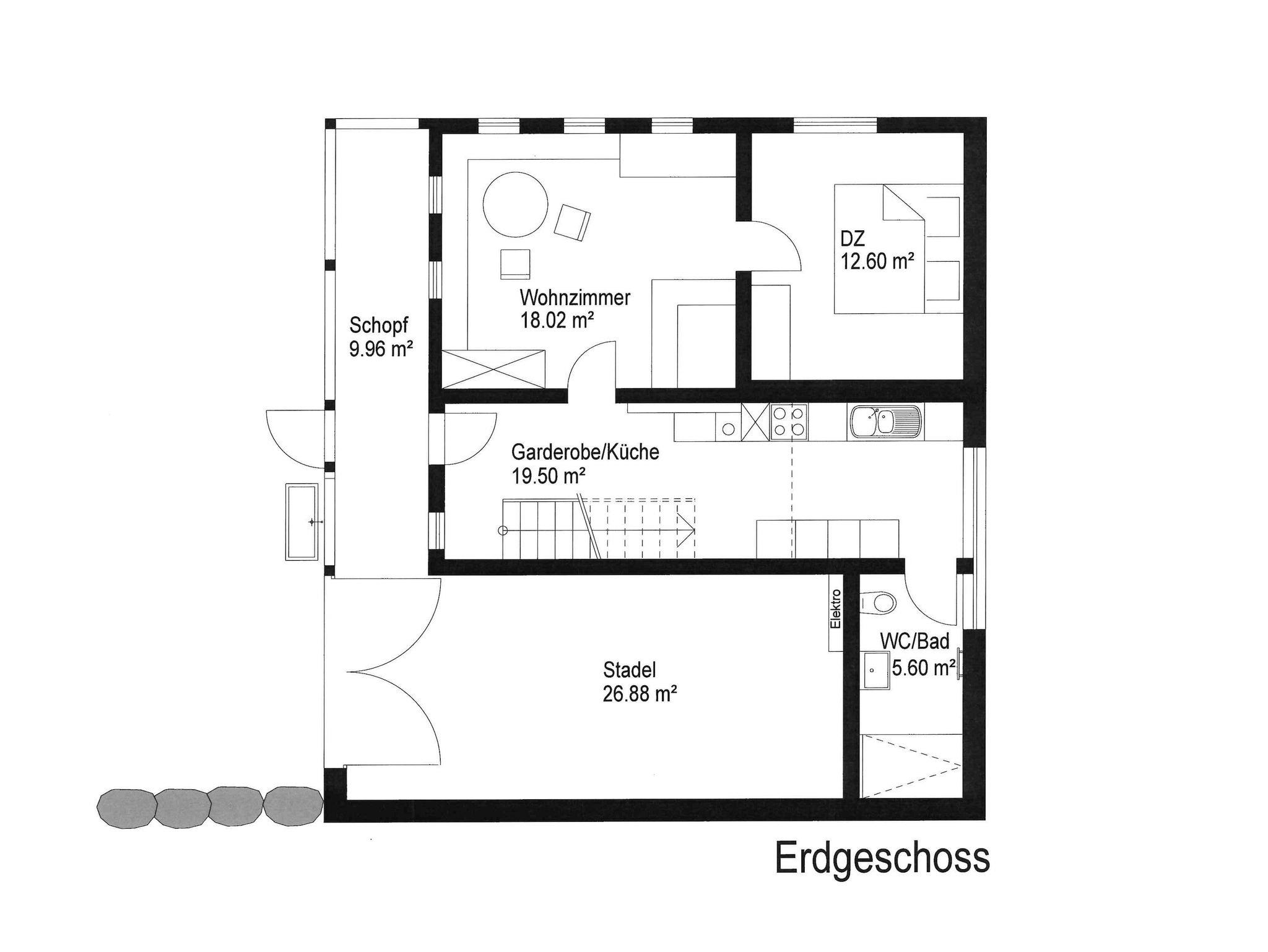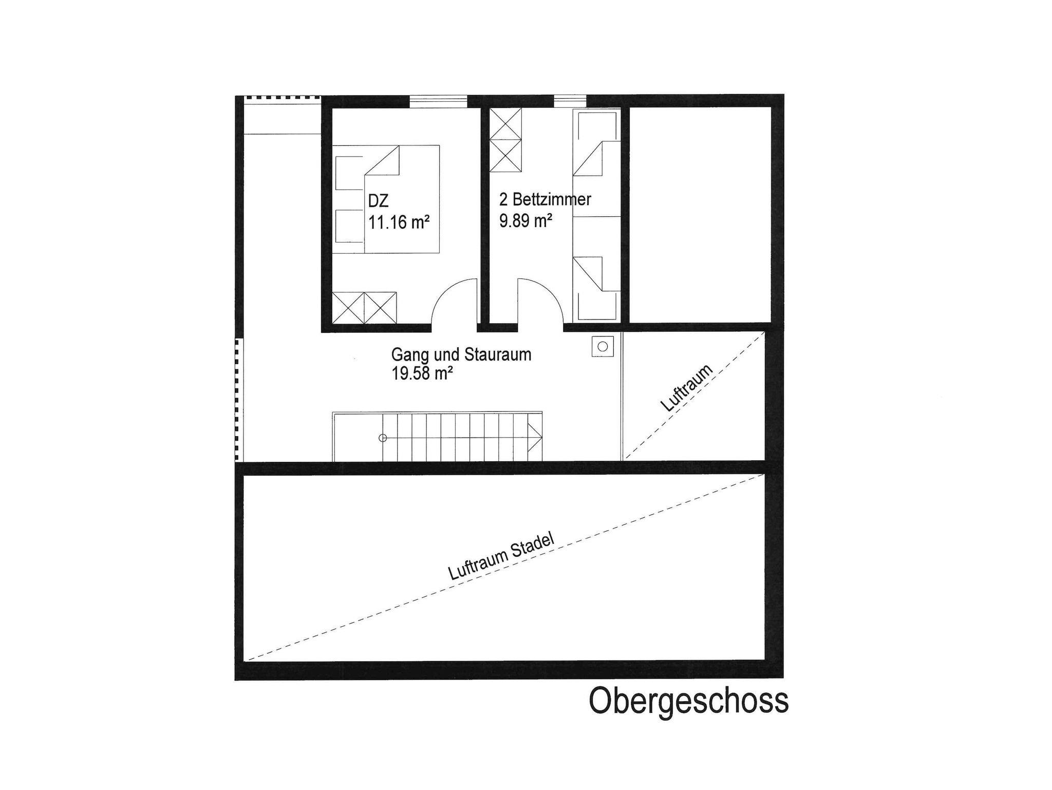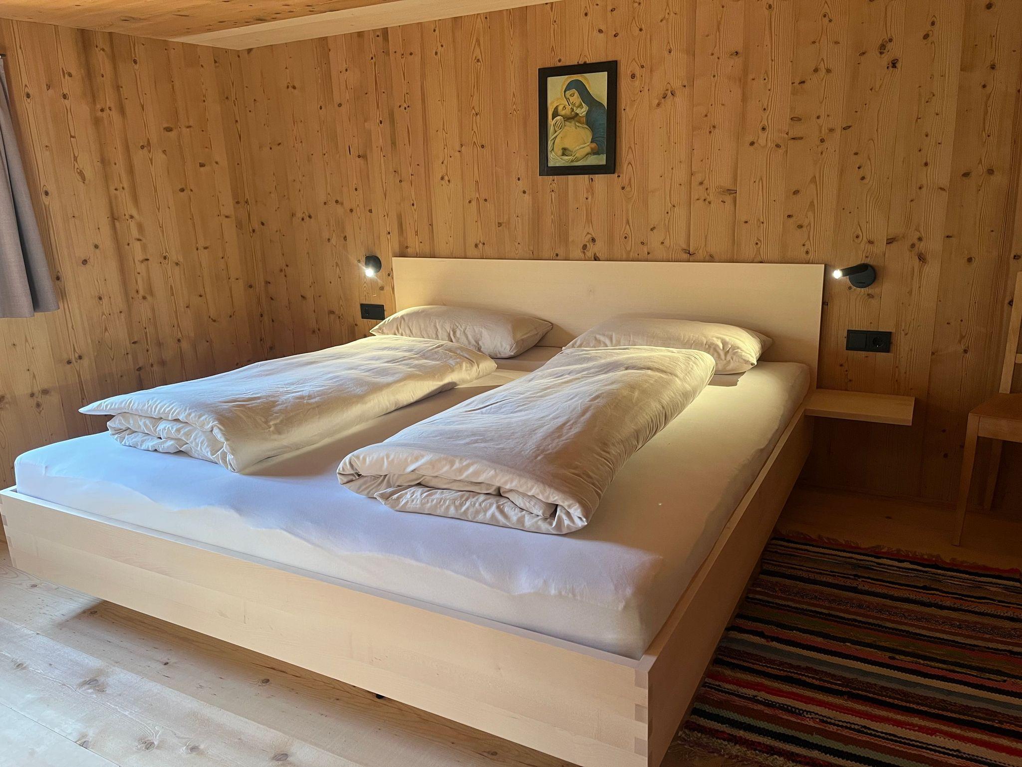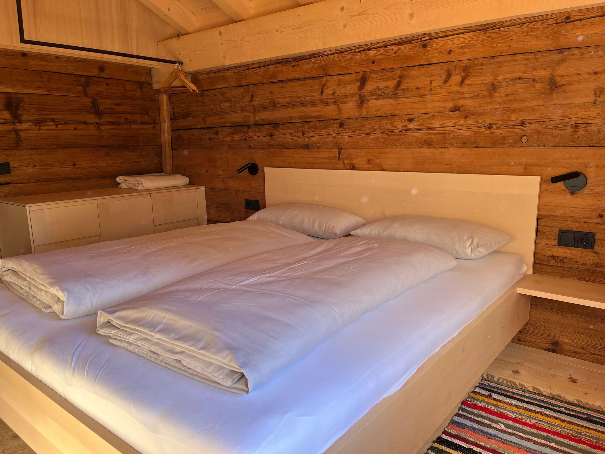 Auf zwei Ebenen befinden sich / eine voll ausgestattete Wohnküche / zwei Schlafzimmer mit Doppelbett / ein Schlafzimmer mit 2 separaten Betten / ein Bad mit WC und Dusche / eine gemütliche Wälder Stube (Wohnzimmer) mit Kachelofen und genügend Holz/ und ein Schopf (offene Veranda)