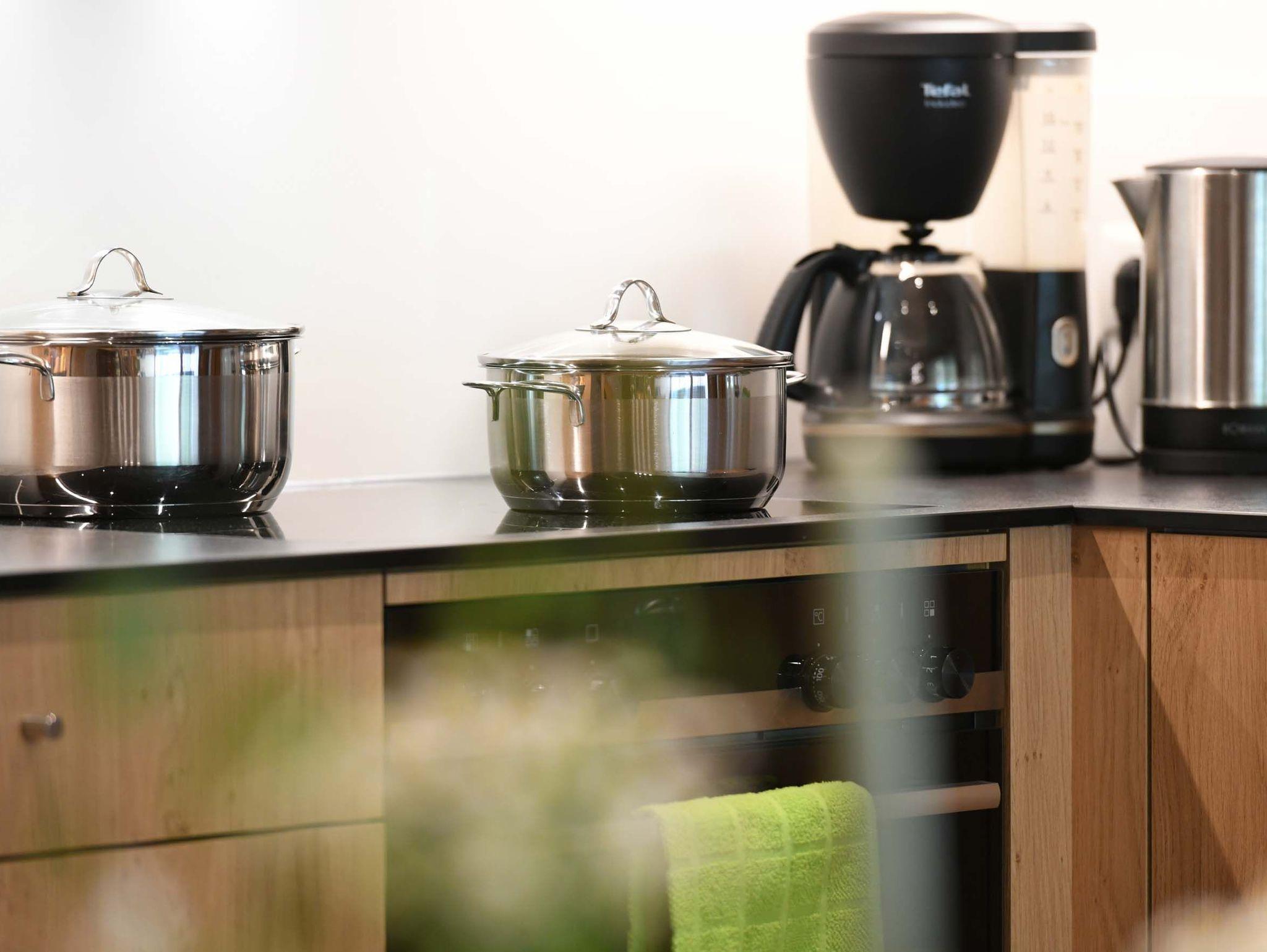 eingerichtet mit Geschirr, Kochtöpfen, Geschirrspüler, Kühlschrank mit