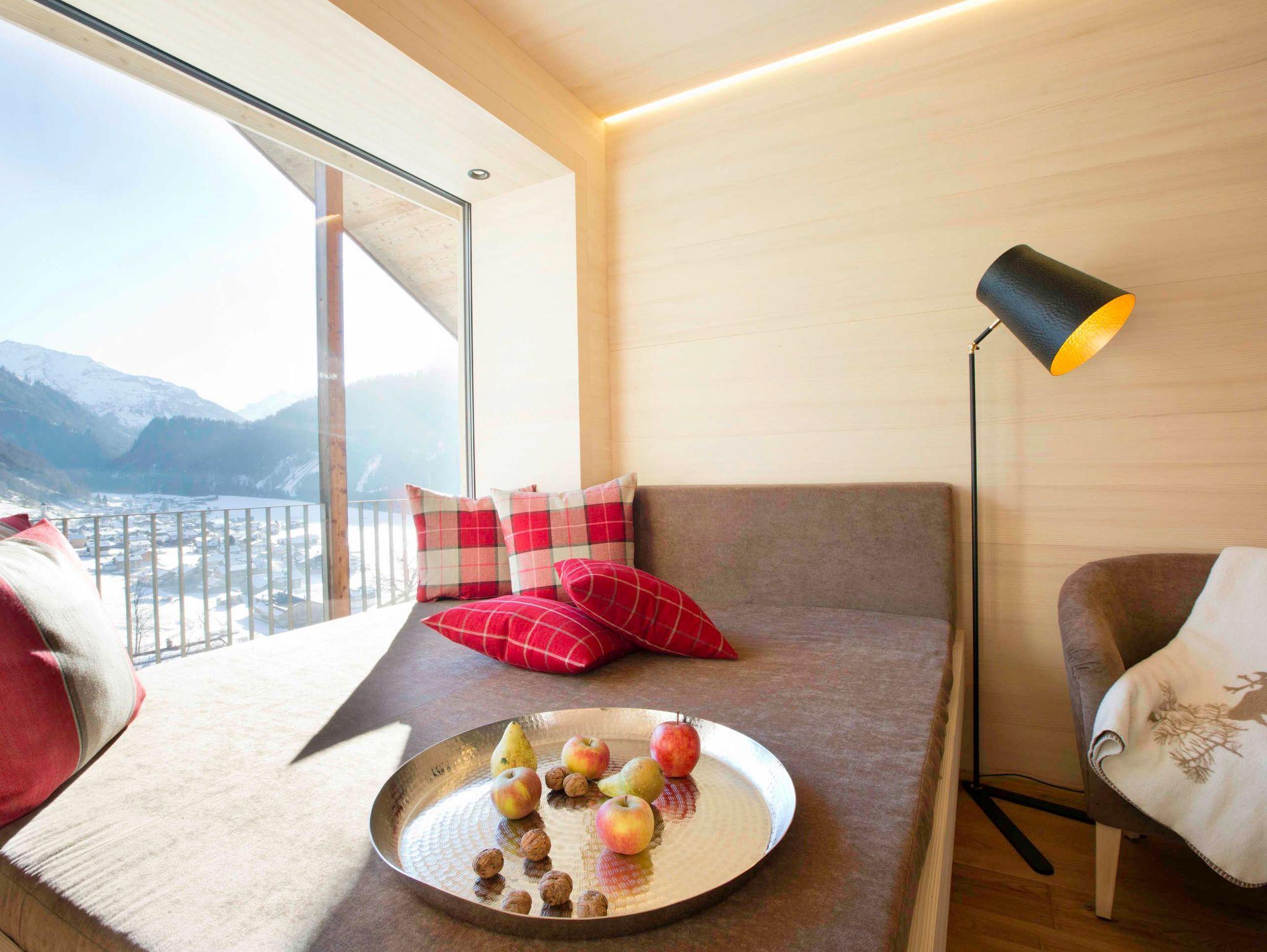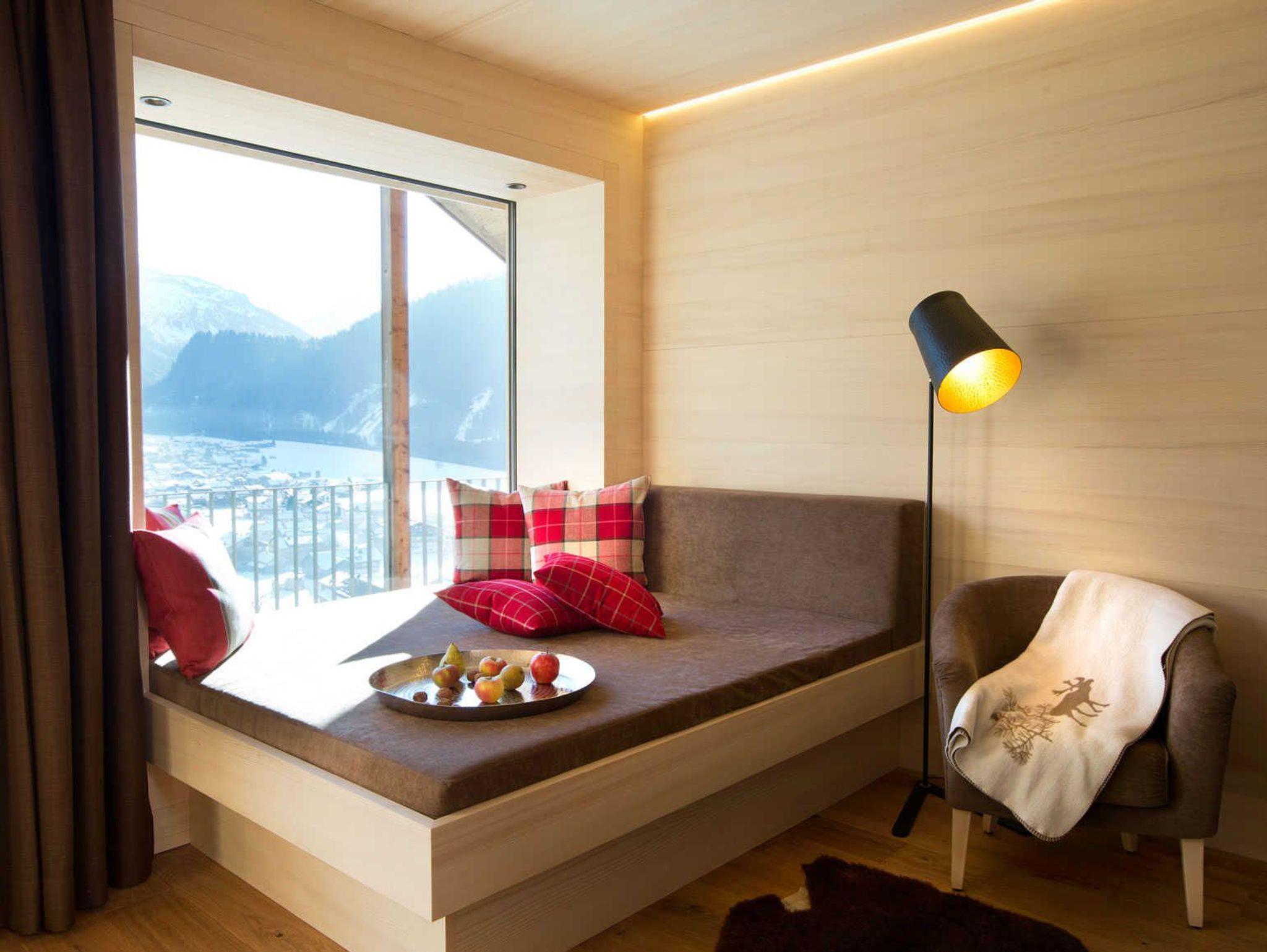 Ein Vergnügen mit bester Aussicht! 190 x 190 cm große Panoramacouch mit Traumblick auf Schoppernau. Rustikaler Eichenholzboden (ideal für Allergiker); Decken und Wände aus heimischer Weißtanne; 190 x 190 cm große Panoramacouch!