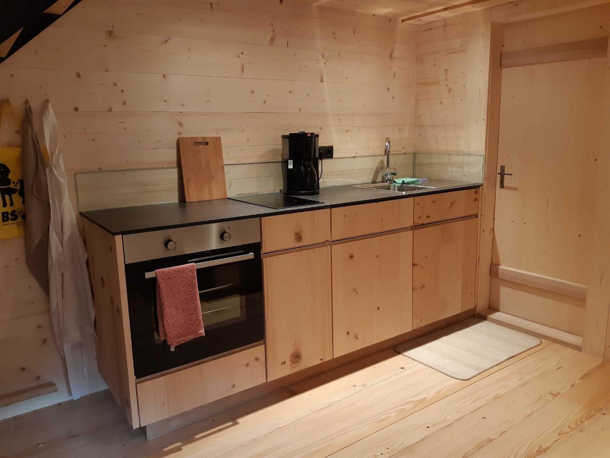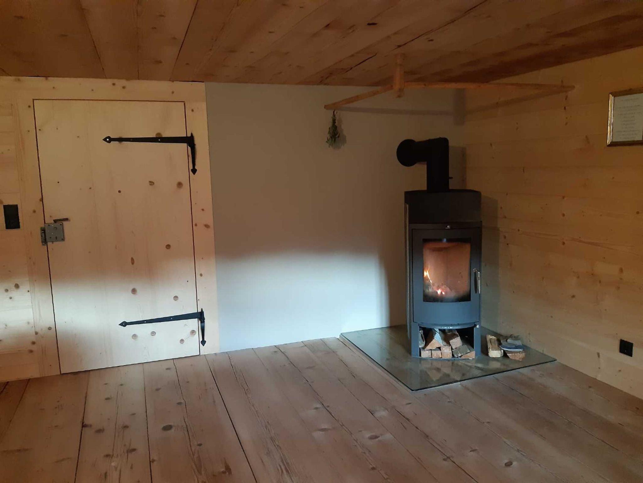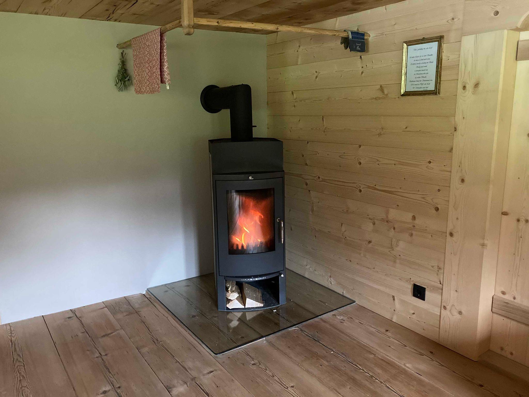 Unsere neu renovierte Ferienhütte verfügt über eine Küche, gemütliche Stube mit Holzofen, zwei Schlafzimmer, Dusche/WC und einen Schopf (Wintergarten).
