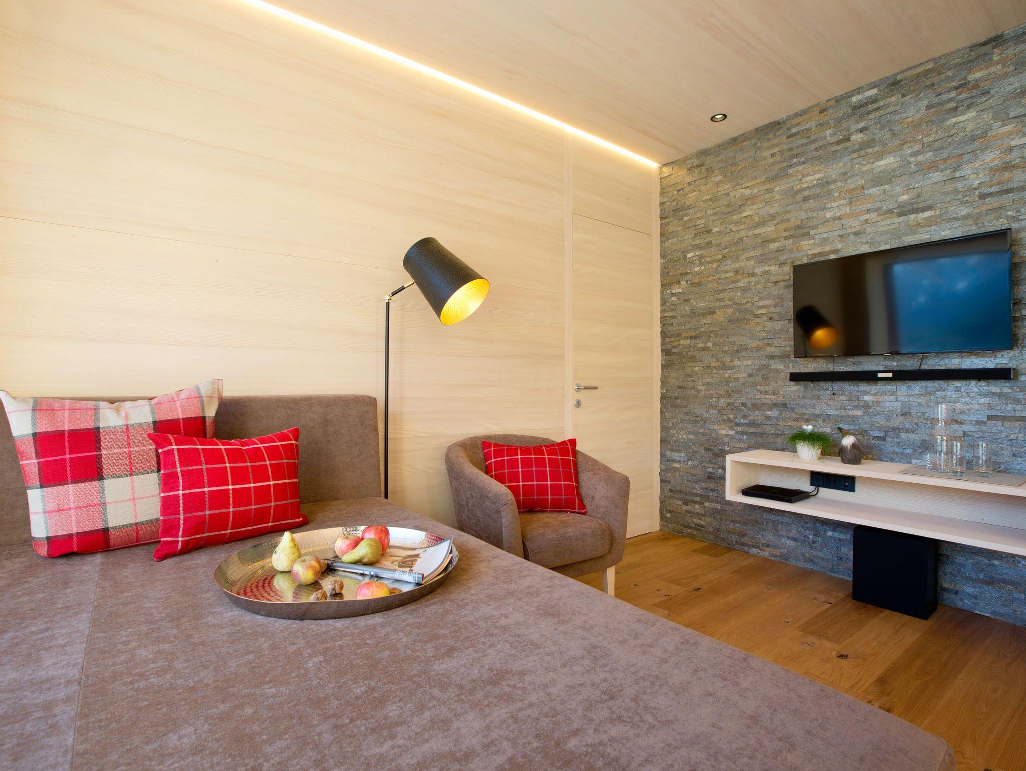 • Der Wohnbereich, in dezenten Farben, mit einer gemütlichen Couch und Couchtisch, sorgen für Wohlbefinden, Flat-TV mit Soundbar und Blu-Ray Player gibt?s natürlich auch