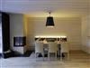 > Wohn- und Essbereich mit offenem, verglastem Kamin; großer Esstisch, gemütliche Ledercouch, dimmbare Beleuchtung, Flat-TV mit Soundbar, Blue-Ray-Player