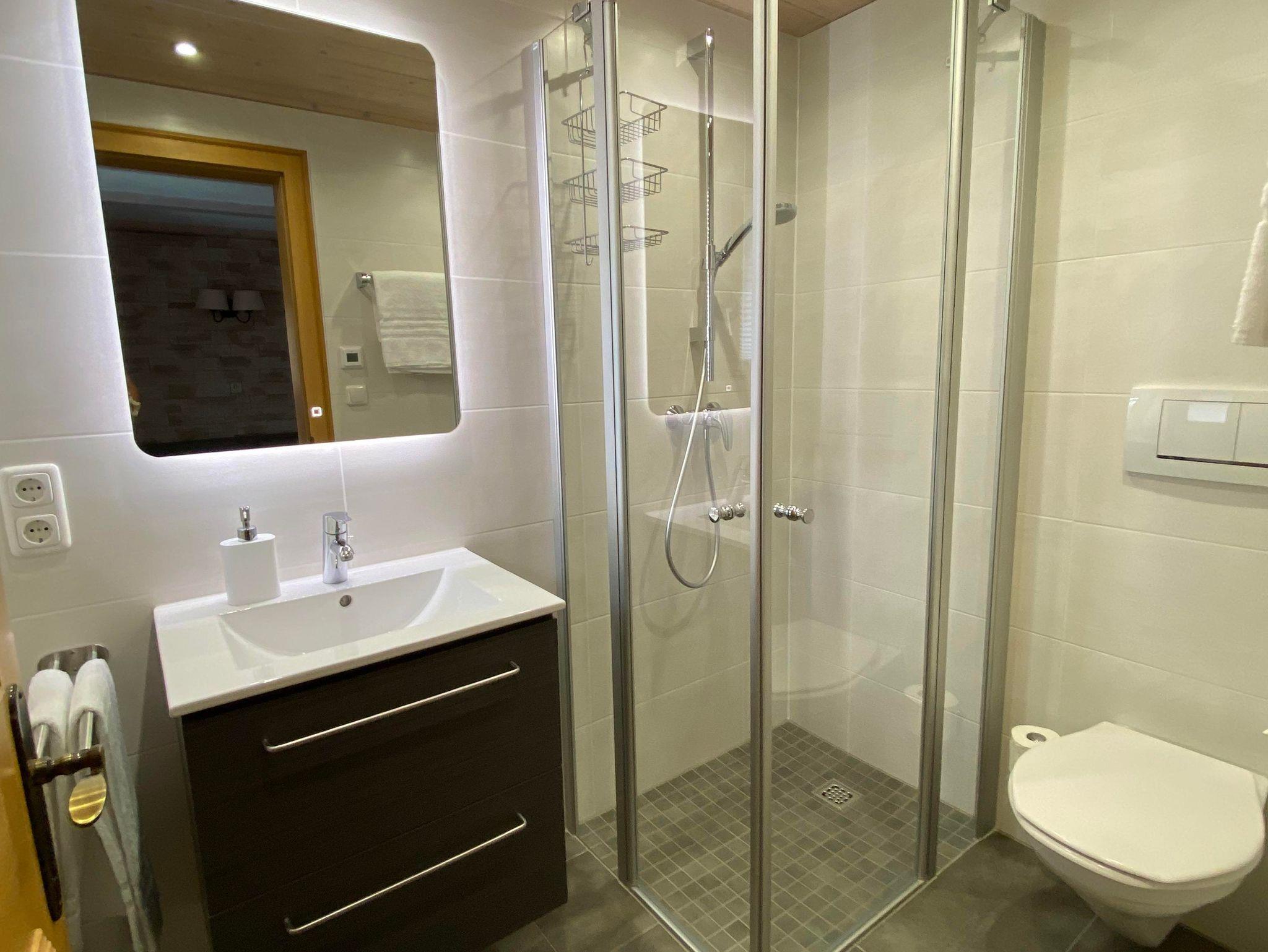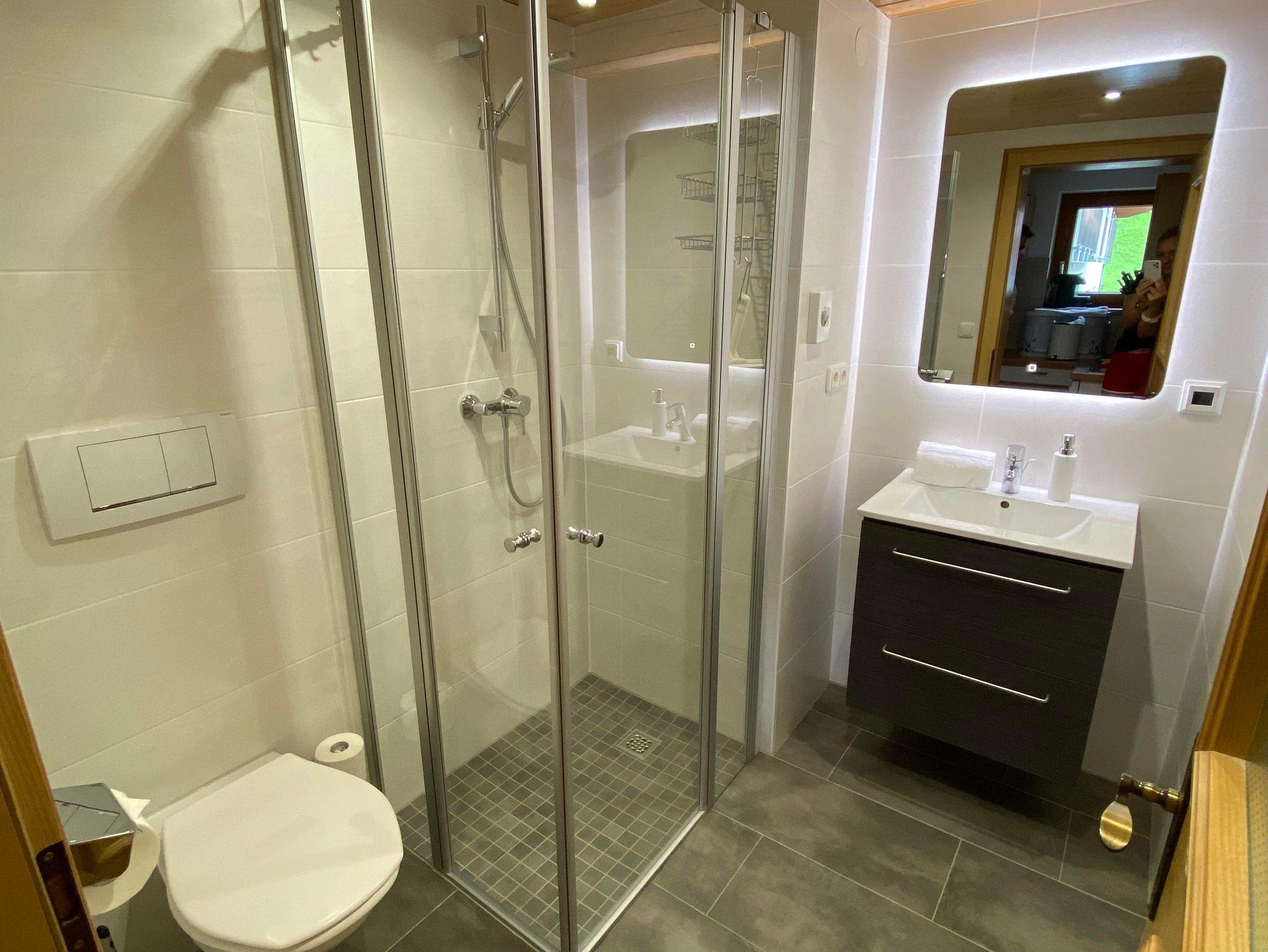 Komplett neu renovierte Wohnung im Landhausstil. 55 m² Appartement mit Schlafzimmer (Doppelbett) sowie Wohnzimmer mit großer Couch (ausziehbar als Schlafcouch für 2 weitere Personen / Liegefläche 1,50 m x 2,50 m) und zwei Badezimmern mit Dusche/WC. Im Schlafzimmer befindet sich zusätzlich eine weitere Couch, die auch als Schlafcouch verwendet werden kann.