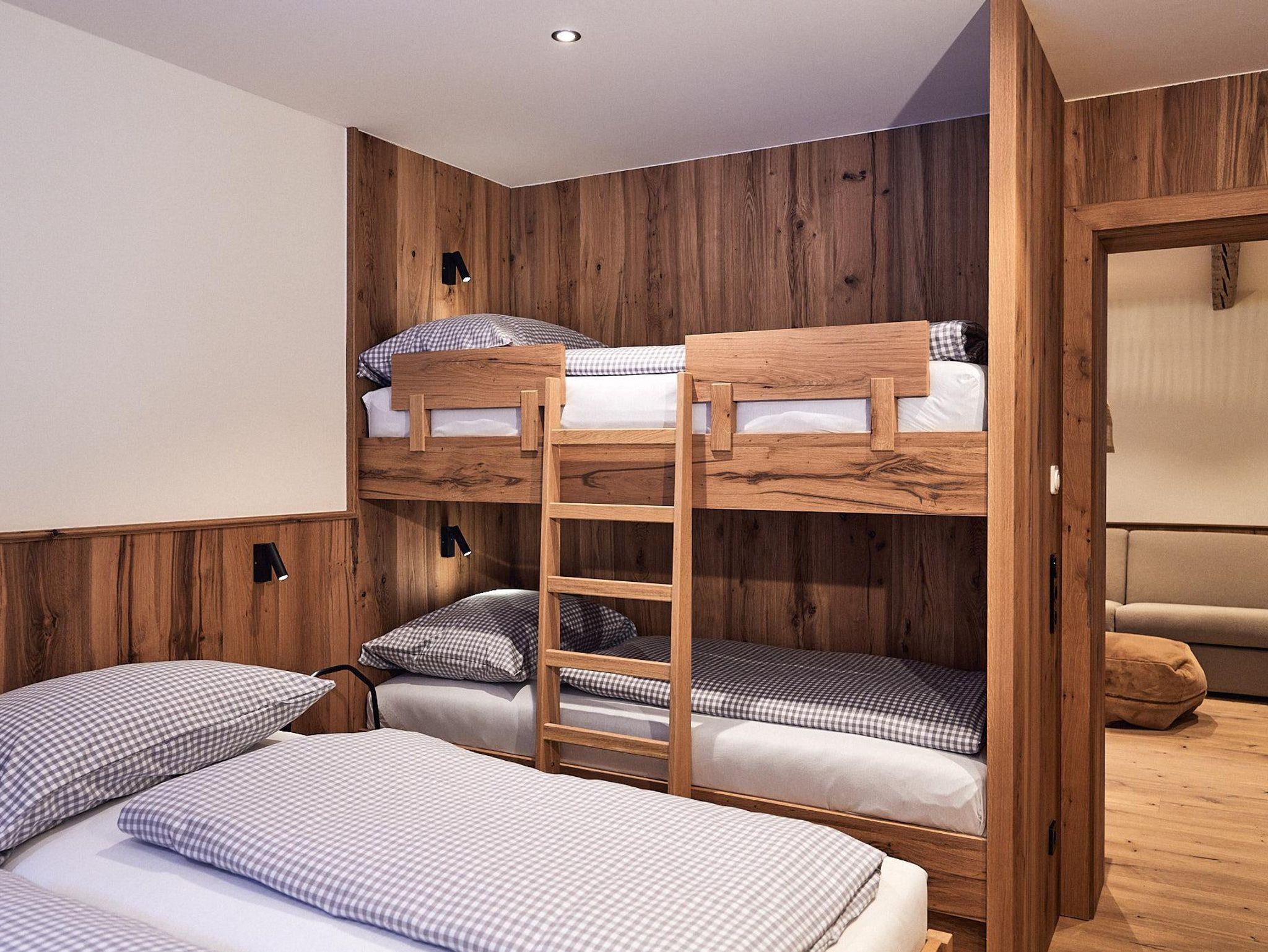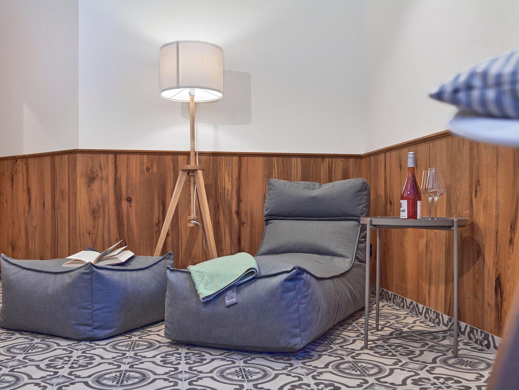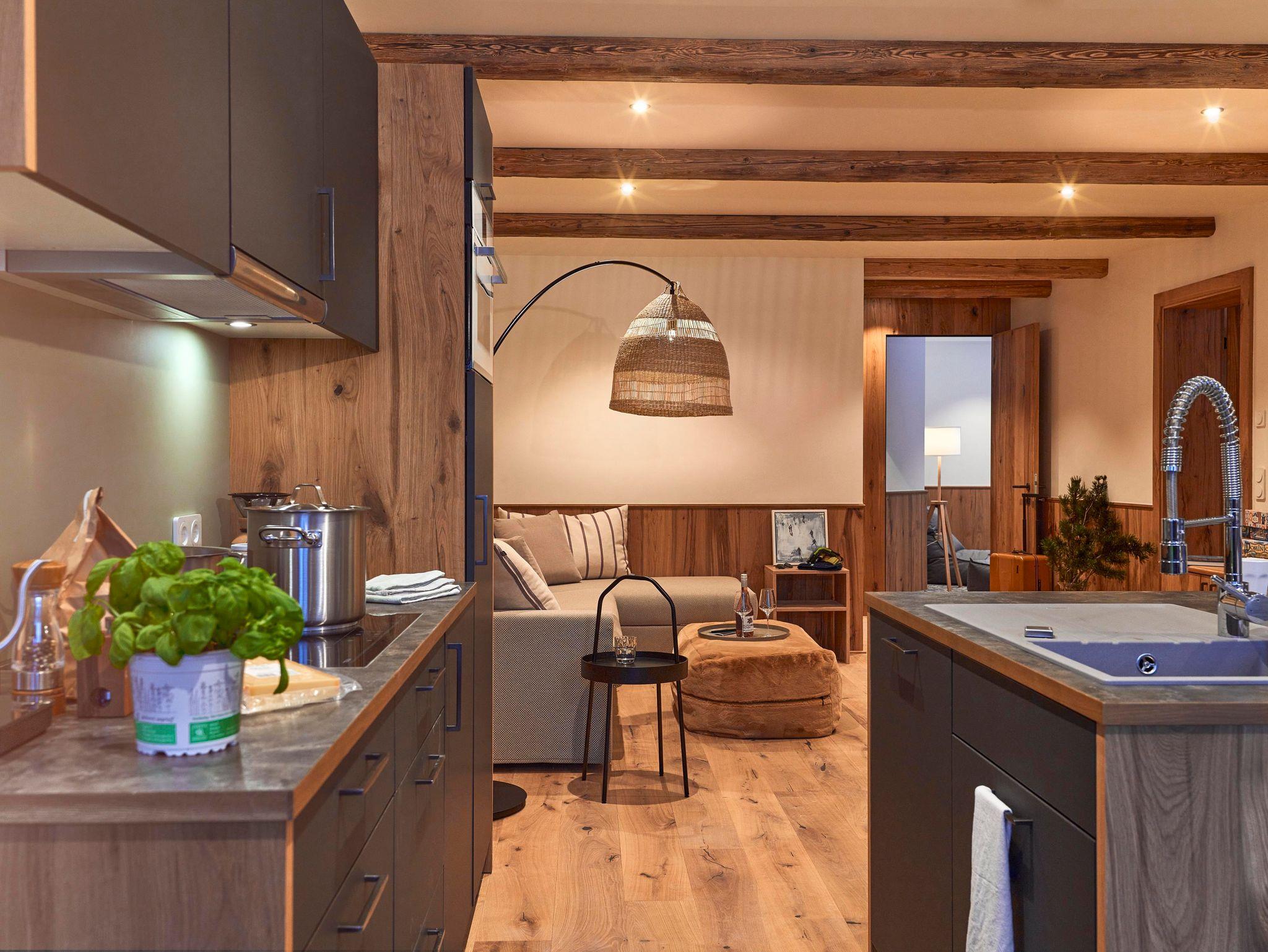 Auszeit – für bis zu acht Gäste - einfach perfektes Apartment mit Kamin und privatem Wellnessbereich: ein Schlafzimmer mit Doppelbett; ein Schlafzimmer mit Doppelbett und Etagenbett; jeweils mit Dusche/WC. Top ausgestattete Wohnküche mit vier Cerankochfeldern, Geschirrspülmaschine, Backofen, Kaffeemaschine; sollte trotzdem was fehlen für die Zubereitung eines tollen Menüs: an der Rezeption gibt es fast alles zum Ausleihen! Auftischen am großzügigen Esstisch; Wohnbereich mit Kamin und Liegewiese, zwei Gäste können dort auch bequem schlafen; Wellnessbereich mit Sauna und sonniger Loggia mit Schiebefenster. Zwei Garagenplätze