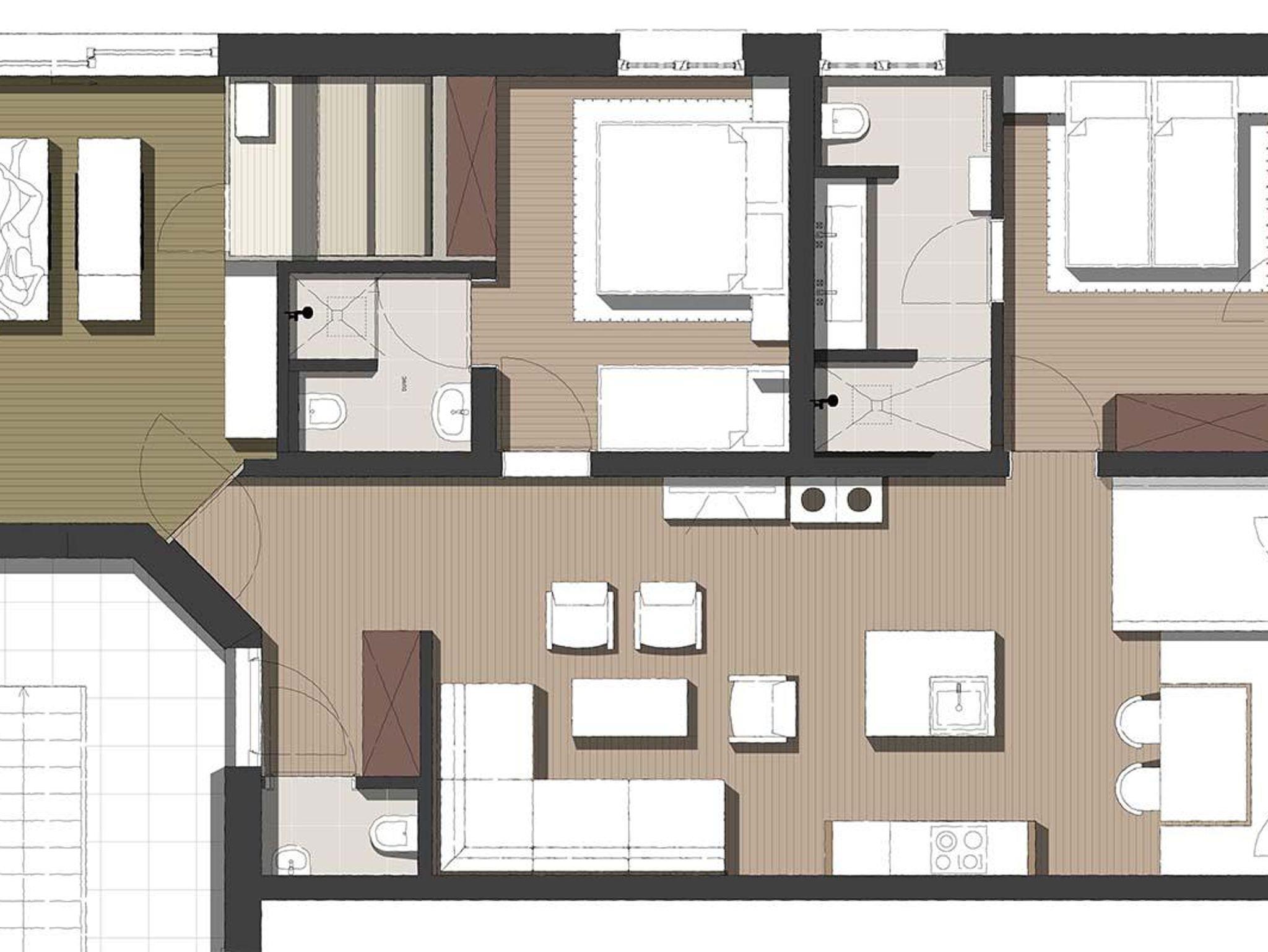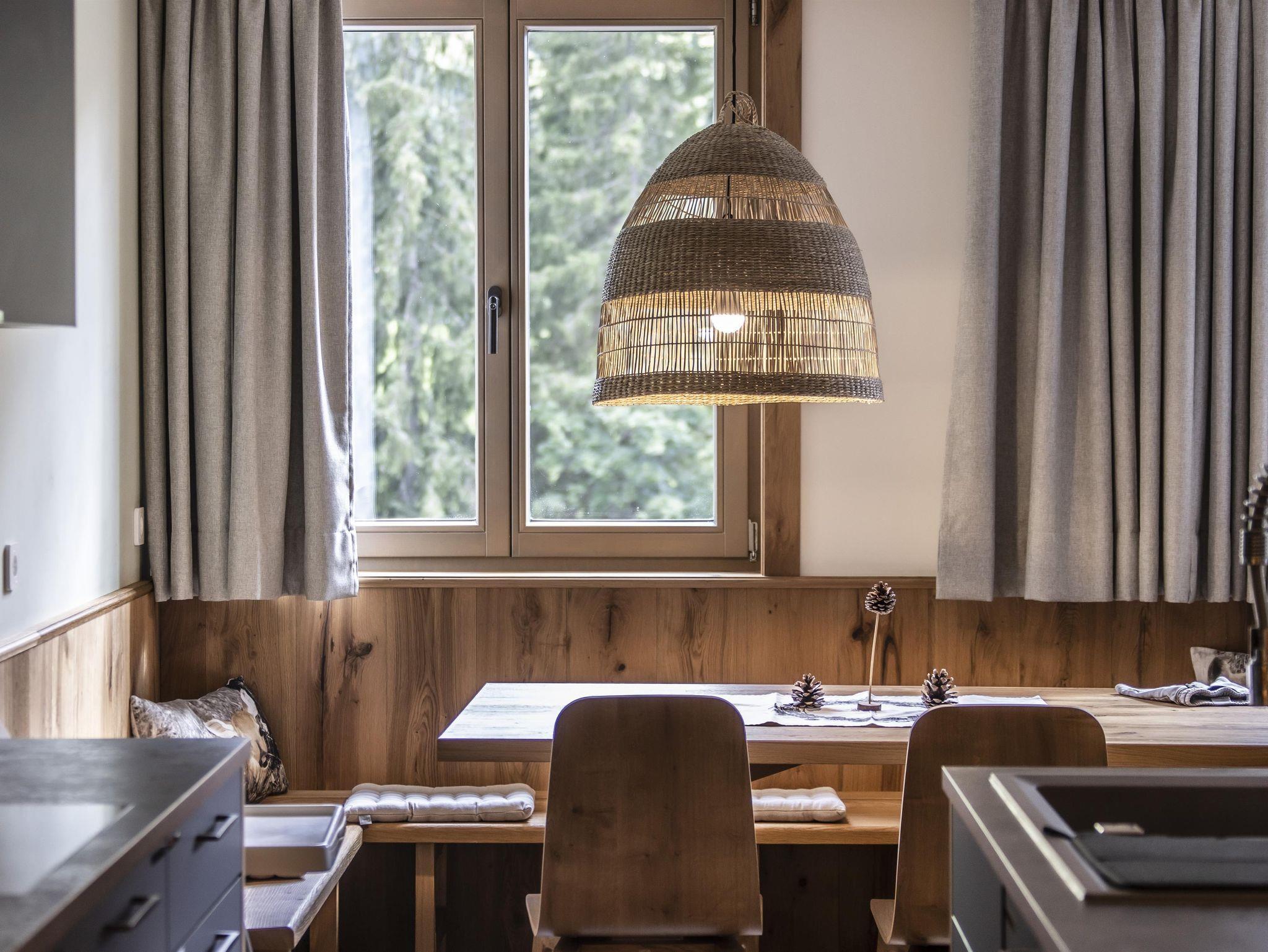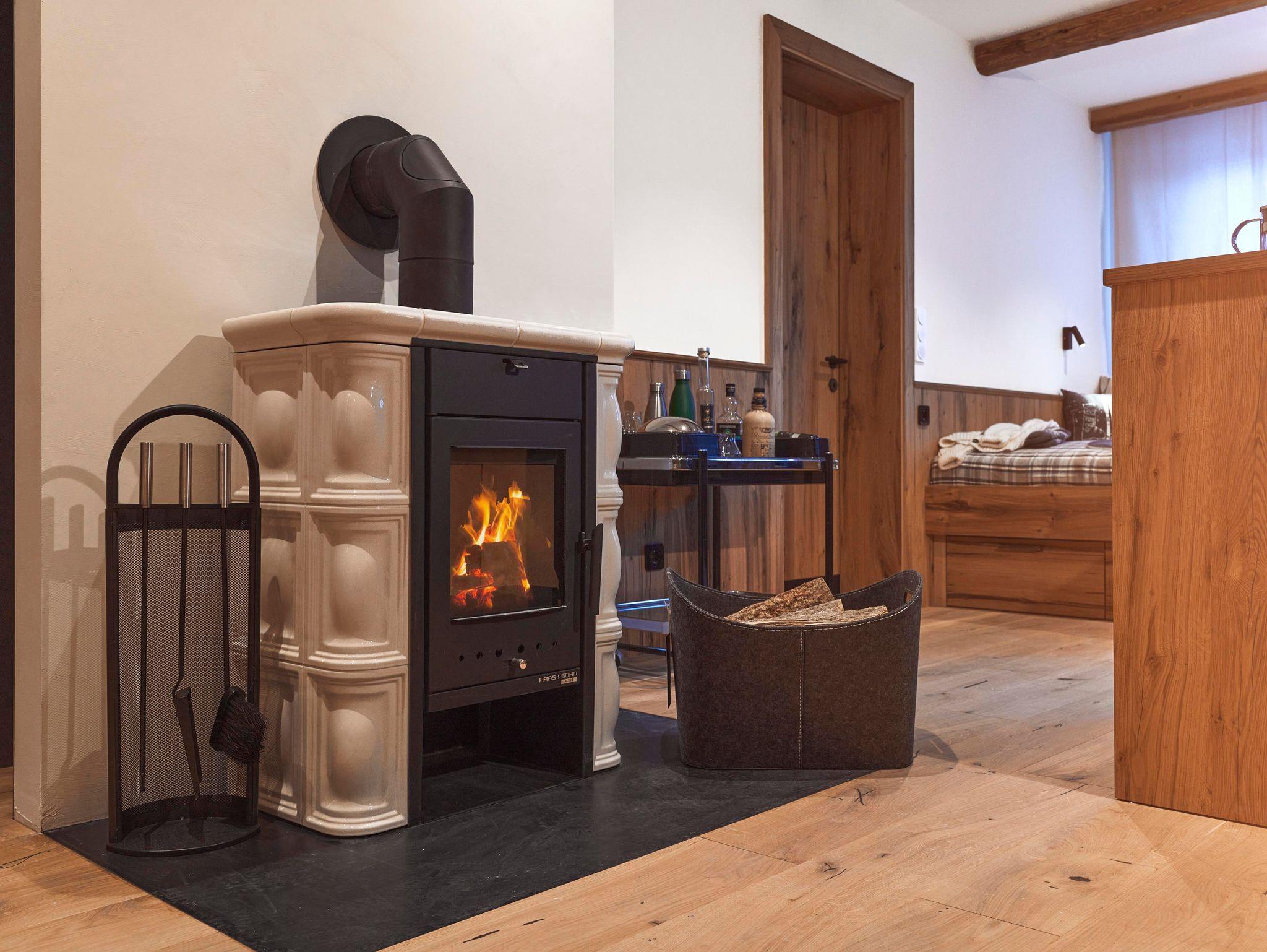 Auszeit – für bis zu acht Gäste - einfach perfektes Apartment mit Kamin und privatem Wellnessbereich: ein Schlafzimmer mit Doppelbett; ein Schlafzimmer mit Doppelbett und Etagenbett; jeweils mit Dusche/WC. Top ausgestattete Wohnküche mit vier Cerankochfeldern, Geschirrspülmaschine, Backofen, Kaffeemaschine; sollte trotzdem was fehlen für die Zubereitung eines tollen Menüs: an der Rezeption gibt es fast alles zum Ausleihen! Auftischen am großzügigen Esstisch; Wohnbereich mit Kamin und Liegewiese, zwei Gäste können dort auch bequem schlafen; Wellnessbereich mit Sauna und sonniger Loggia mit Schiebefenster. Zwei Garagenplätze