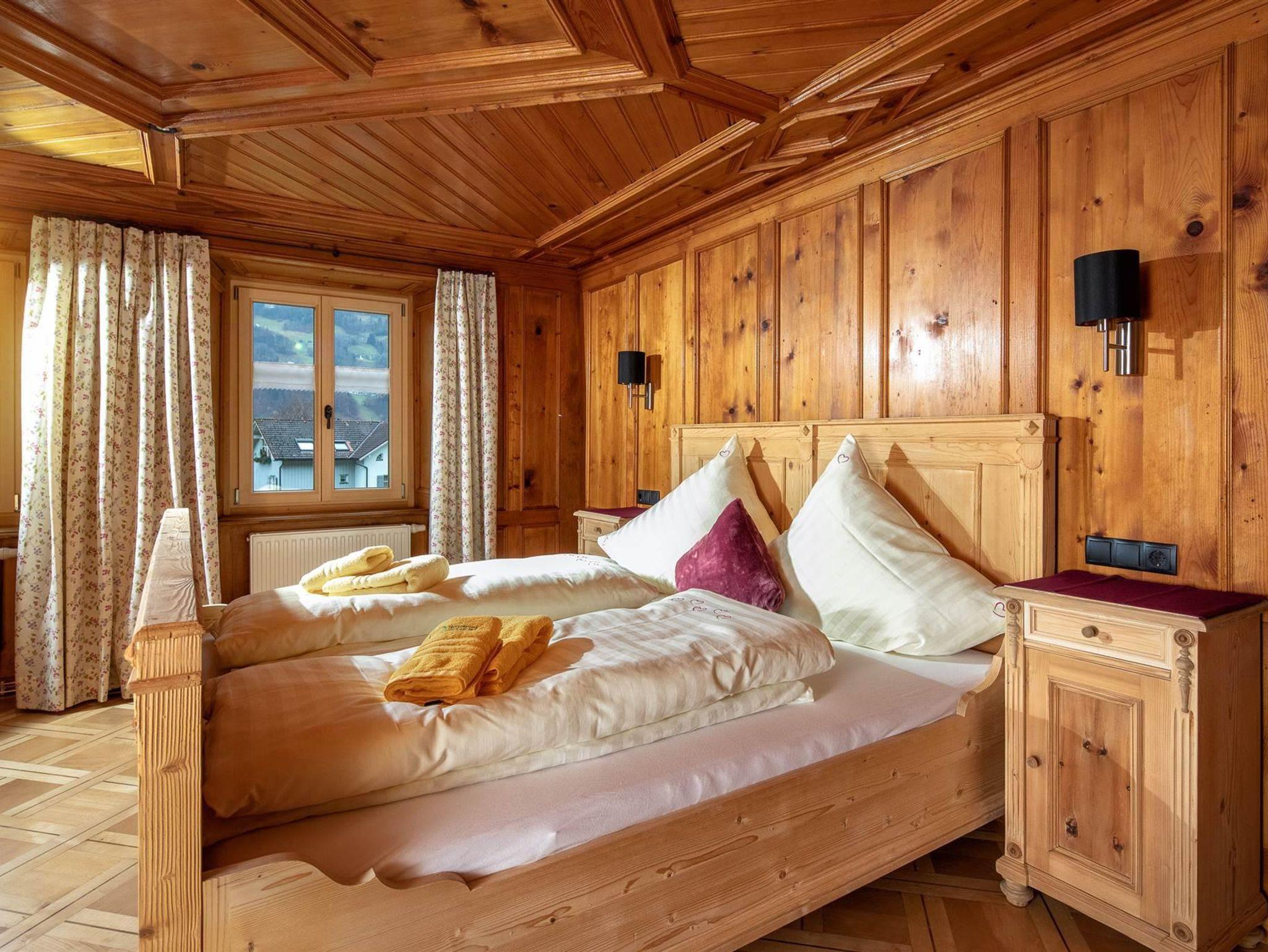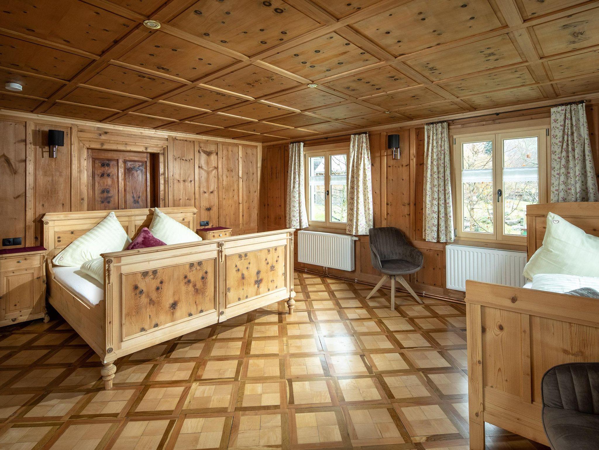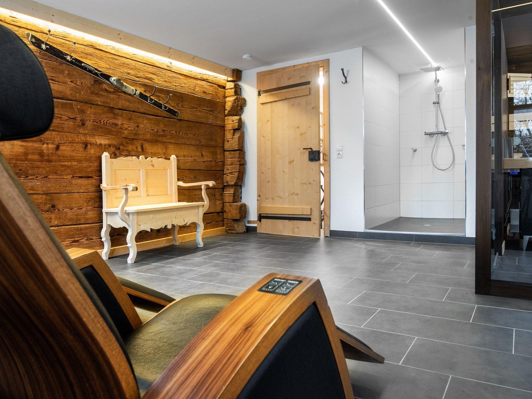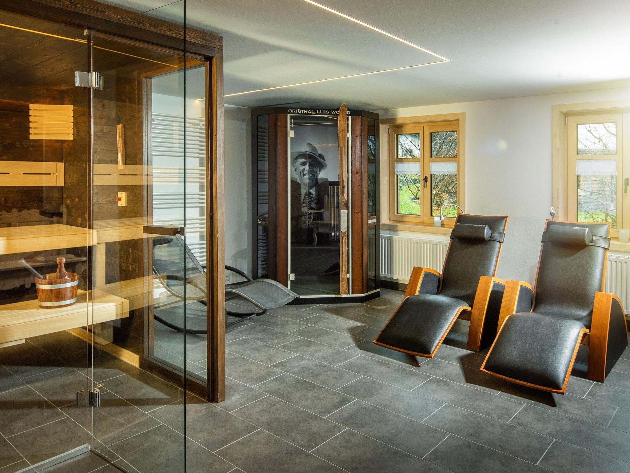 Ihr wohnt auf 2 Etagen, im EG findet Ihr die Küche, separates Esszimmer in einer Montafoner Stube mit TV, 2 Schlafzimmer mit Doppelbett, 1 Dusche/WC, Waschmaschine und 1 separates WC. Im OG befindet sich die Sauna & Infrarotkabine mit Dusche, Ruheraum, 1 Schlafzimmer mit Doppelbett, 2 Schlafzimmer mit je 1 Doppelbett und 1 Einzelbett, 1 Dusche/WC, 1 separates WC und 1 Lesezimmer mit TV und Couch.