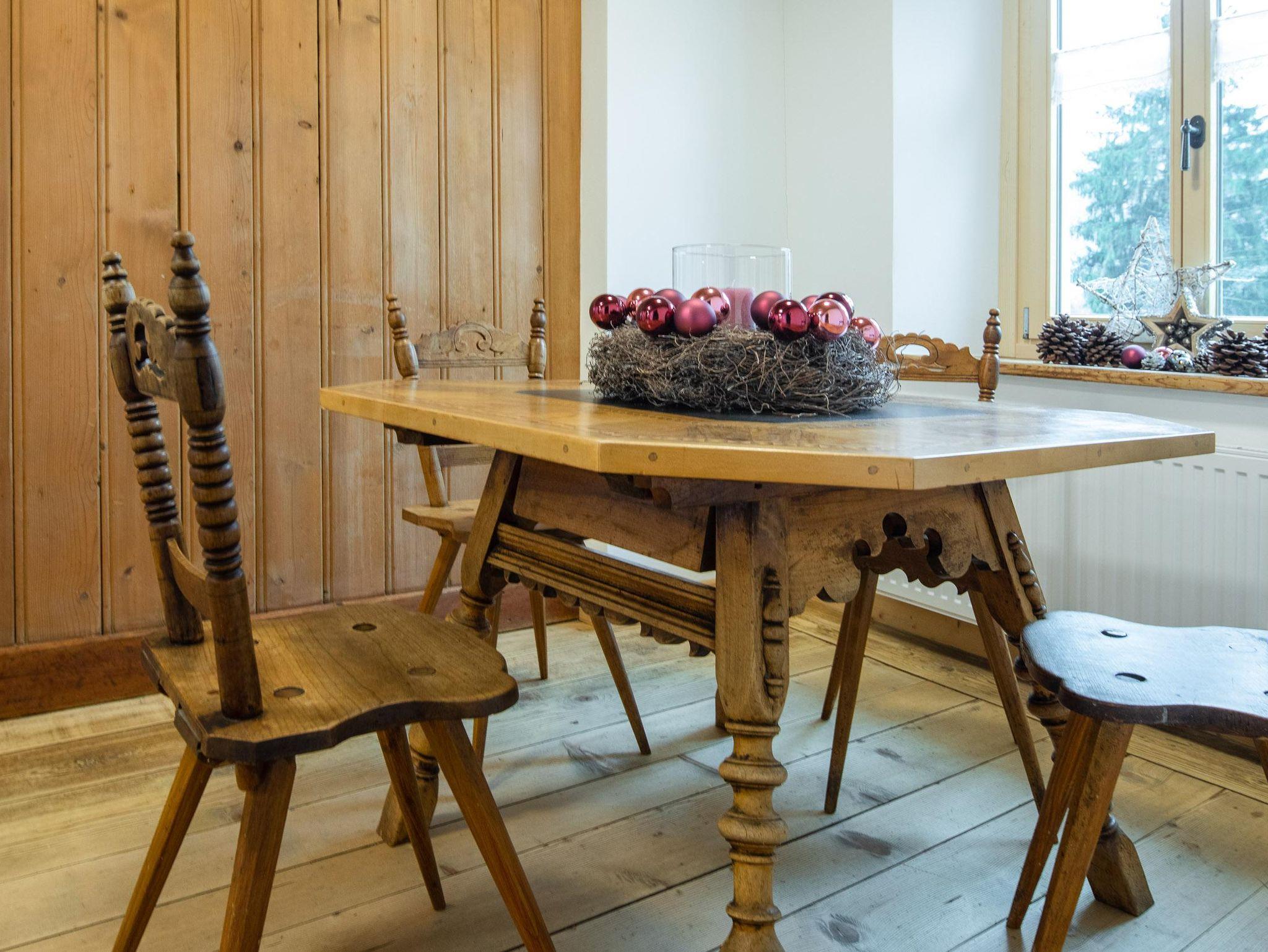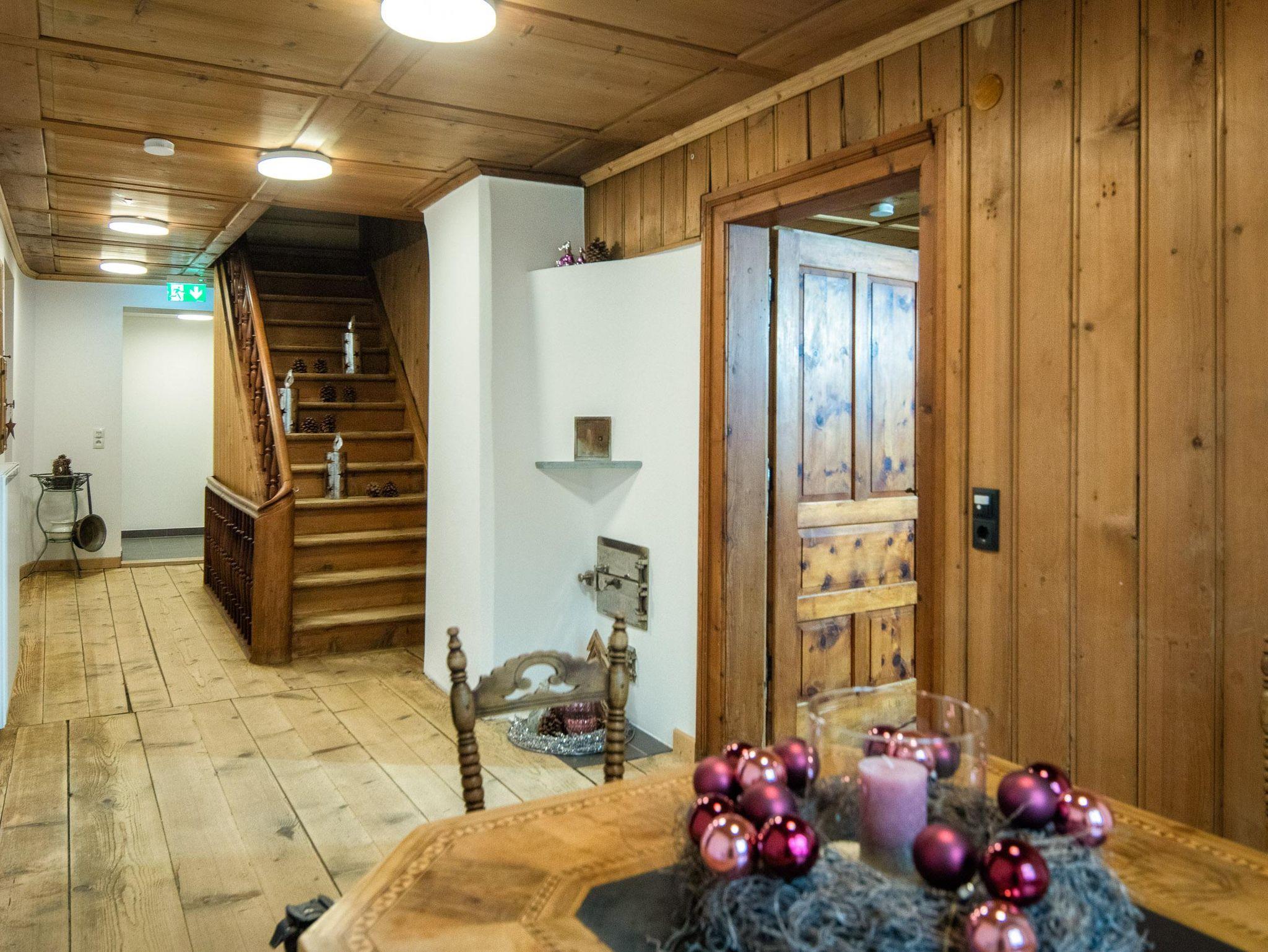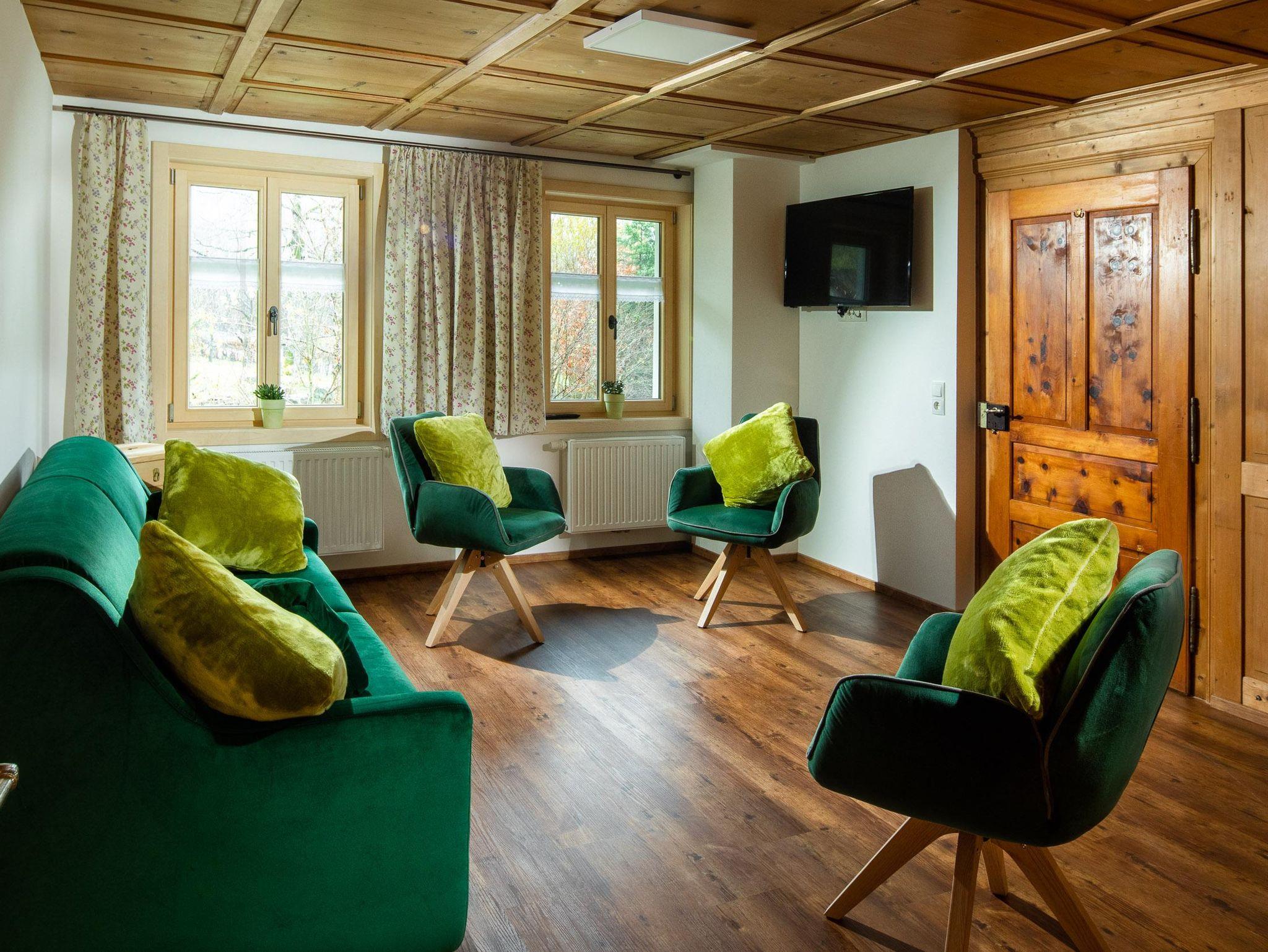 Ihr wohnt auf 2 Etagen, im EG findet Ihr die Küche, separates Esszimmer in einer Montafoner Stube mit TV, 2 Schlafzimmer mit Doppelbett, 1 Dusche/WC, Waschmaschine und 1 separates WC. Im OG befindet sich die Sauna & Infrarotkabine mit Dusche, Ruheraum, 1 Schlafzimmer mit Doppelbett, 2 Schlafzimmer mit je 1 Doppelbett und 1 Einzelbett, 1 Dusche/WC, 1 separates WC und 1 Lesezimmer mit TV und Couch.