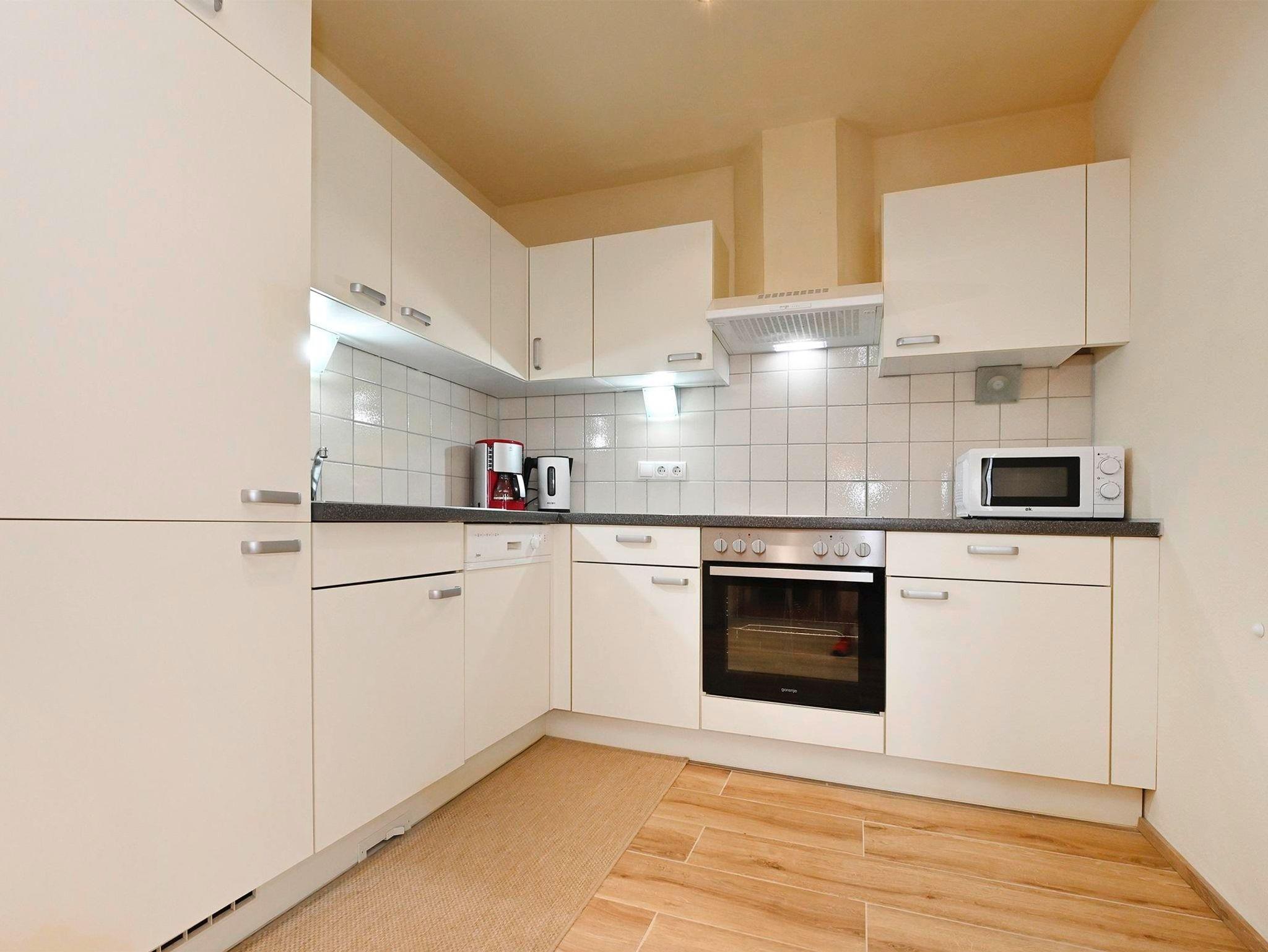 • Küche mit Geschirrspüler, Kühlschrank, Tiefkühlfach, Mikrowelle, Wasserkocher, Toaster