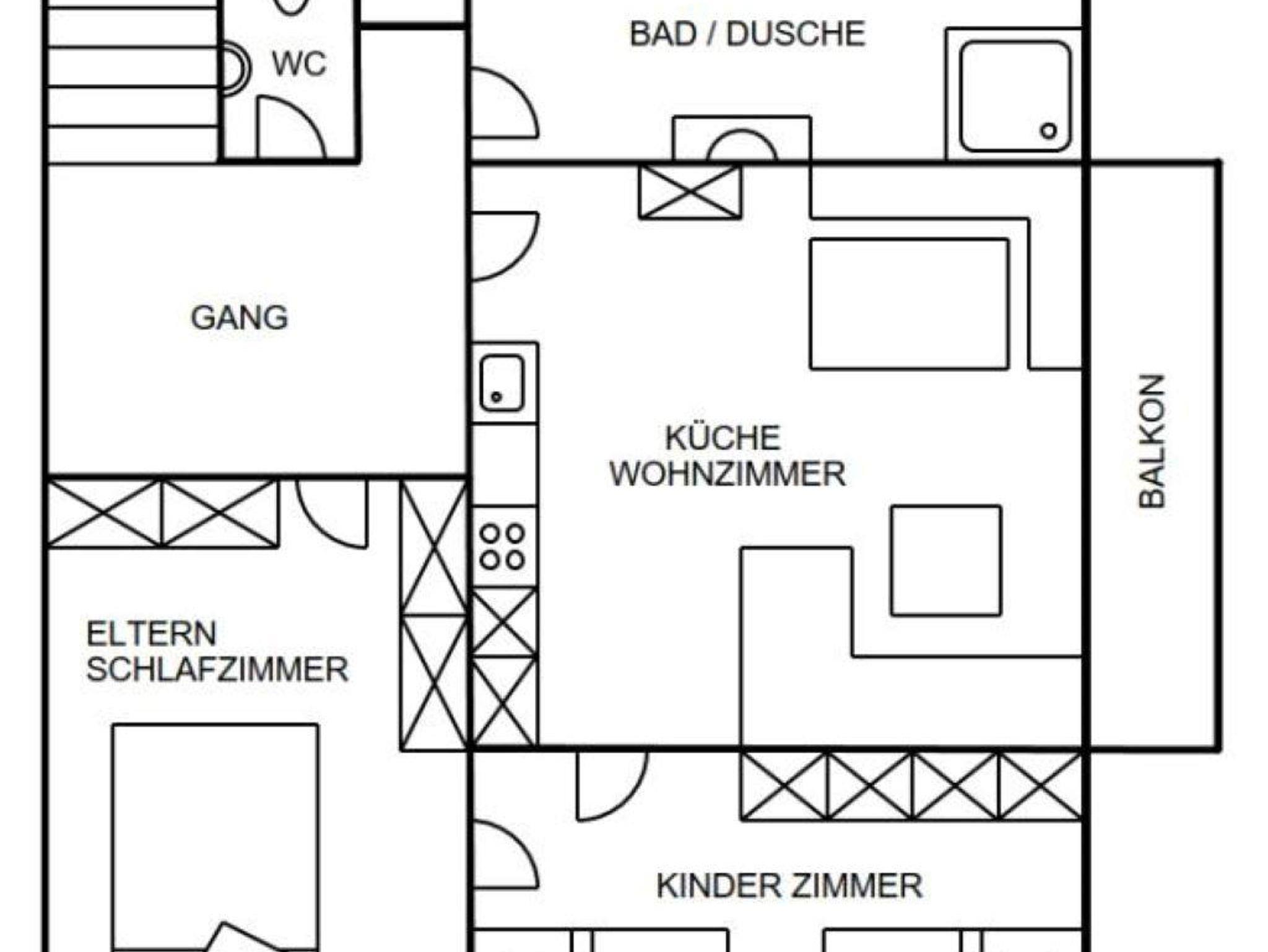 • 1 Dreibettzimmer, 1 Doppelzimmer, 1 Einzelzimmer, Wohnküche, Badezimmer, Dusche, WC