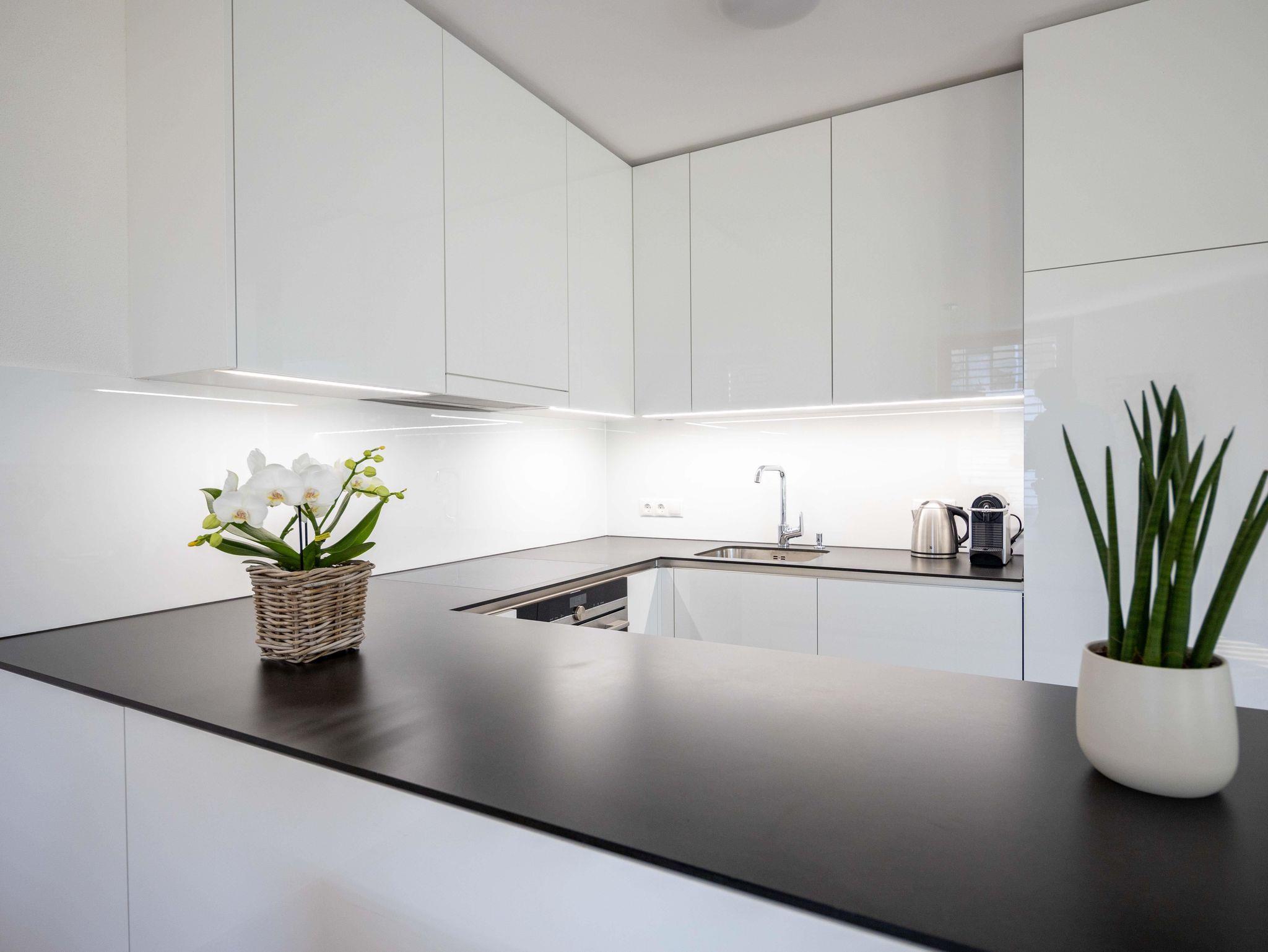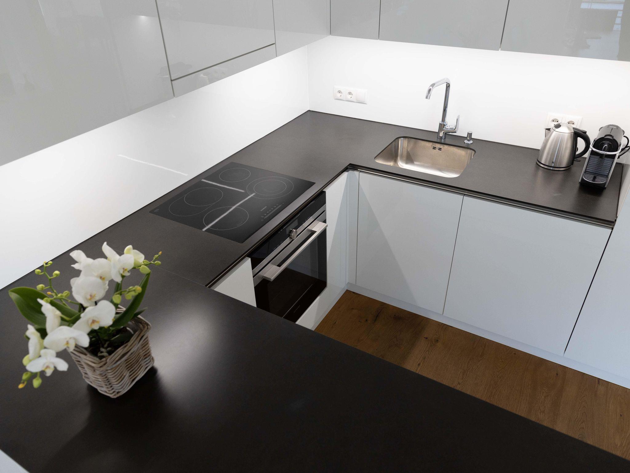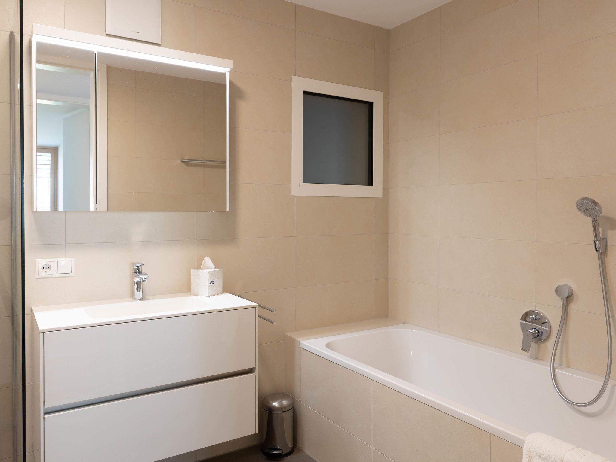 Wohnküche mit Geschirrspülmaschine, Kühlschrank, Kaffeemaschine, Gefriermöglichkeit, Elektroherd mit Backofen & Mikrowelle, Dunstabzug, etc., großzügiges Badezimmer mit Dusche, Badewanne, WC extra