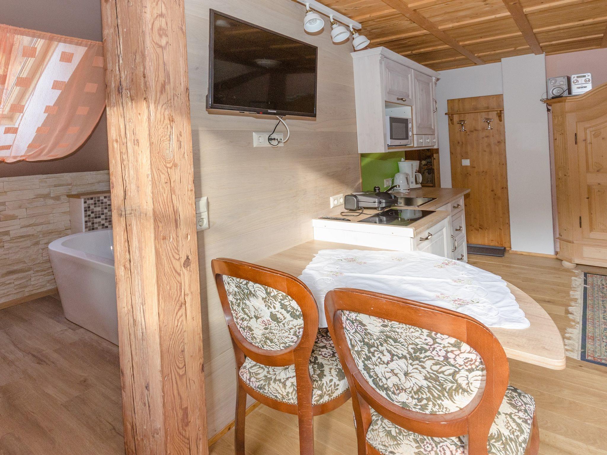 Die ideale Unterkunft für eine Skitour am Geisenberg oder für ausgiebiges Wandern im Pielachtal sowie um sich einfach mal zurückzuziehen. Absolut ruhig gelegen in Schwarzenbach im Pielachtal, ist unser Appartement Spitzkogel-Blick. Das gemütliche Zimmer ist mit einer Küchenzeile, Esstisch und einem Sofa mit Fernseher ausgestattet. Die Küchenzeile ist voll ausgestattet unter anderem mit Mikrowelle, Wasserkocher, Kaffeemaschine und Kühlschrank. Das offengestaltete Appartement verfügt über ein Doppelbett, ein Badezimmer mit Dusche und WC sowie einer Badewanne im offenen Wohnbereich. Bei einer Buchung mit 4 Personen steht das Sofa als Schlafmöglichkeit zur Verfügung. WLAN und Parkplatz stehen kostenfrei zur Verfügung.
