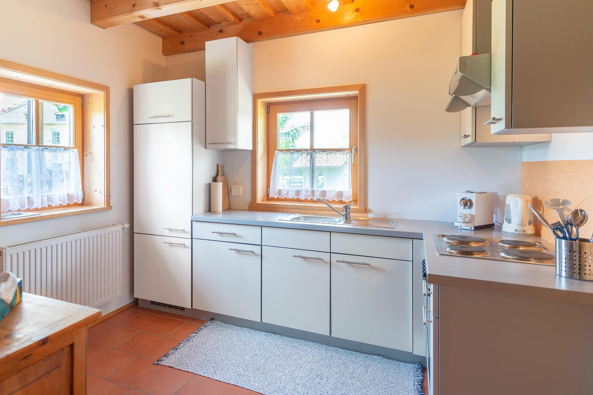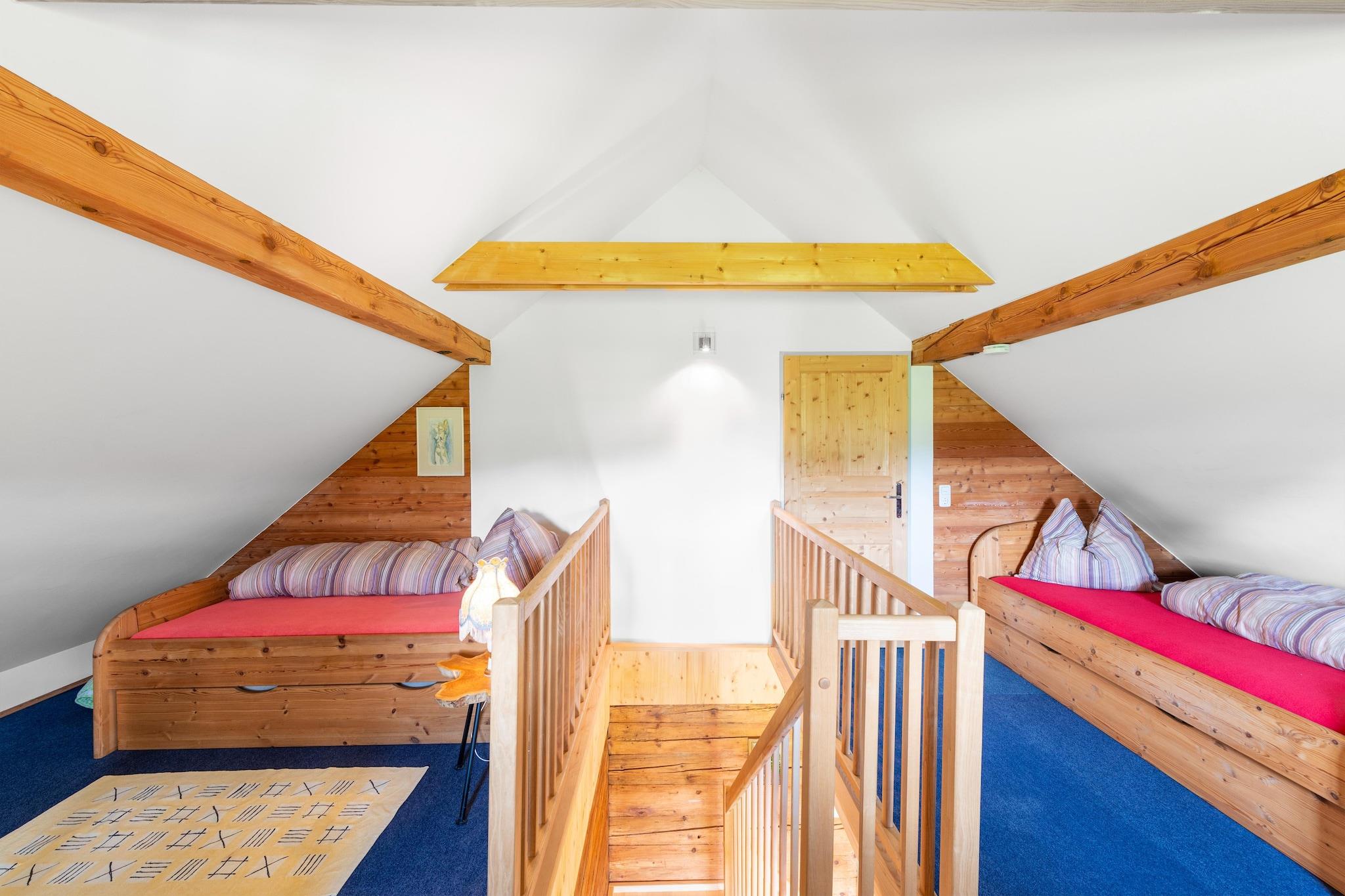 Velkommen til vores hyggelige bjerghytte i Schwarzenberg am Böhmerwald, perfekt til 4-6 gæster, der søger et fredeligt tilbagetog i naturen. Hytten har to soveværelser, en stue med fladskærms-tv, et fuldt udstyret køkken med køleskab og ovn samt et badeværelse med bruser. Håndklæder og sengelinned er inkluderet, hvilket sikrer et behageligt ophold. Træd ud på terrassen for at nyde den smukke udsigt over bjergene, slap af ved den private naturlige badeplads, eller lad børnene lege sikkert på legepladsen på stedet. Gratis privat parkering, en restaurant på stedet og en pengeautomat gør dit ophold endnu mere bekvemt. Beliggenheden er ideel året rundt til udendørs aktiviteter. Om vinteren ligger Bergland-skiliften kun 1 km derfra, og Schwarzenbergbahn-skiområdet ligger 2 km derfra og tilbyder præparerede pister for begyndere og øvede skiløbere. Langrendsløjper findes også i nærheden. Om sommeren kan du udforske de omkringliggende søer, hvor du kan svømme, sejle eller slappe af ved bredden, eller nyde vandreture og cykling gennem naturskønne stier. Der er mulighed for at leje ski og snowboard i hytten, hvilket gør den til et perfekt udgangspunkt for både vintersportsentusiaster og sommereventyrere.