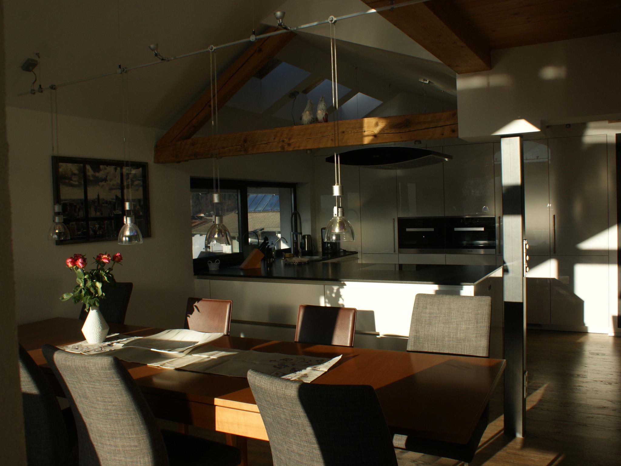 Unsere große Ferienwohnung mit 3 Schlafzimmern ist sehr flexibel nutzbar und überzeugt mit einer modernen, hochwertigen Wohnküche, die perfekt für Familien und Gruppen ist. Der beste WLAN-Zugang stellt sicher, dass Sie während Ihres Aufenthalts verbunden bleiben, sei es für Arbeit oder Spaß. Genießen Sie Ihre Abende am Gemütlichen Kachelofen und entspannen Sie auf der Sonnenterrasse mit Blick auf die idyllische Umgebung.