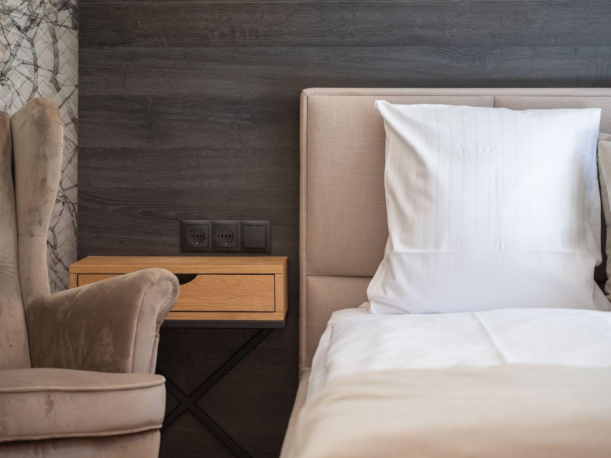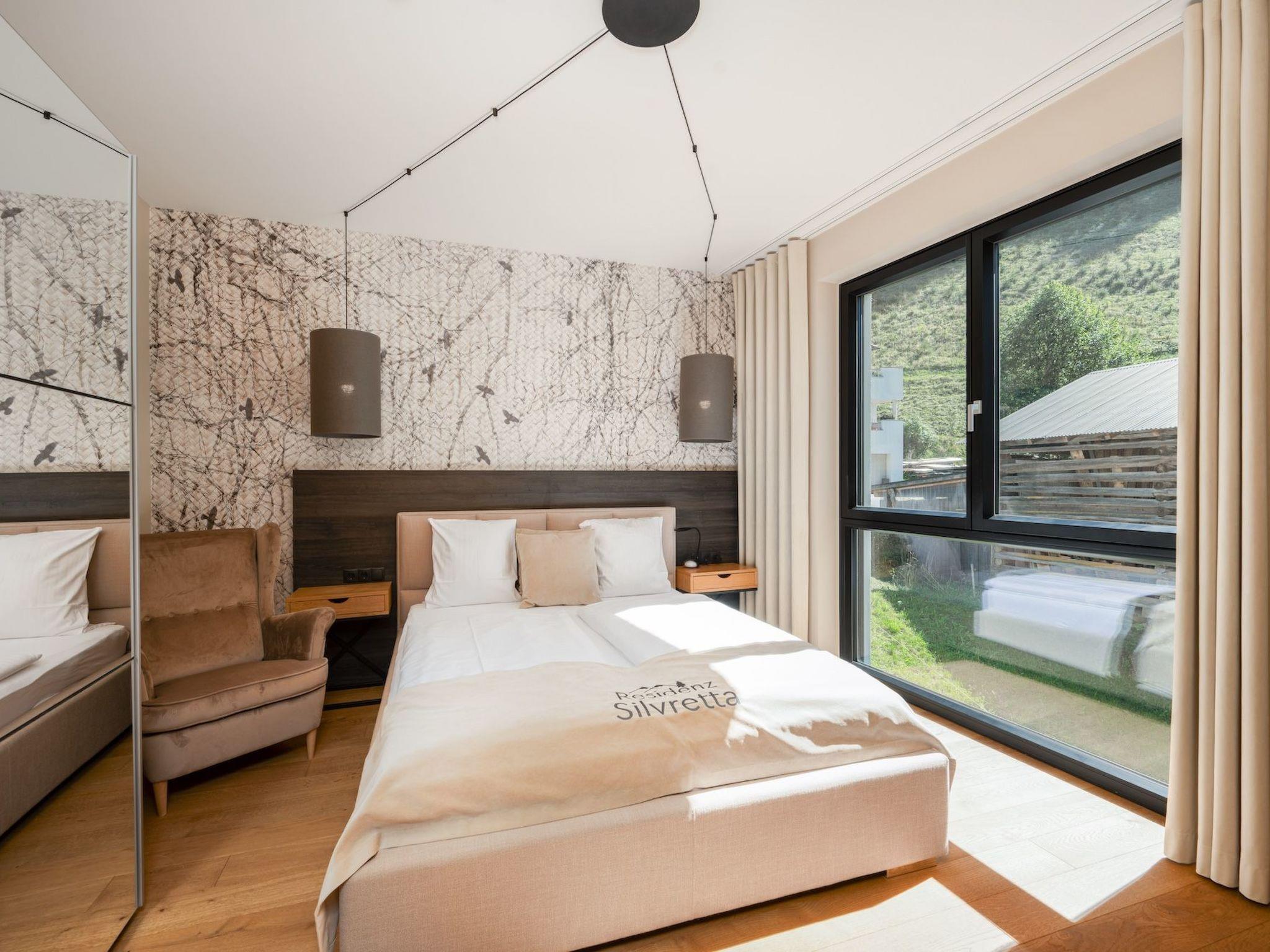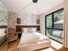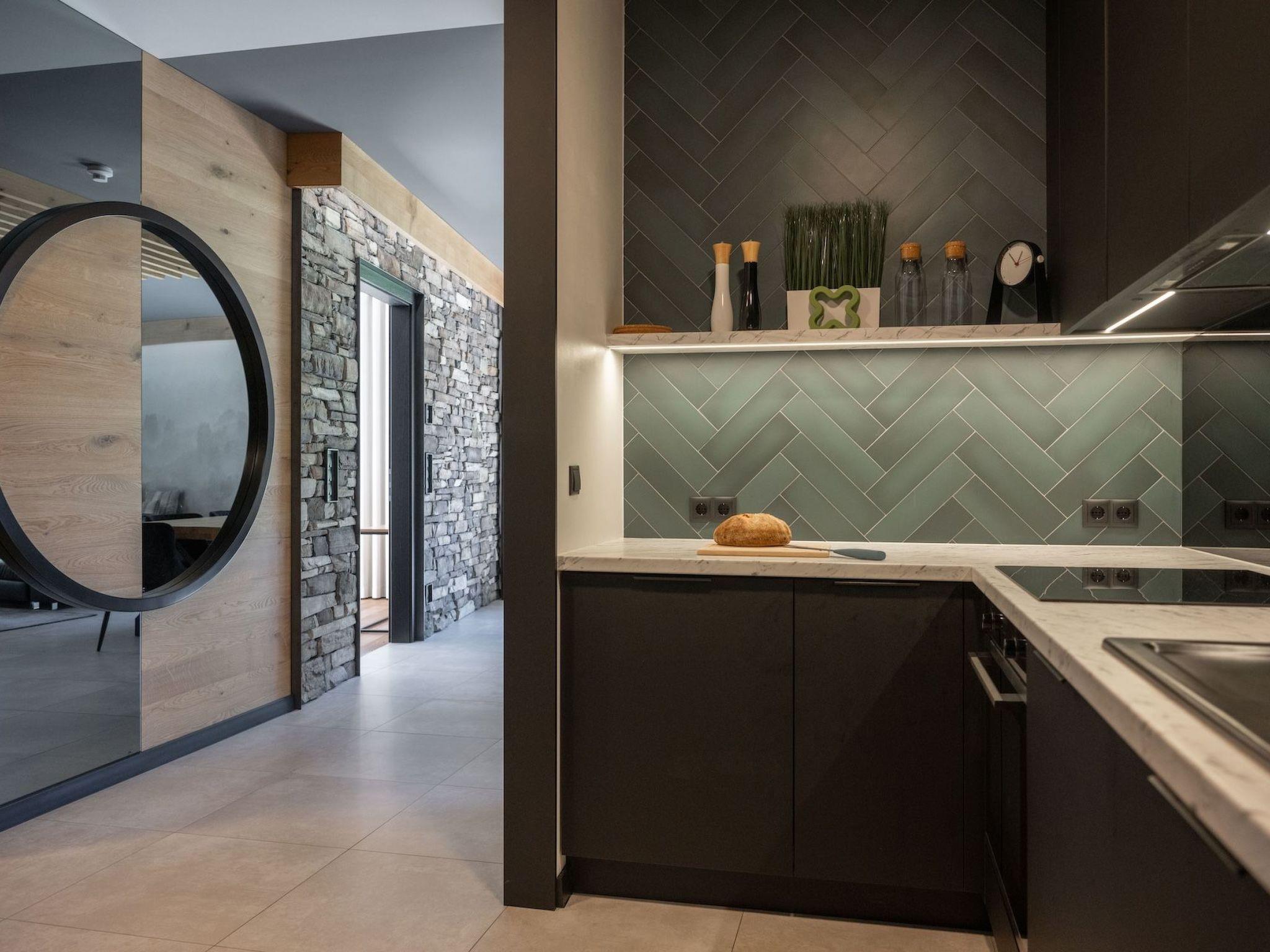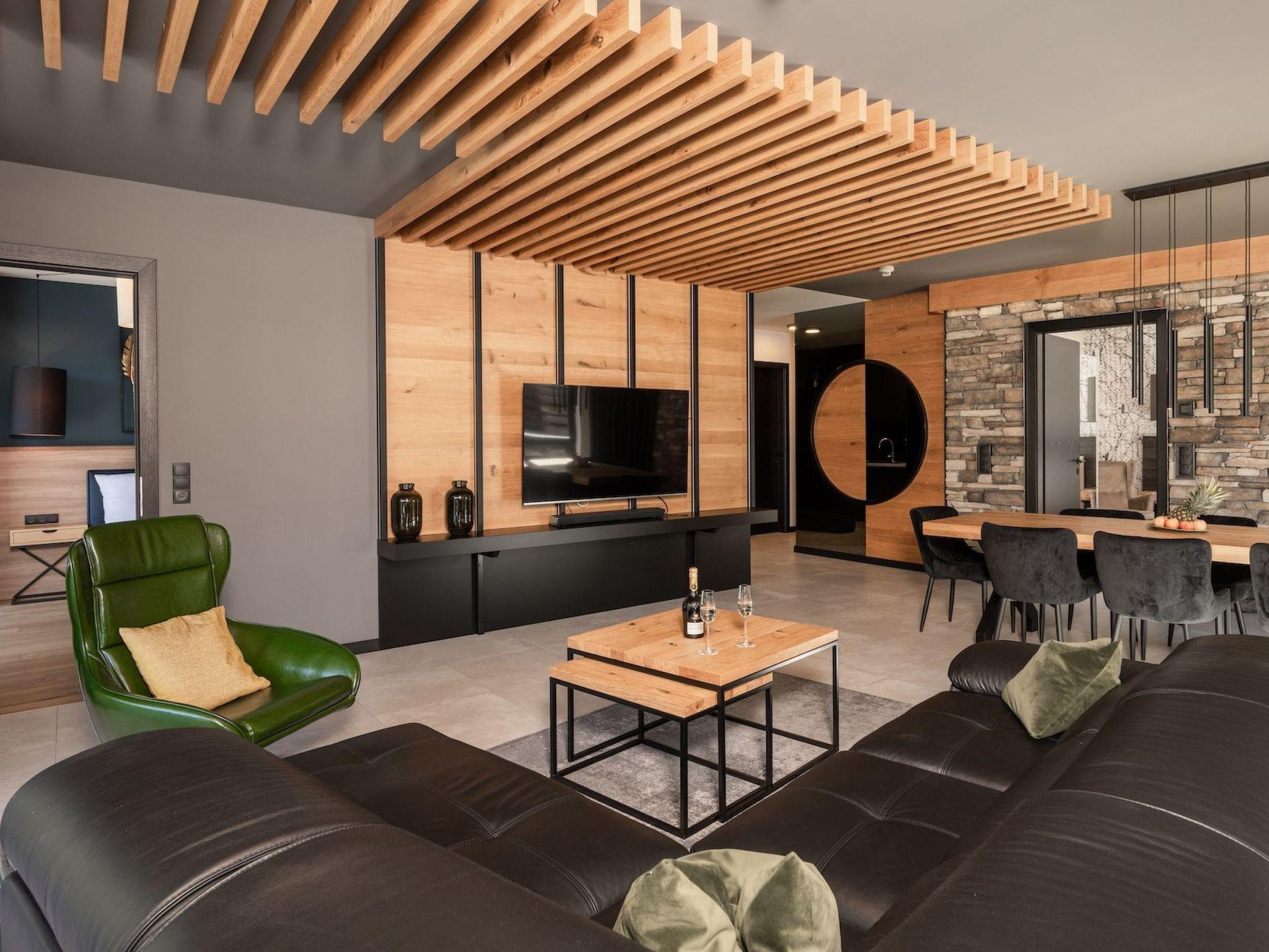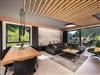 The spacious living area with a large L-shaped sofa and a stylish armchair is the perfect place to relax and enjoy the wonderful alpine atmosphere. The living area flows into the spacious dining area, where the tables can seat up to eight guests on comfortable chairs. The elegant, modern kitchen is fully equipped and offers everything you need to prepare meals for your family and friends.