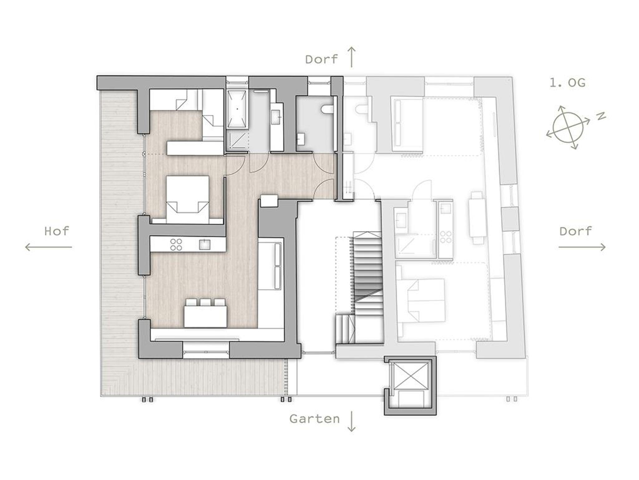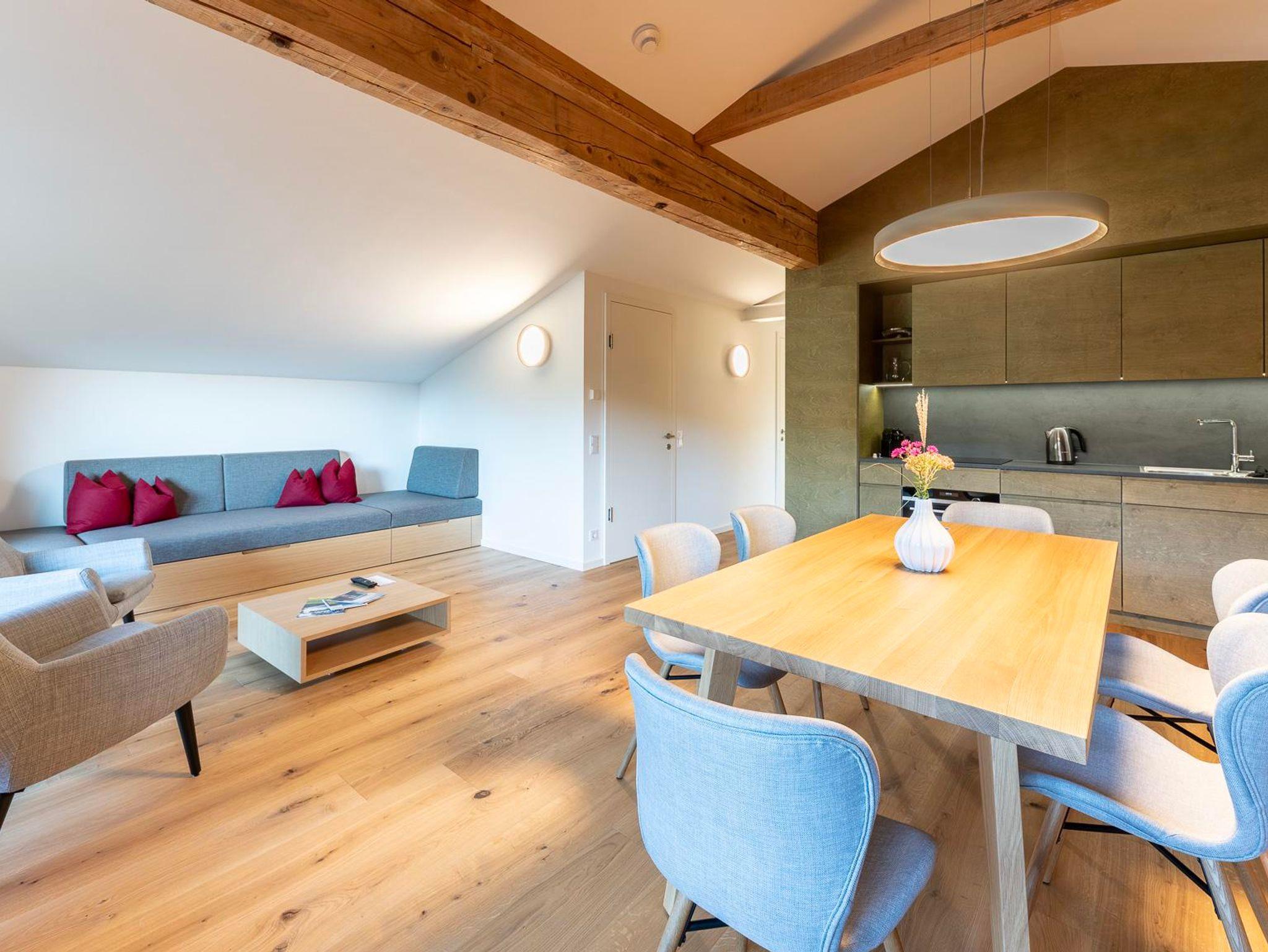 Sicher auch deshalb, weil in ihnen unsere Liebe fürs gutes Wohnen zu spüren ist – überlegt mit Herz und Hirn und ausgeführt mit den besten Handwerkern der Region. Denn, so sind wir überzeugt: Proportionen, Materialien und auch Funktionalität wirken auf Körper, Geist und Seele. Eines haben unsere Ferienwohnungen alle gemein: Vollholz- möbel, Holzböden, klare Linien, und die Ausrichtung aller Zimmer zum Dorf oder in den Garten.