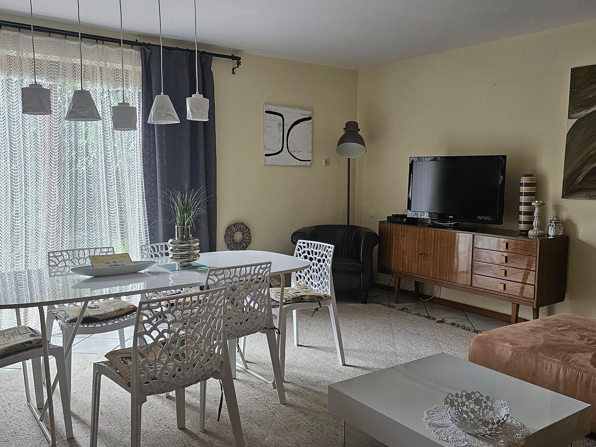 Vorraum, Dusche, WC, 2 Schlafzimmer (1x Doppelbett, 1x zwei Einzelbetten), Wohn-Esszimmer mit ausziehbarem Sofa und Kitchenette