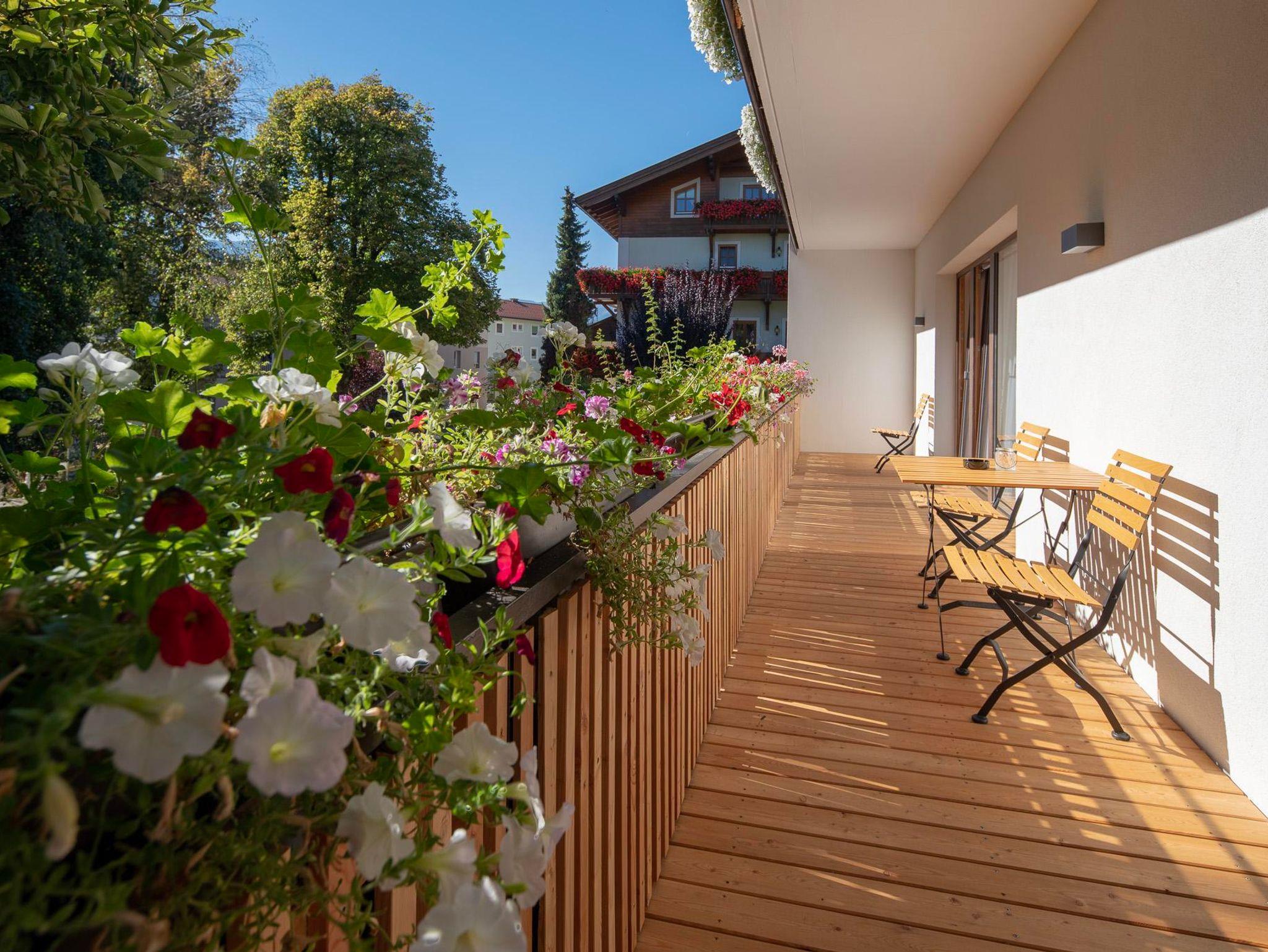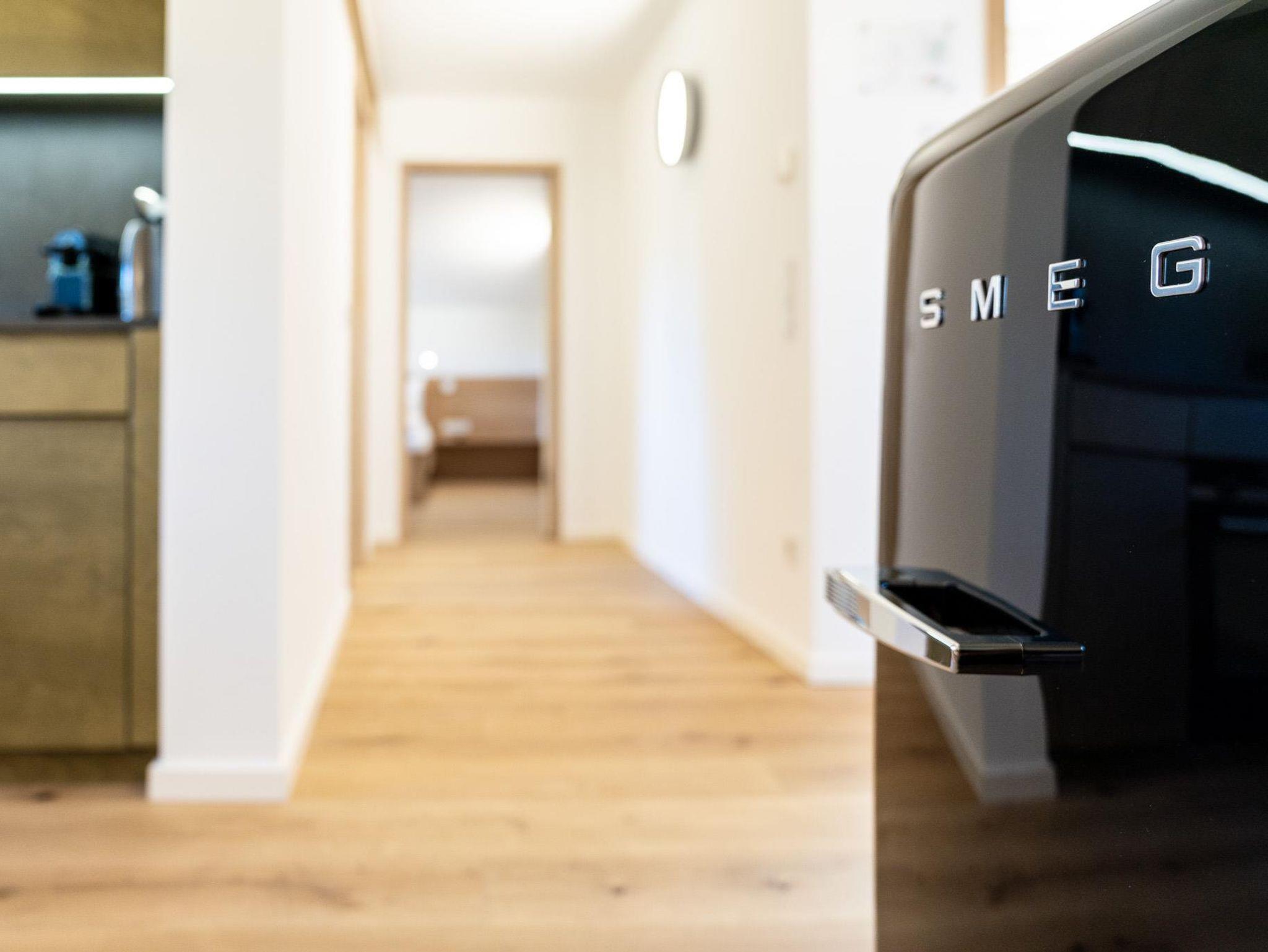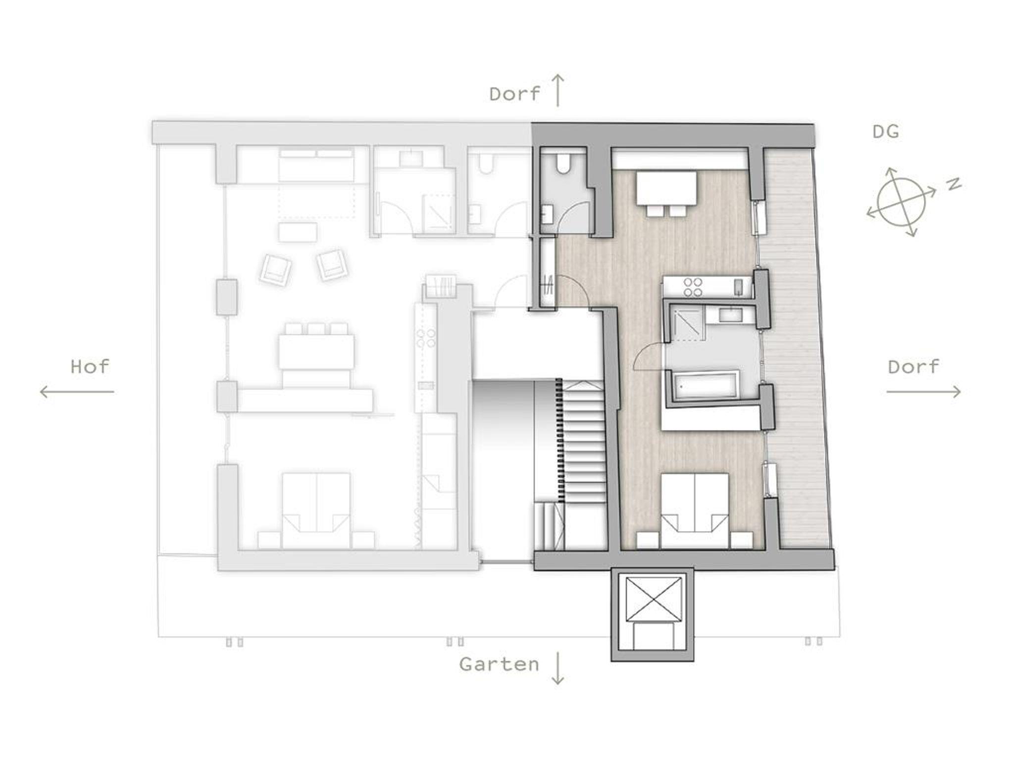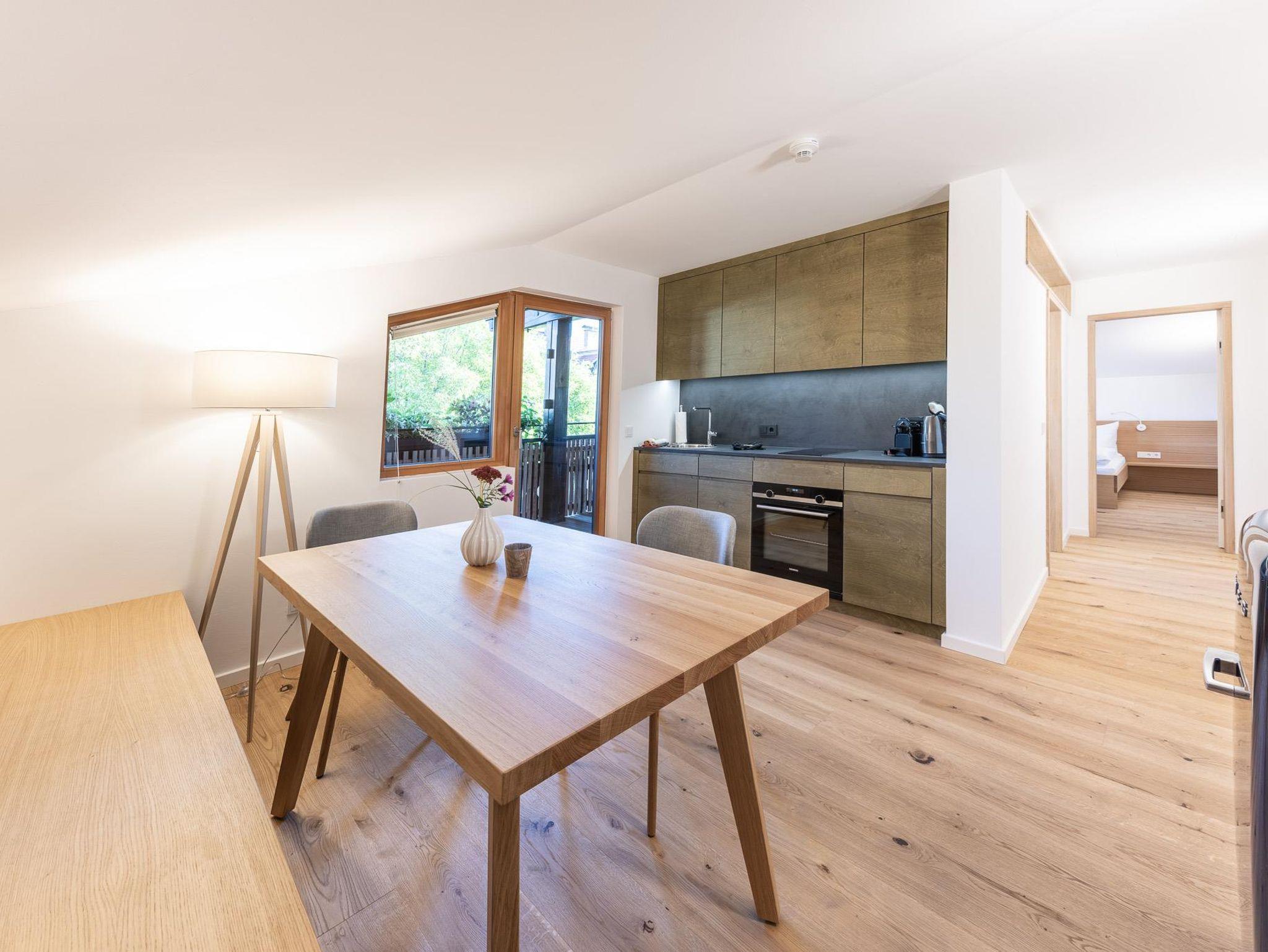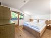 Klein aber fein – zum Appartement Rudolf im Dachgeschoss gelangt man mit dem Lift (bis zum 2.OG) und dann über ein paar letzte Stufen unters Dach. Mit dem großem Balkon, getrenntem Wohn- und Schlafraum, voll ausgestatteter Küche und einer Badewanne mit Blick auf die Berge ist dieses Appartement der ideale Ort für den Rückzug zu Zweit.