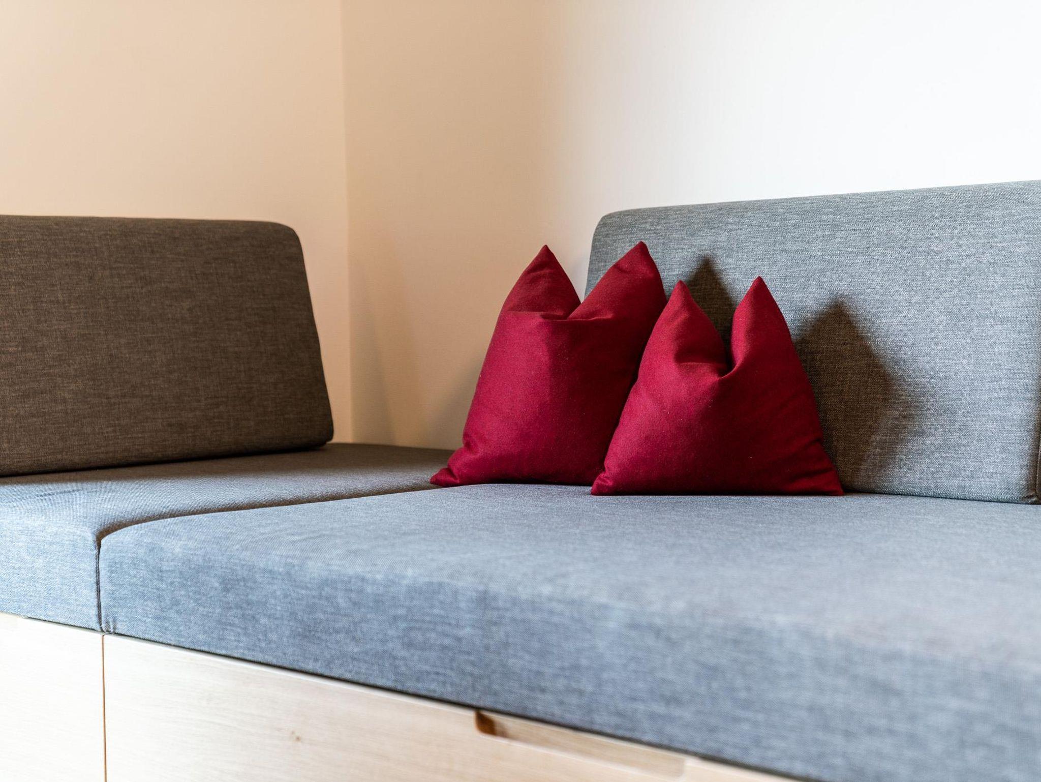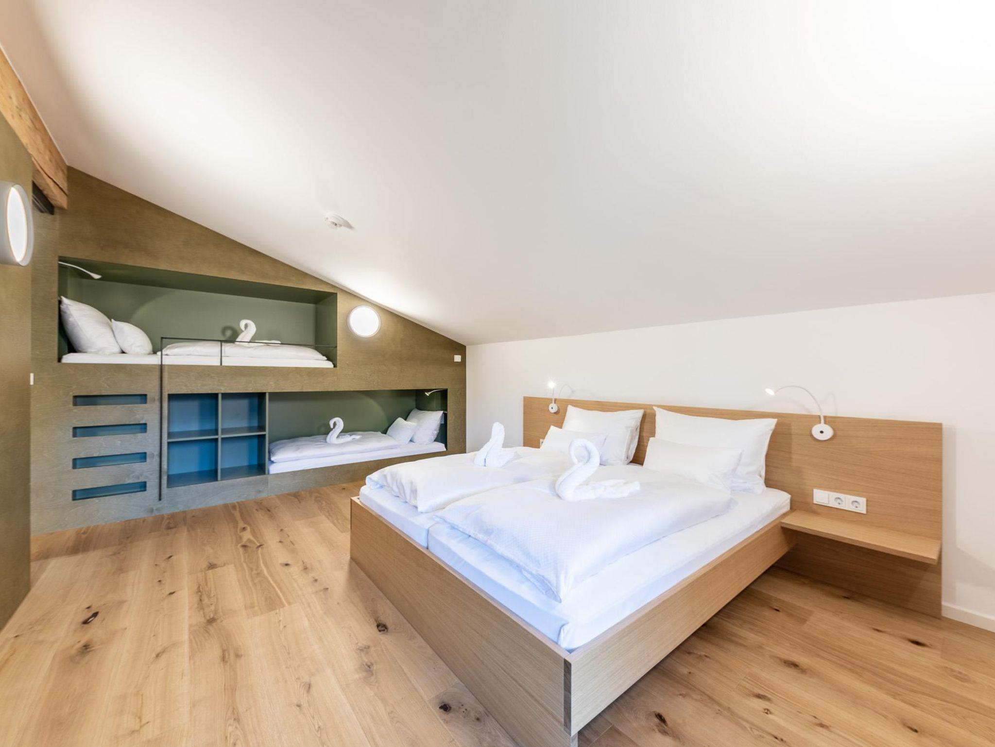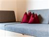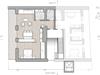 Zum Appartment Nuss im Dachgeschoss gelangt man mit dem Lift (bis zum 2. OG) und dann über ein paar letzte Stufen unters Dach. Die loftartigen Räume mit großzügigem Wohn- und Schlafraum sind mit großem Balkon Richtung Süden ausgerichtet. Ein Doppelbett, zwei Schlafkojen und ein Schlafsofa bieten bis zu sechs Personen Platz. Die Kochecke ist komplett bestückt mit allem was man zum gemütlichen Kochen braucht.