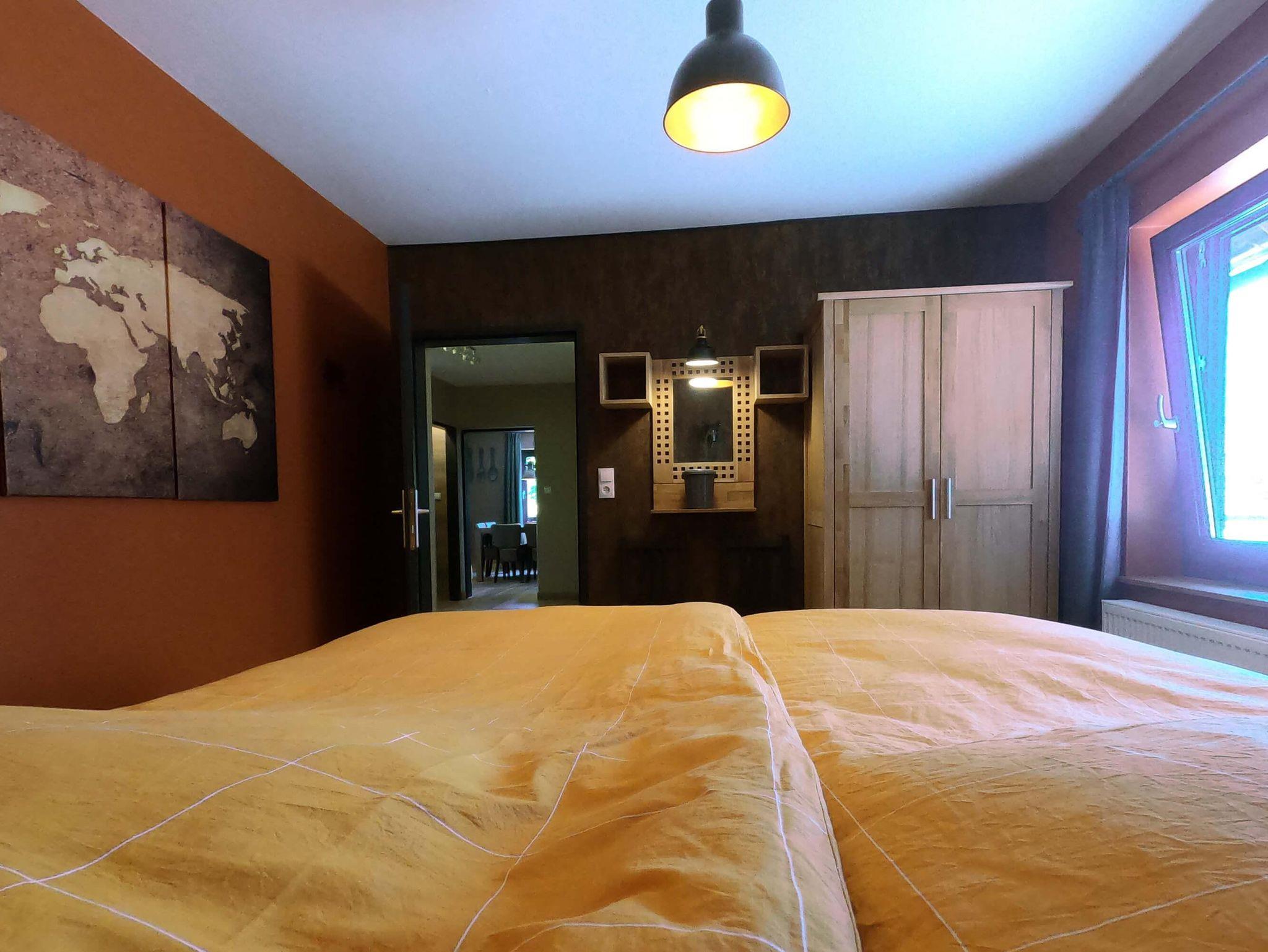 Wohnung bestehend aus: großer, geräumiger Halle mit Garderobe, großem Wohnzimmer mit offener (Wohn-)Küche. Die Küche ist ausgestattet mit: Glaskeramikkochfeld, Backofen, Mikrowelle, Geschirrspüler, Wasserkocher, Kaffeemaschine, Spüle mit fließendem kaltem und warmem Wasser, Besteck, Pfannen und allen anderen Küchengegenständen. 3 Schlafzimmer für maximal 5 Personen. 1 Schlafzimmer mit einem großen Doppelbett (180x200), 1 Schlafzimmer mit 2 Einzelbetten (90x200) und 1 Schlafzimmer mit 1 Einzelbett (90x200) für 1 Person/Kind. Badezimmer mit Walk-in Dusche, Waschbecken mit fließendem kaltem und warmem Wasser. Getrennte Toilette. Die freistehende Wohnung befindet sich im Erdgeschoss und ist über eine kleine Treppe mit 3 Stufen vom Straßenniveau aus zugänglich. Parkplätze stehen kostenlos zur Verfügung. Außerdem können Sie den großen Innenhofgarten mit Terrasse und Spielplatz in unserem angrenzenden Pensiongebäude nutzen.