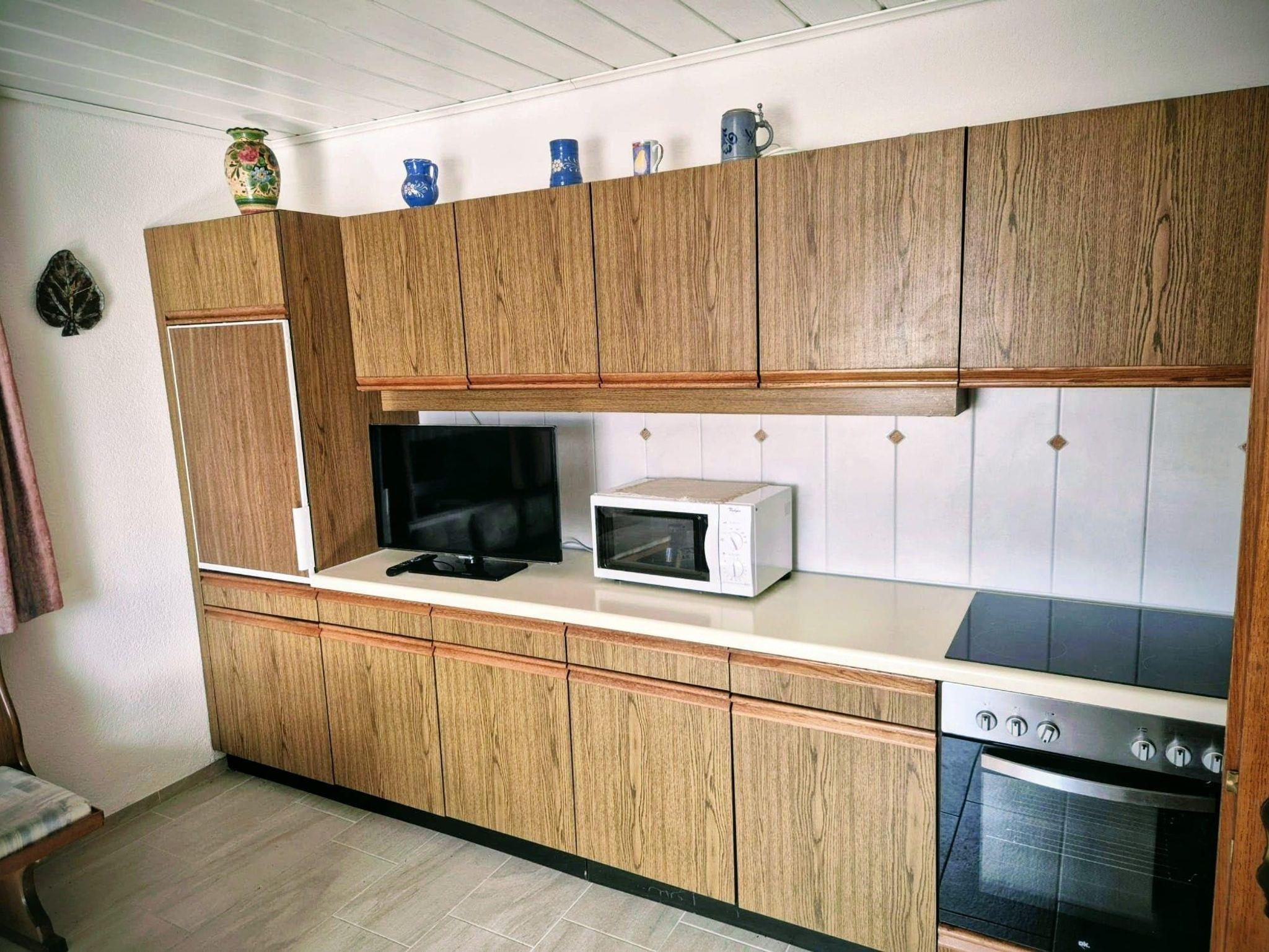 • - Wohnküche mit Essbereich für 6 Personen, E-Herd, Backofen, Kühlschrank, Geschirrspüler, Mikrowelle, Kaffeemaschine, Wasserkocher, Geschirr, Gläser, Besteck, Geschirrtücher, usw.