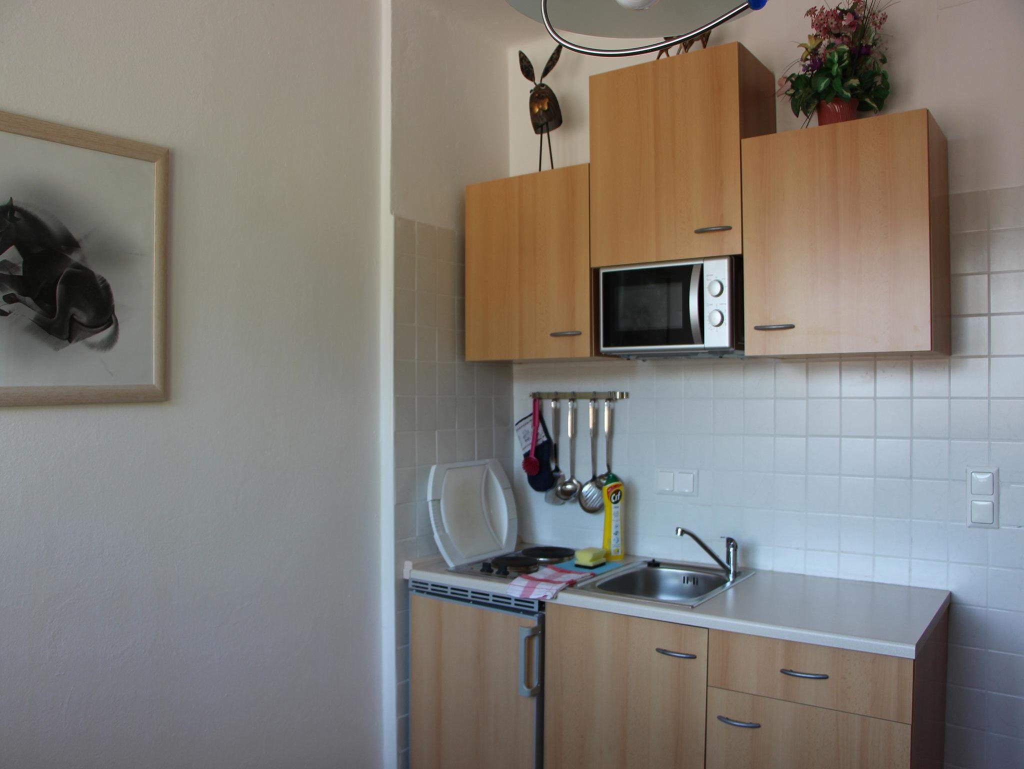 Unsere “kleine” Ferienwohnung mit ca. 40 m2, für 2 Personen mit großzügigem Wohn- Schlafraum, Südbalkon, Dusche/ WC, Radio, Sat-TV, Haarfön, Vorraum und Küche mit Essecke.