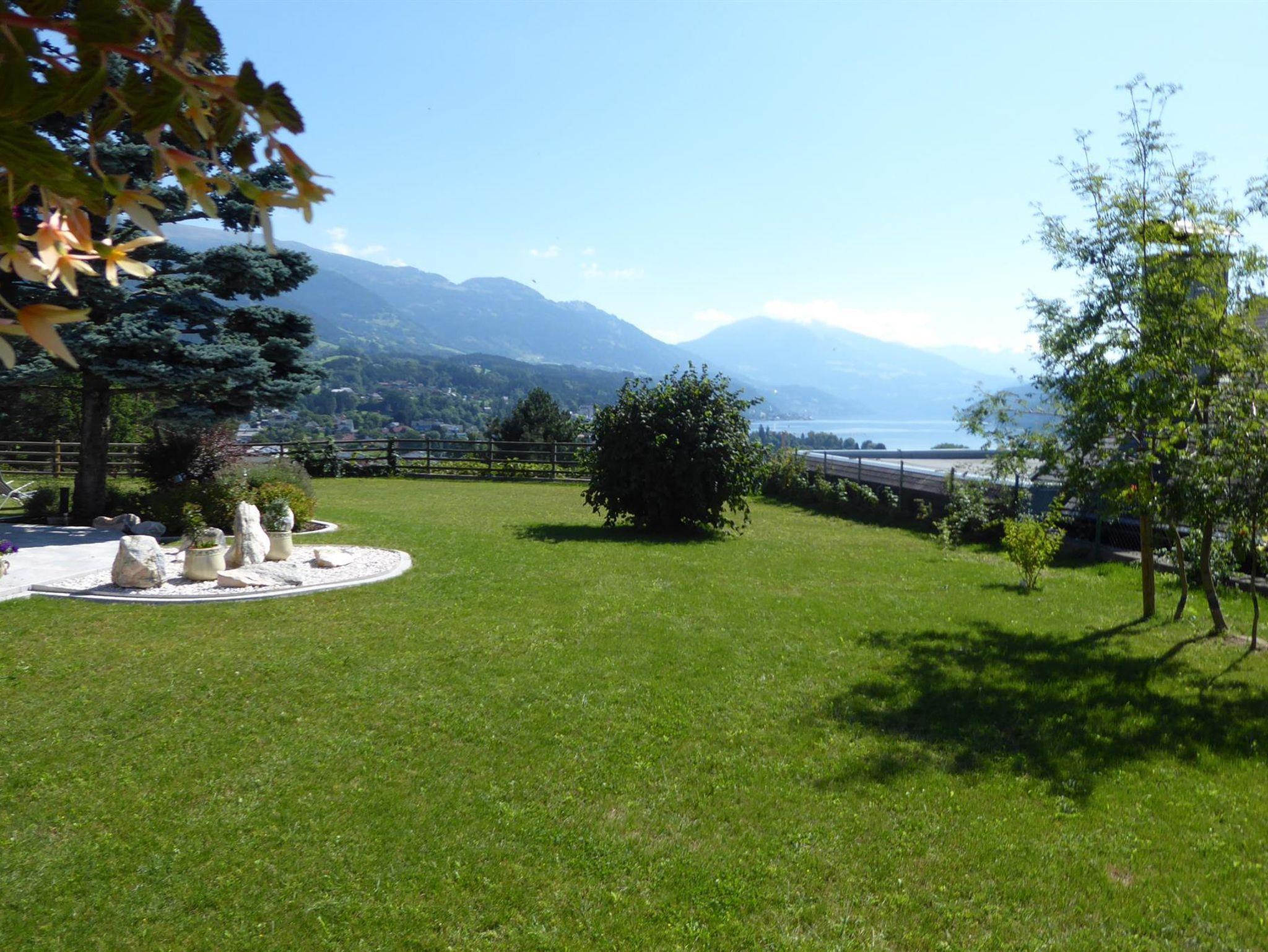 Unsere Frühstückspension liegt in Seeboden am Millstätter See auf einer Anhöhe mit Blick über den ganzen See, den Ort und die umliegenden grünen Berge.