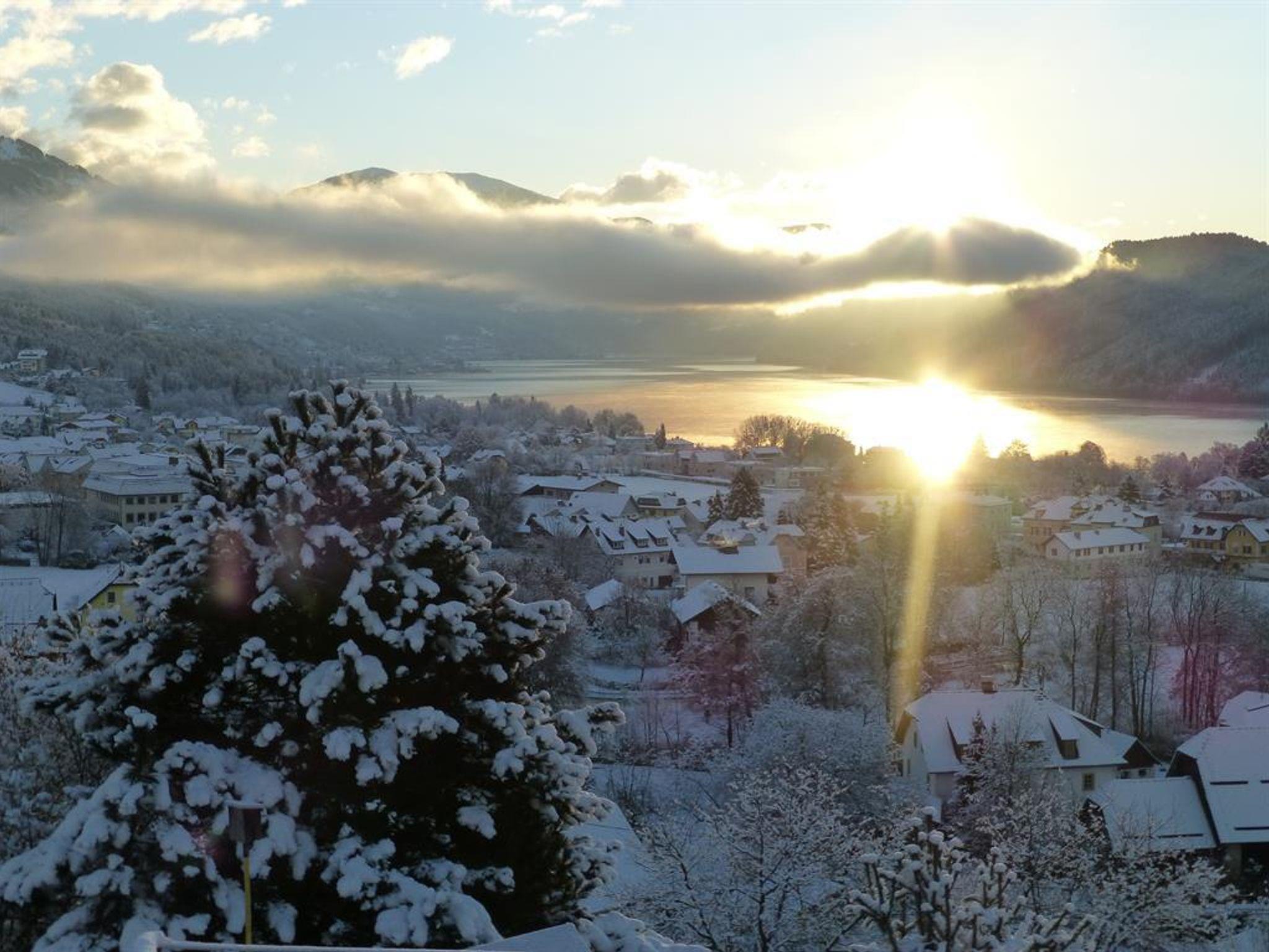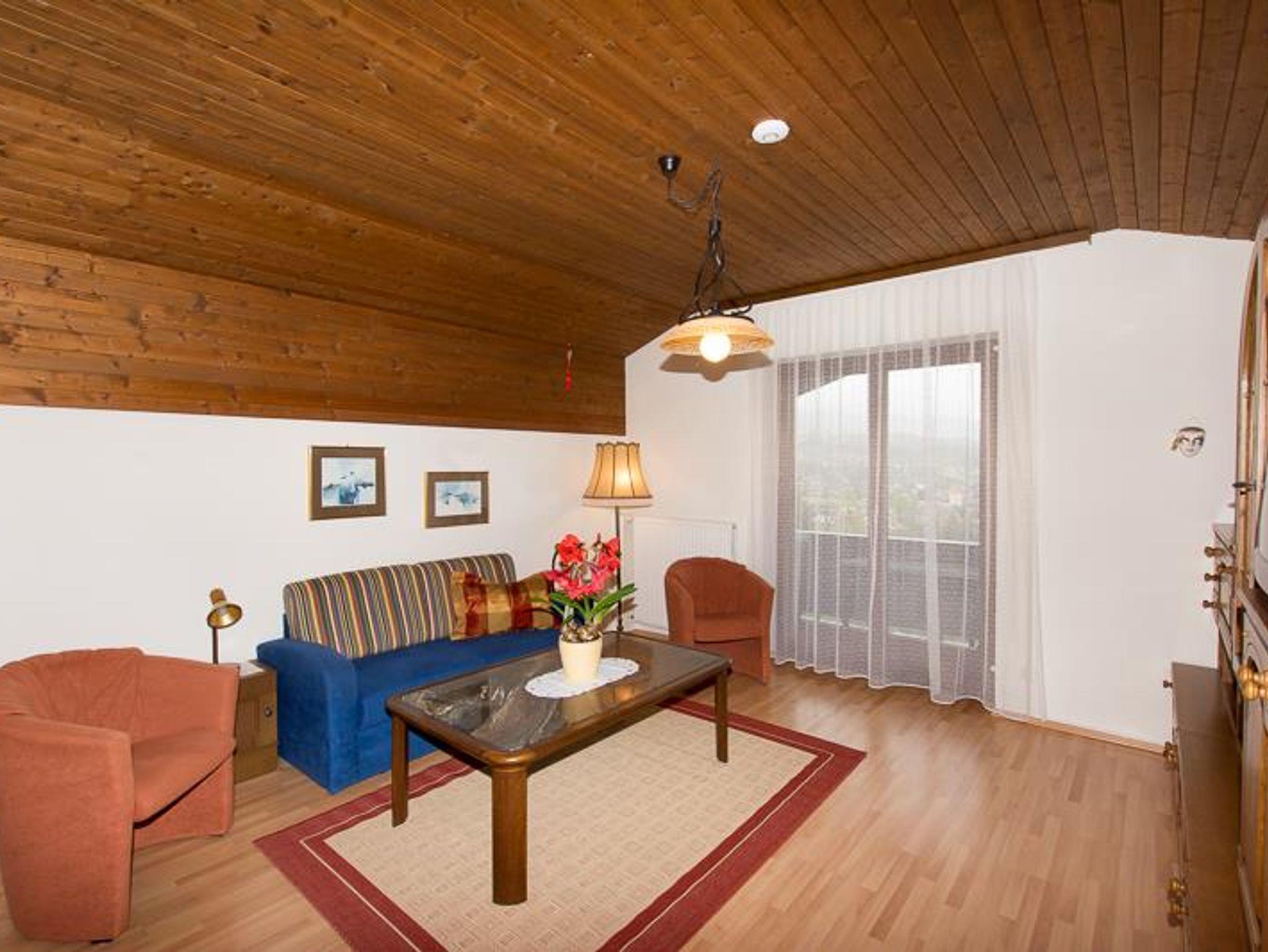 Wohnzimmer mit SAT-TV, W-LAN und Bad (Dusche, WC), Haar Föhn sowie Balkon mit spektakulären Blick über den ganzen Millstätter See, den Ort und die umliegende Berglandschaft.