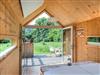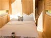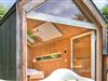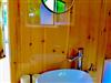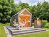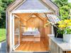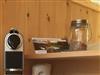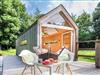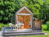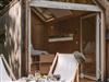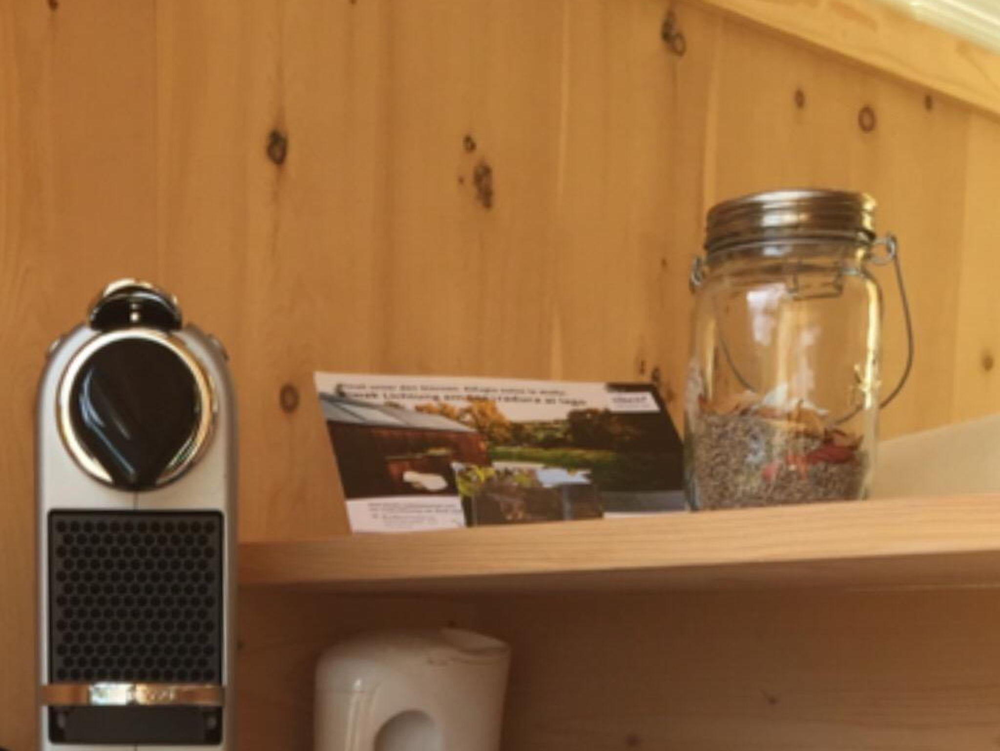 Kleines Badezimmer mit Warmwasser und WC, Kingsize-Bett 160x200, Tisch, 2 Sessel, Stauraum unter dem Bett, 2 elektrische Dachflächenfenster, Innenrollo, Infrarotheizung. Terrasse mit Kühlschrank, Tisch mit 2 Sesseln und Sonnenschirm, 2 Liegestühle. Warmwasser-Außendusche. Nespressomaschine mit Kapseln, Wasserkocher mit Teesortiment und Zucker. Picknickkorb mit Tellern, Gläsern, Tassen, Besteck, Salz, Pfeffer, Flaschenöffner, Sektverschluss.