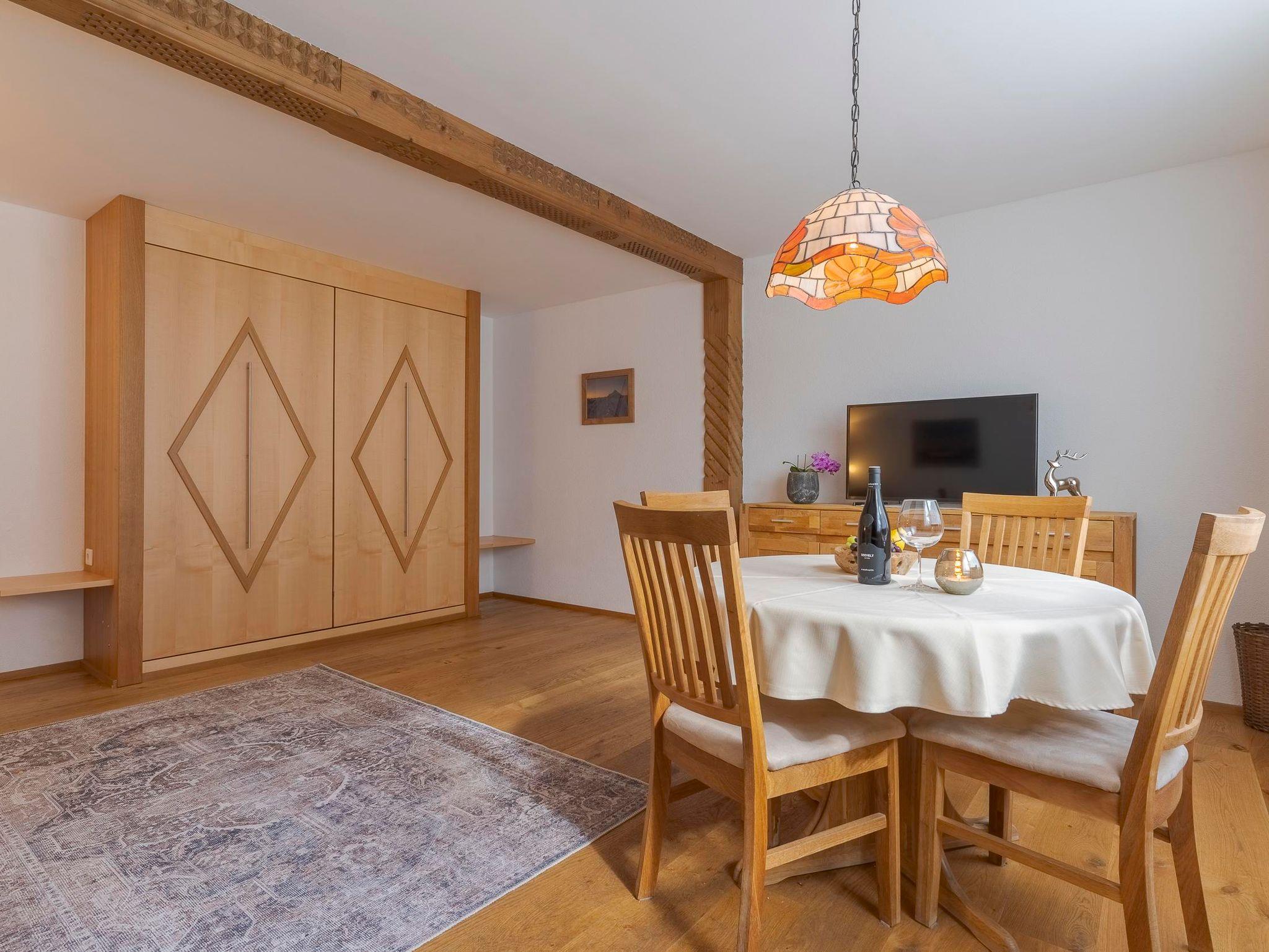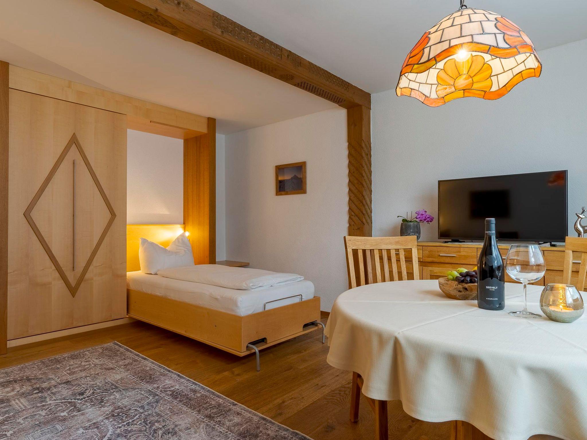 Wohnschlafzimmer mit Terrasse, Kochnische, Dusche mit WC. Der rustikale Wohnraum ist mit einer Eßecke, einer Sitzgruppe, Schrankbetten, Kabel-TV und Selbstwähltelefon ausgestattet.