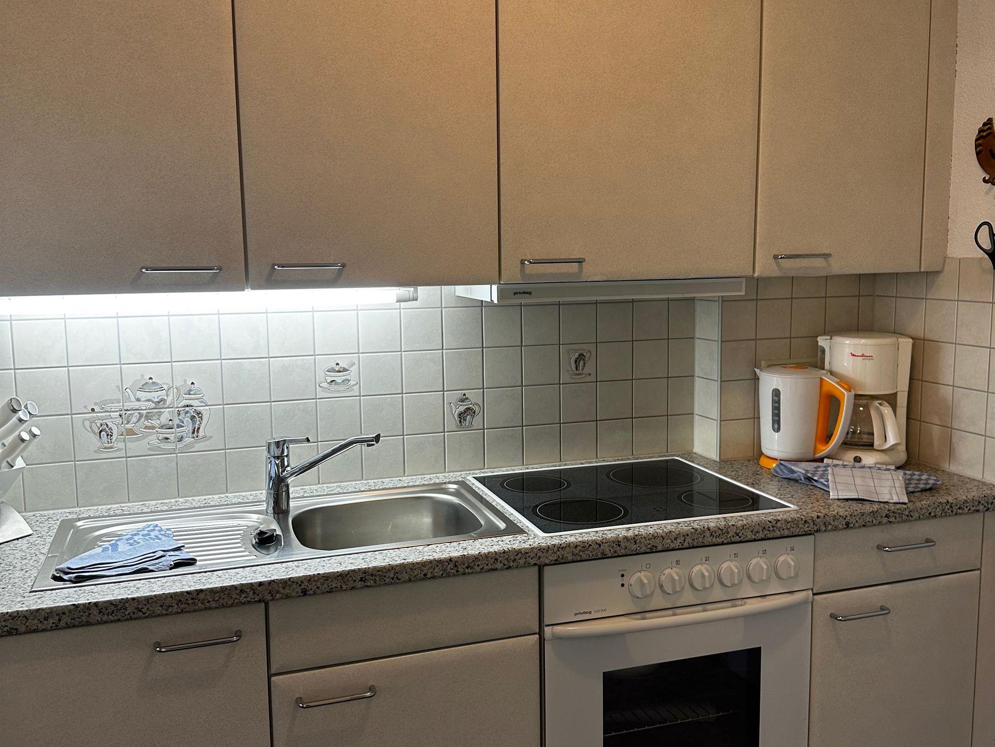 Das etwa 35 m² große Appartement ist ideal für bis zu 2 Personen und bietet einen kombinierten Wohn- und Schlafbereich, eine Küchenzeile, ein Badezimmer und einen Balkon.