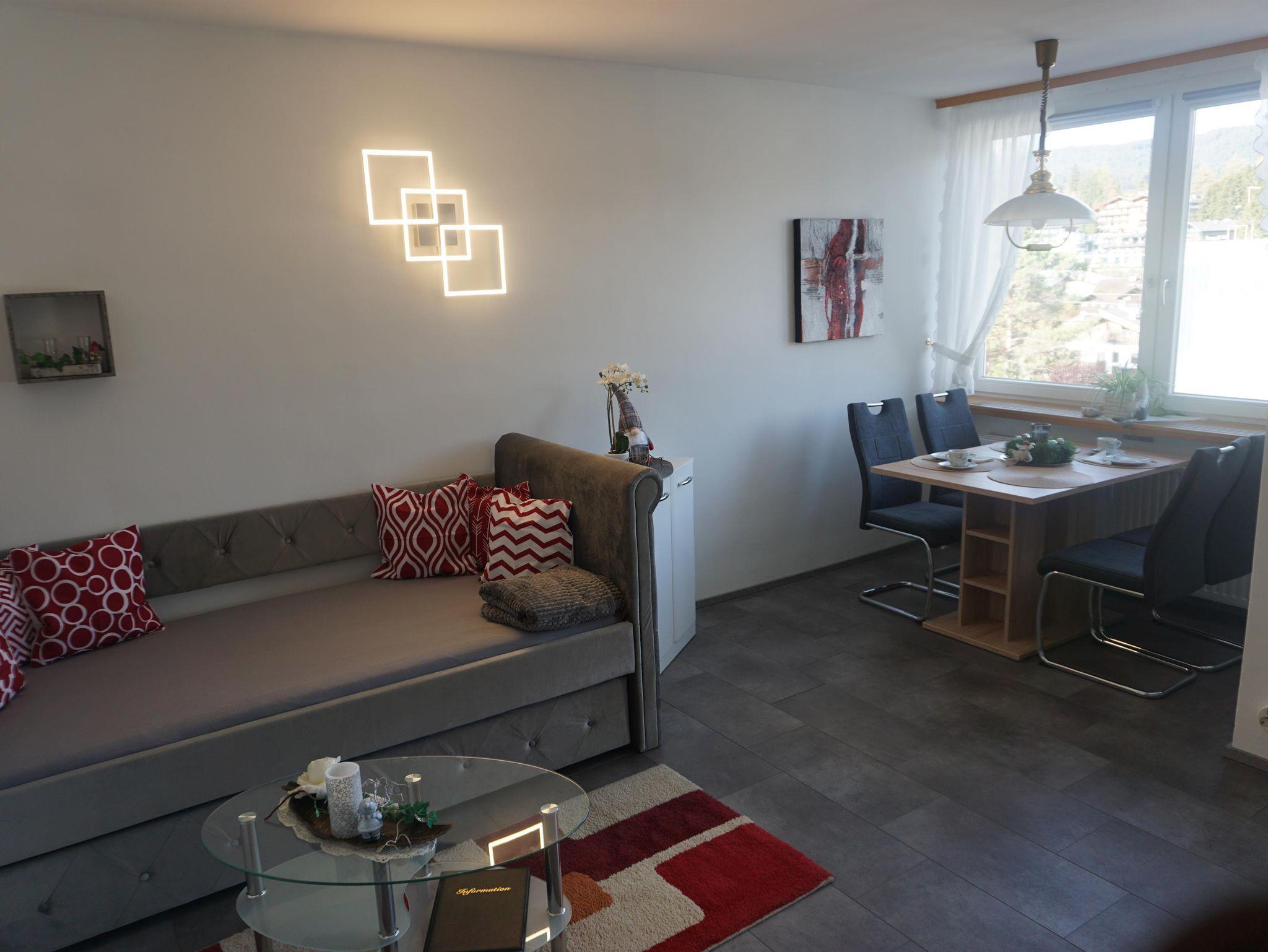 Das Appartement liegt in der obersten Etage des Haus Alpenland und besteht aus einem abgetrennten Küchenbereich, einem extra Bad und einem großen Wohn-/Ess-/Schlafbereich. Ausserdem gibt es einen kleinen Sonnenbalkon zum Relaxen.