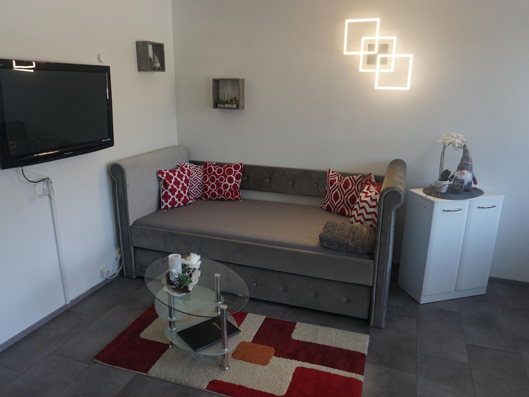 Das Appartement ist 32 m2 groß und besteht aus einem abgetrennten Küchenbereich, einem extra Bad, einem großen Wohn/Ess/Schlafbereich. Ausserdem gibt es einen kleinen Balkon zum Relaxen.