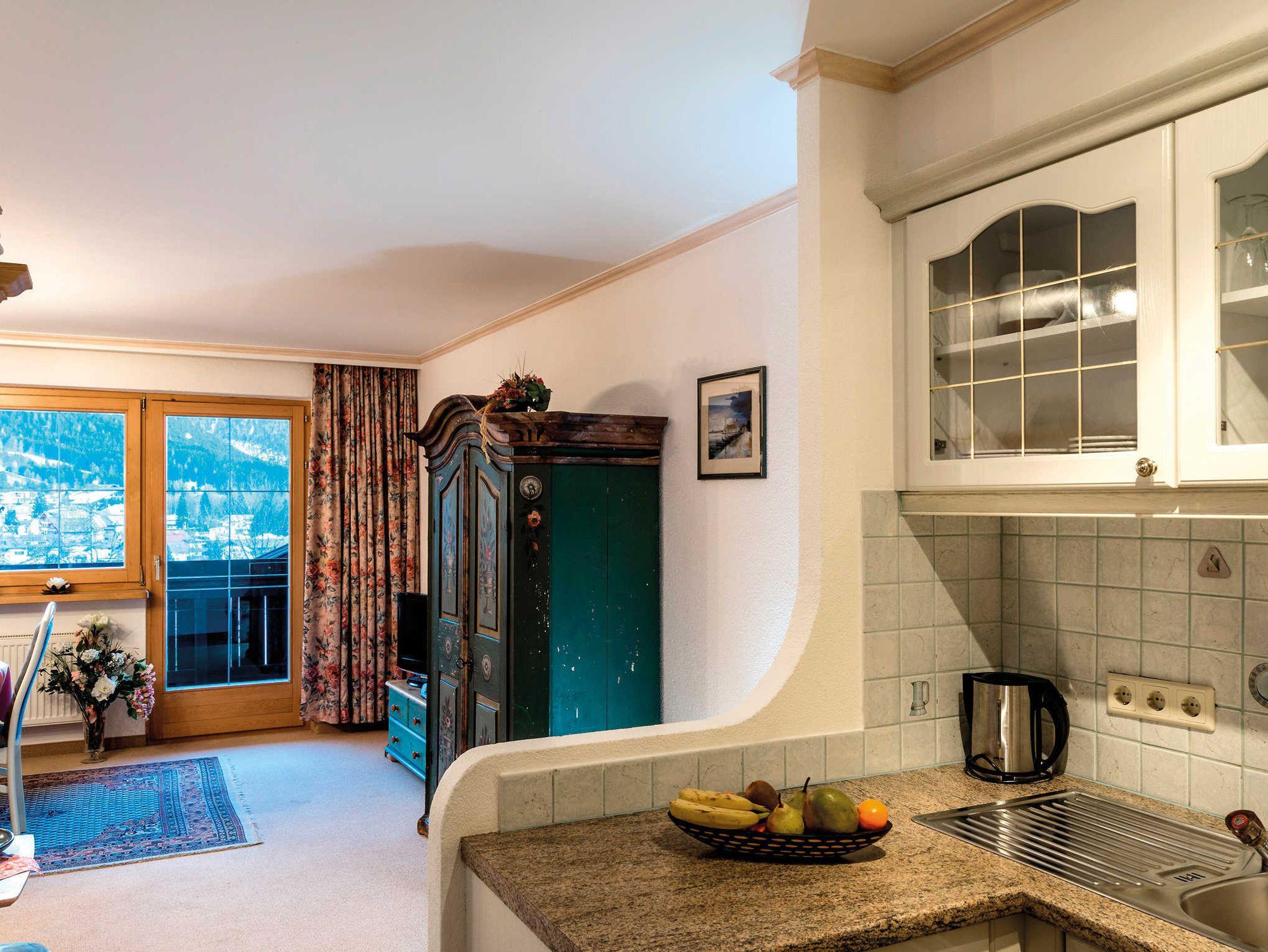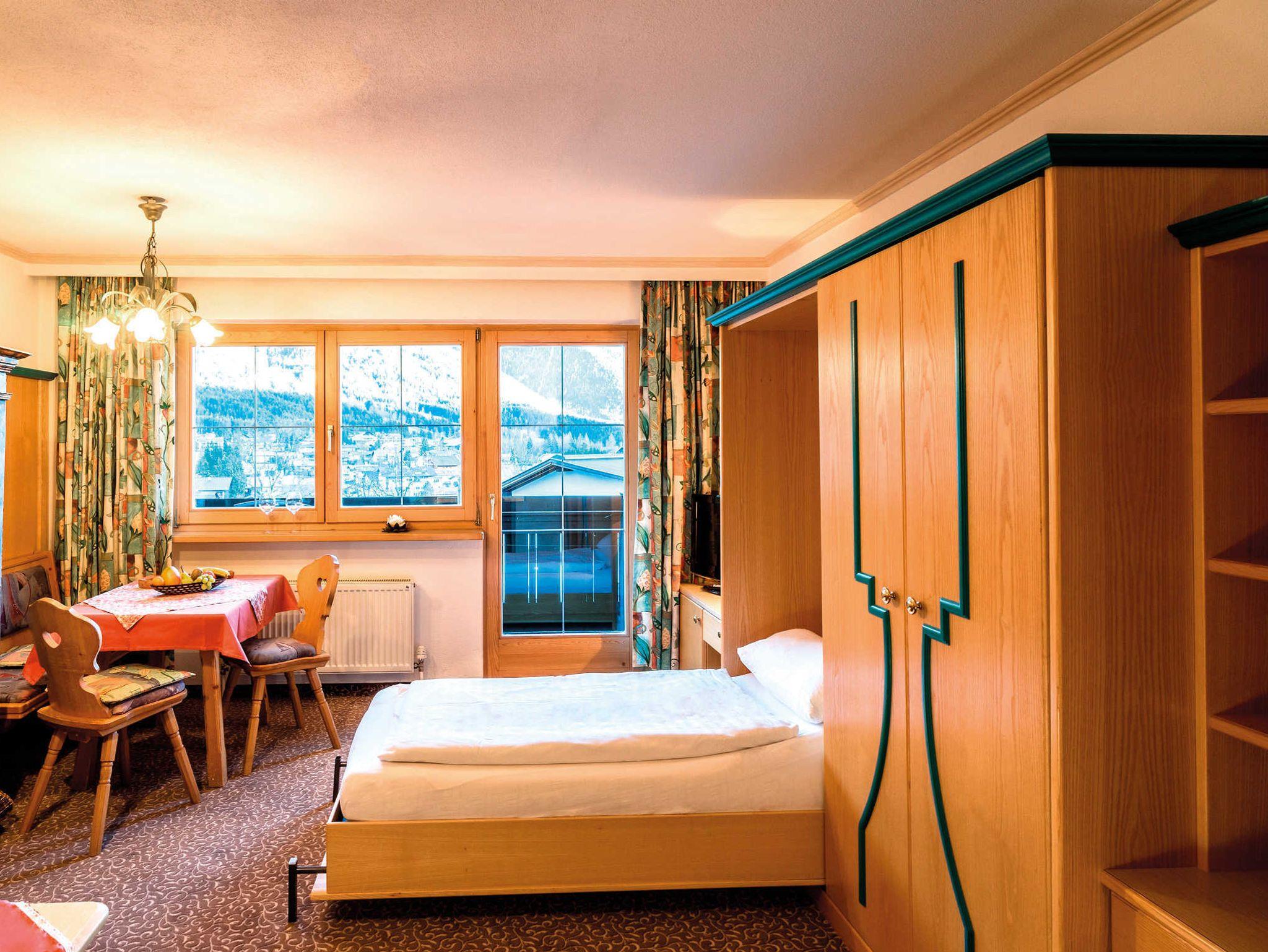 1-Raum-Wohnung, Wohnschlafraum mit Doppelbetten, Sitzecke, Kochnische, Bad, WC, Telefon, Kabel- TV, Radio, Süd- oder Westbalkon oder Südterrasse.
