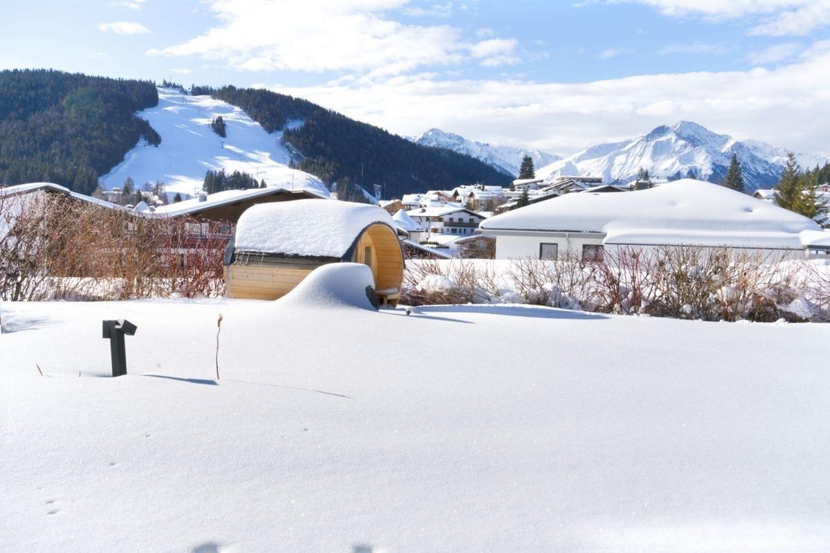 500 qm privater Süd-Garten mit 30 qm Panorama-Terrasse und Fasssauna