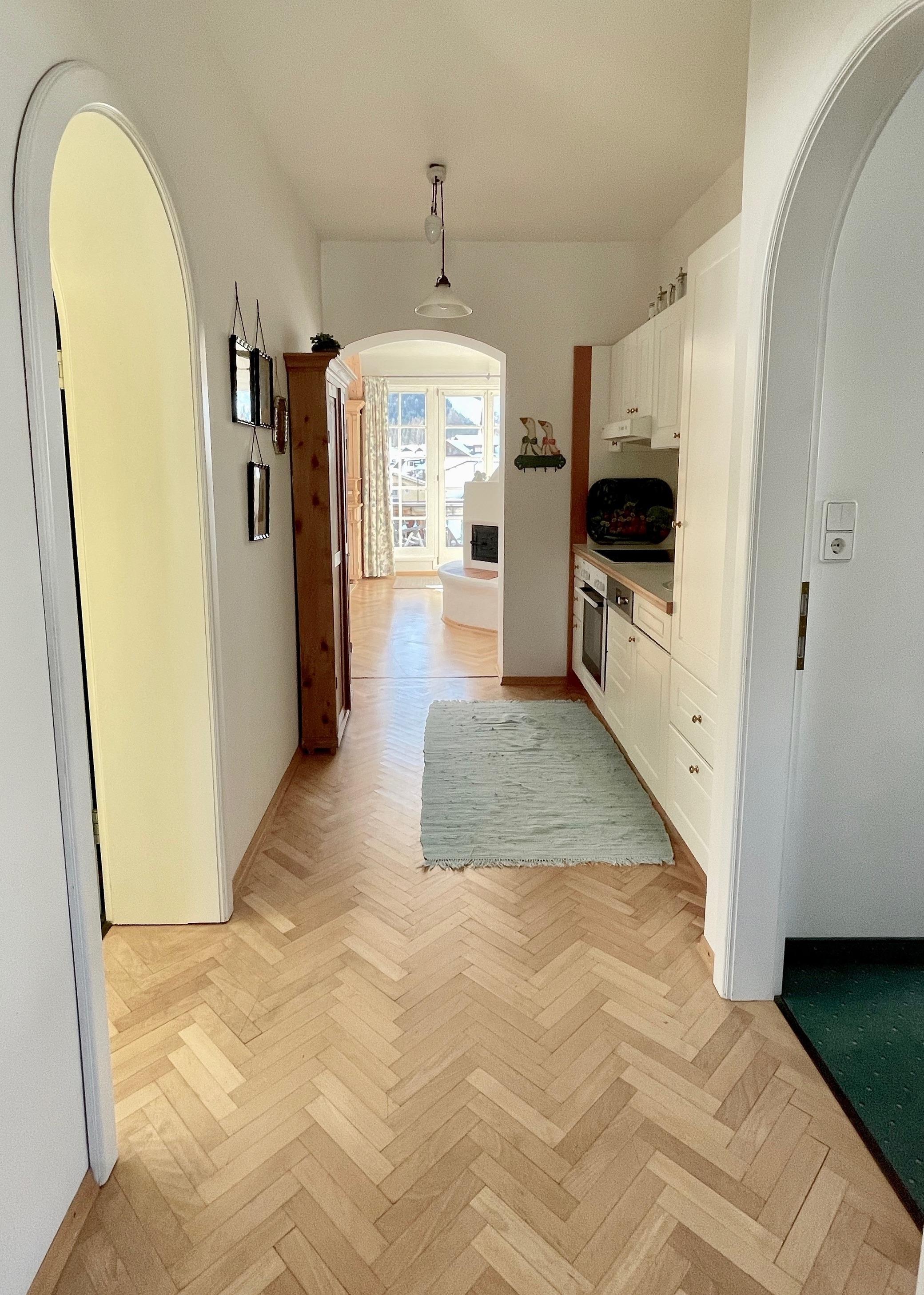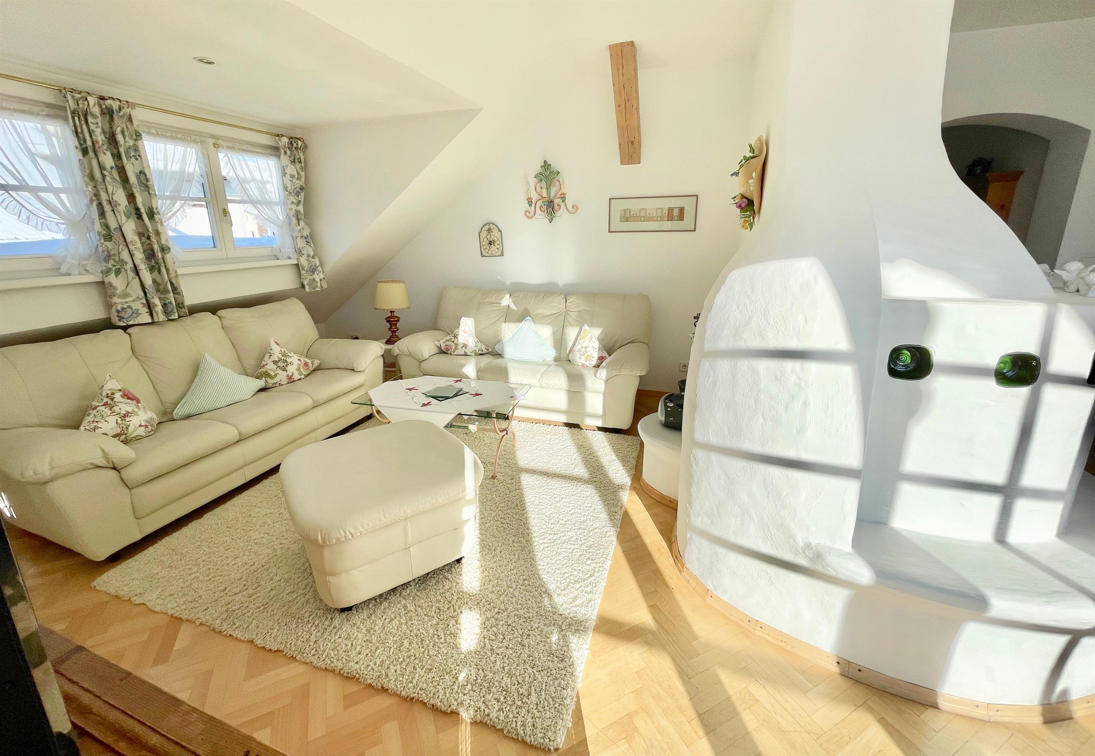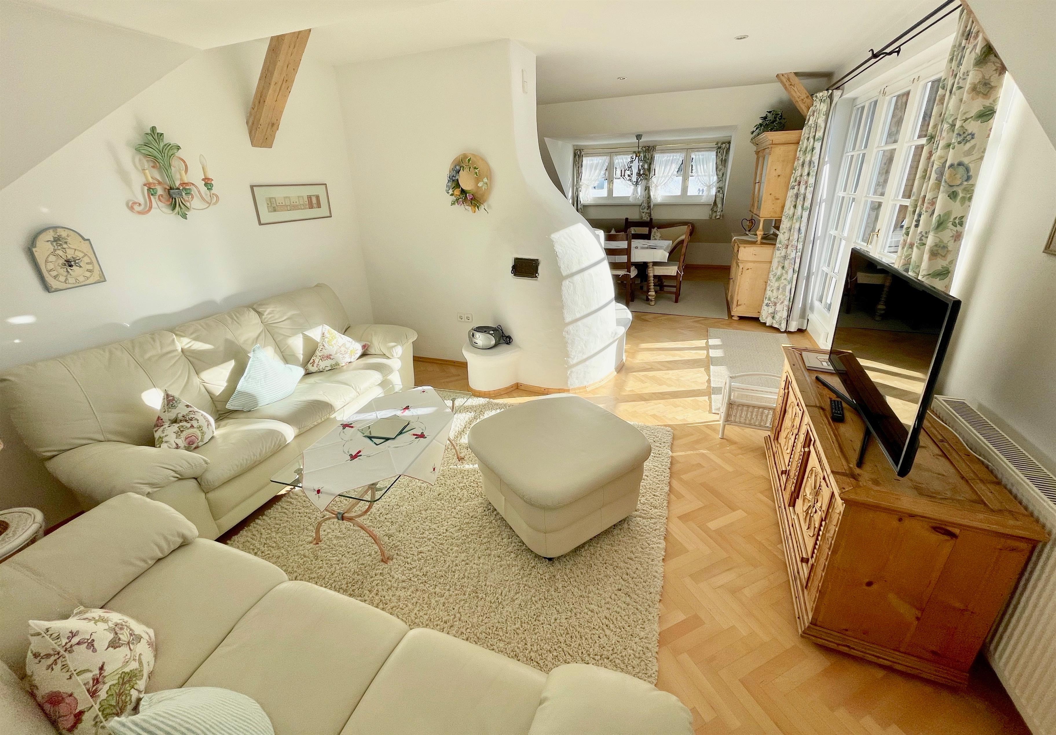 Die Ferienwohnung ist im ursprünglichen Stil erhalten und verfügt über Südbalkon, ein lichtdurchflutetes offenes Wohnzimmer mit Essecke sowie gemütlichen Sofas. Ein Schlafzimmer mit Doppelbett sowie ein Schlafzimmer mit 2 getrennten Betten, großes Marmorbad mit Eck-Badewanne und getrennter Dusche, zweite separate Toilette sowie einer voll ausgestatteten Kochzeile. Der original Kachelofen wurden erhalten, ist nun elektrisch bedienbar und sorgt für ein besonders gemütliches Wohnklima. High Speed WLAN steht im ganzen Haus zur Verfügung, unsere TV Geräte sind NETFLIX, APPLE TV, AMAZON... etc. tauglich.