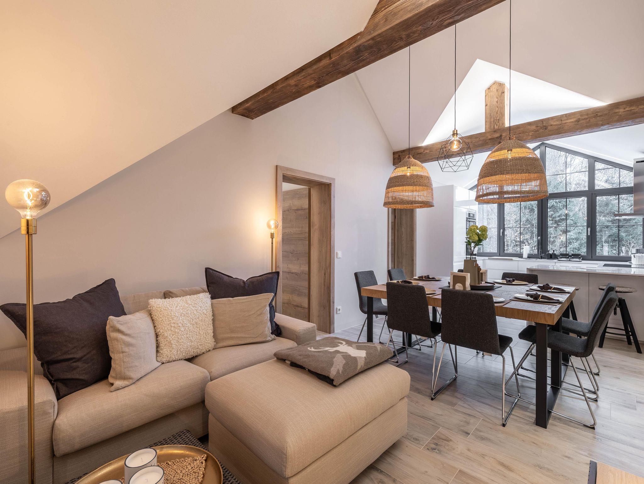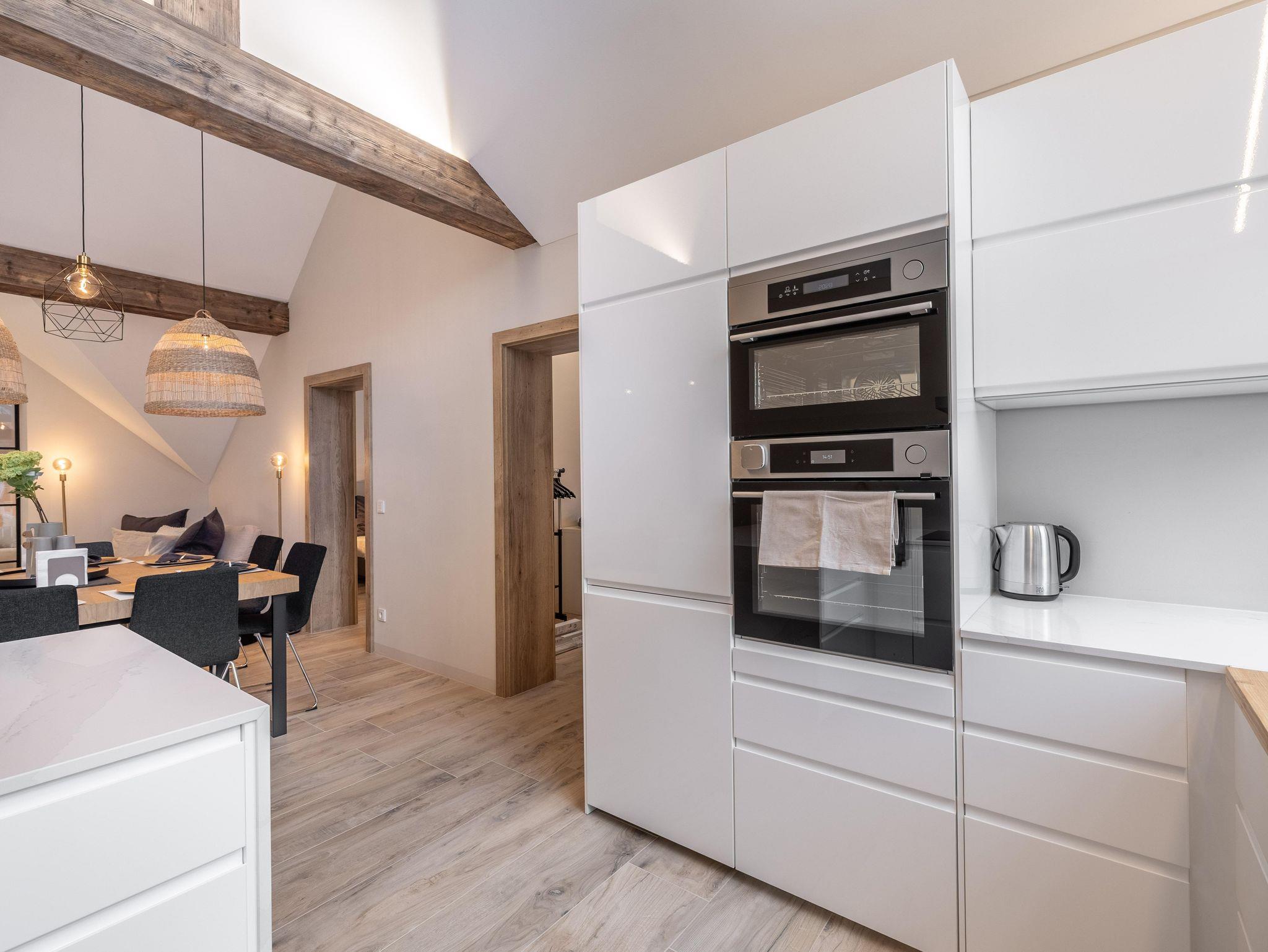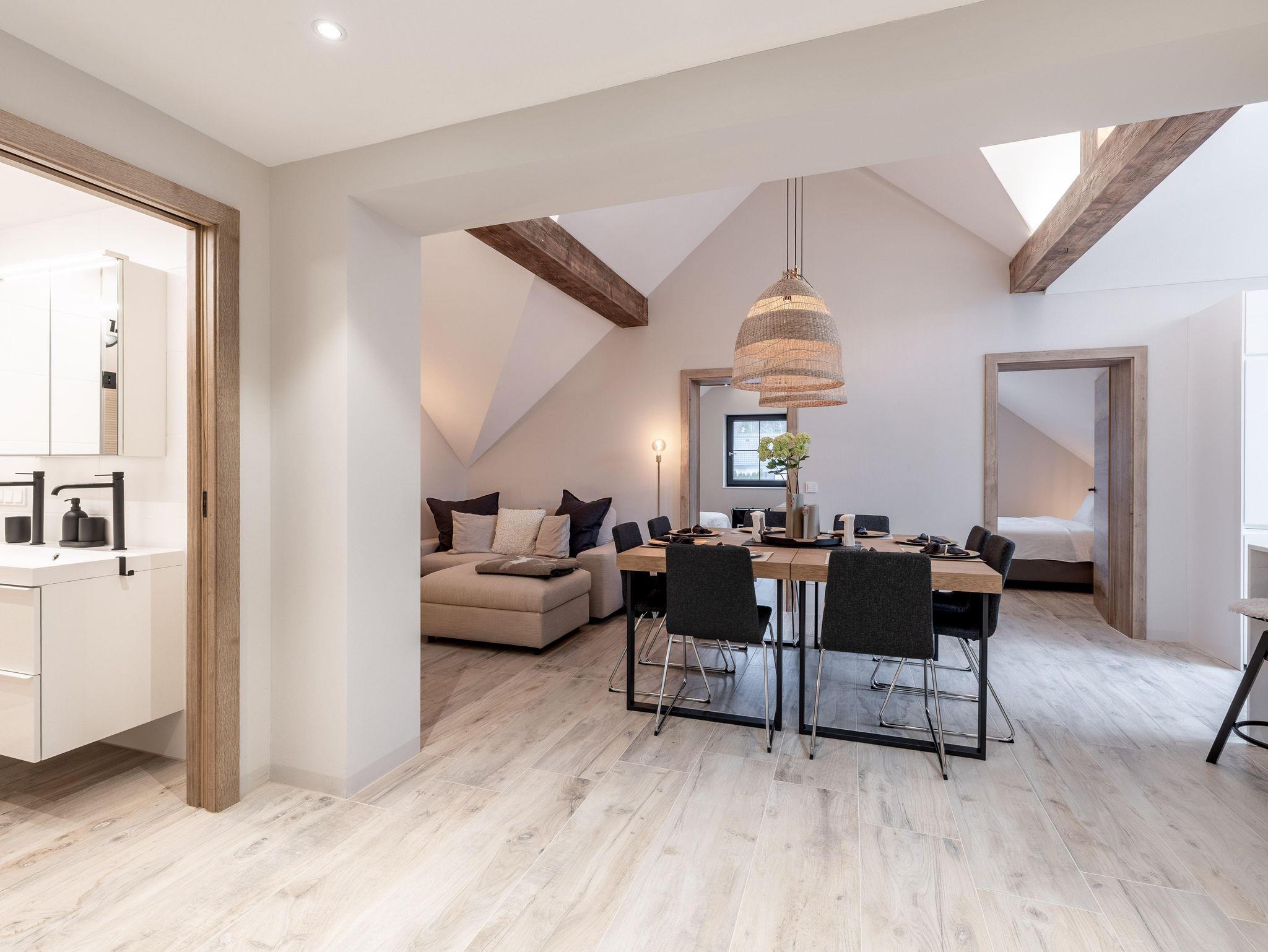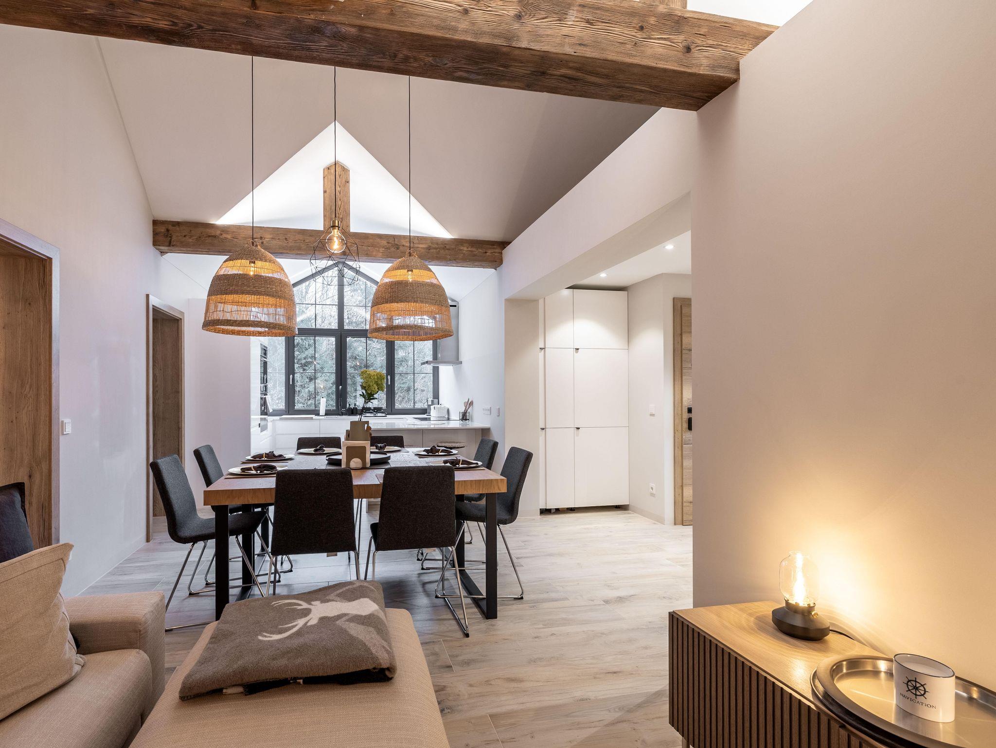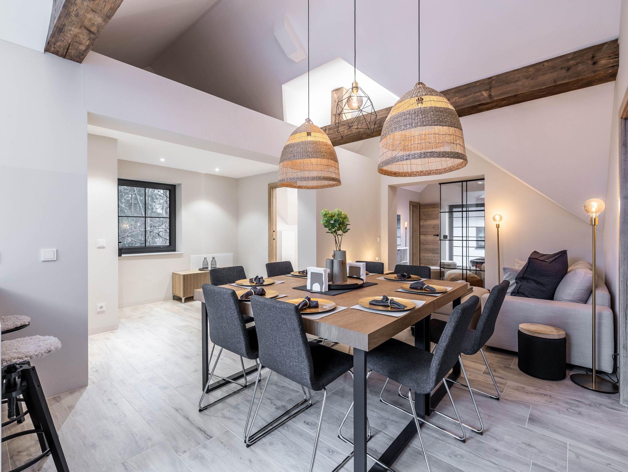 Wunderschöne Ferienwohnung mit Panoramafenstern und Blick auf den Wald. Die gesamte Wohnung wurde komplett neu renoviert und bietet auf 90 m² Platz für bis zu 8 Personen. Genießen Sie eine große, moderne Küche, ideal für gemeinsame Kochabende. Die Wohnung verfügt über zwei Schlafzimmer im ersten Stock.
