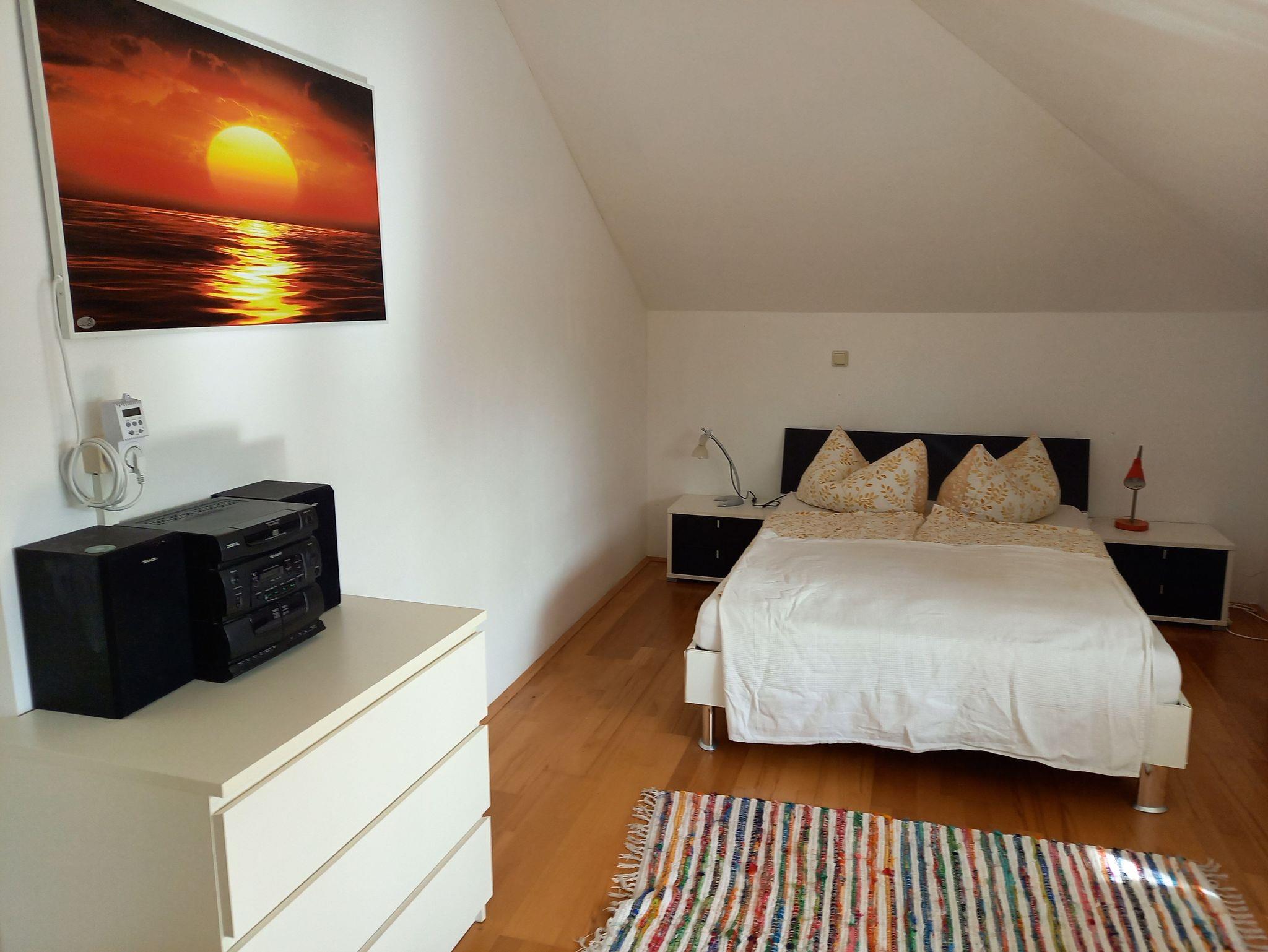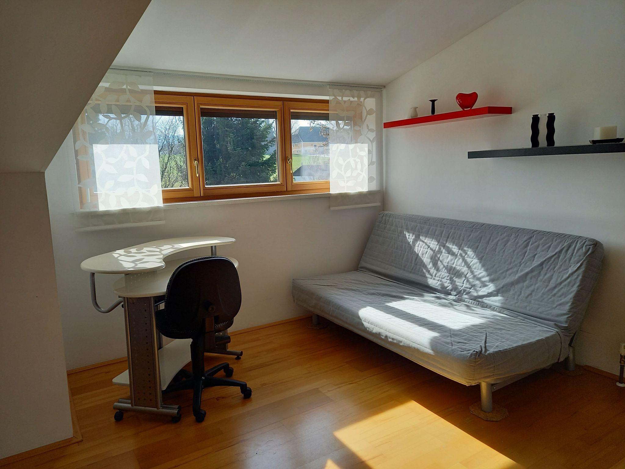 Etagenwohnung (abgeschlossener Wohnbereich, 2 -5 Personen, ideal für Kinder) bestehen aus: Vorraum ca. 8,5 m² Wohnküche ca. 23 m² Schlafraum ca. 25,5 m² Sauna incl. Ruheraum mit Waschbecken, Dusche und Tauchbecken ca. 15 m² Separates WC mit Waschbecken ca. 3,5 m² Carport Lage: mitten im Grünen (keine unmittelbaren Nachbarn) an einer wenig befahrenen Nebenstraße EKZ, Bank, Bus/Bahnstation in 700 m Entfernung Restaurants 100m Ins Ortszentrum 1,5 km Zum Attersee 2 km Freibadeplatz am Attersee mit kostenloser Parkmöglichkeit 5 km Fahrradweg führt am Haus vorbei Autobahnanschluss 1,5 km Flughafen 65 km (Salzburg) Ausstattung: TV, Musikanlage, WLAN, Wohnküche komplett, Sauna mit Ruheraum und Nassbereich: Dusche, Waschbecken, Tauchbecken, Liegen und Fitnessgeräte. Terrassen – und Gartenbenützung (eigener Gästebereich mit Sitz und Essgarnitur, Gartenliegen, Gartendusche) Grillplatz(Holzkohle - Grill steht zur Verfügung), Wäscheleine. Auf Wunsch: Frühstück im separaten Frühstücksraum Wäscheservice
