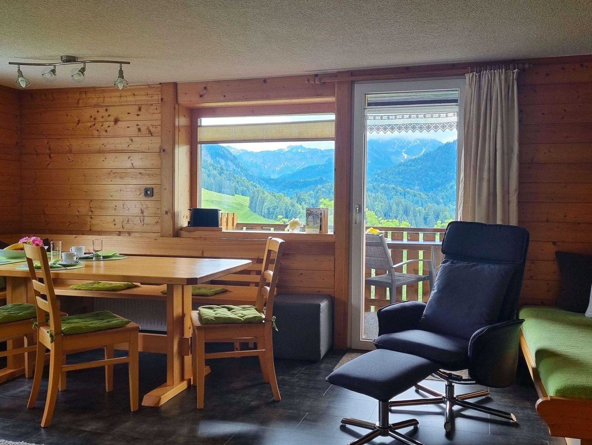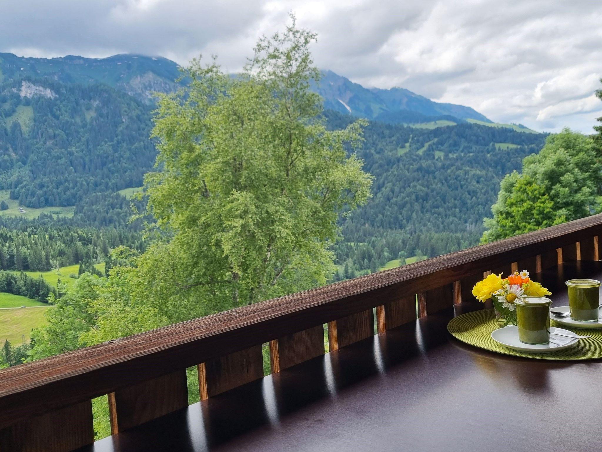 Ferienwohnung Panoramablick mit Blick auf die Bergkulisse und in den Garten.