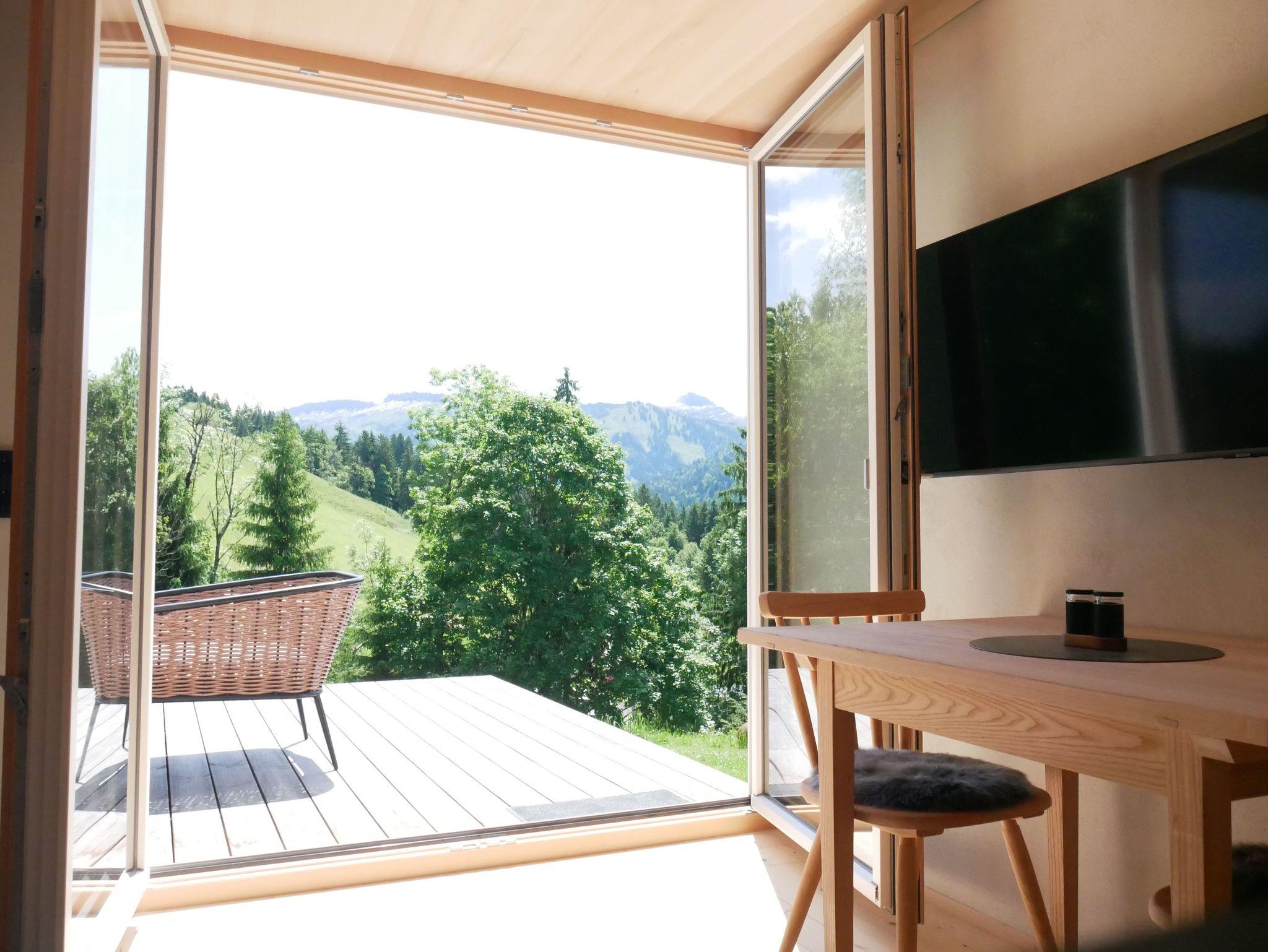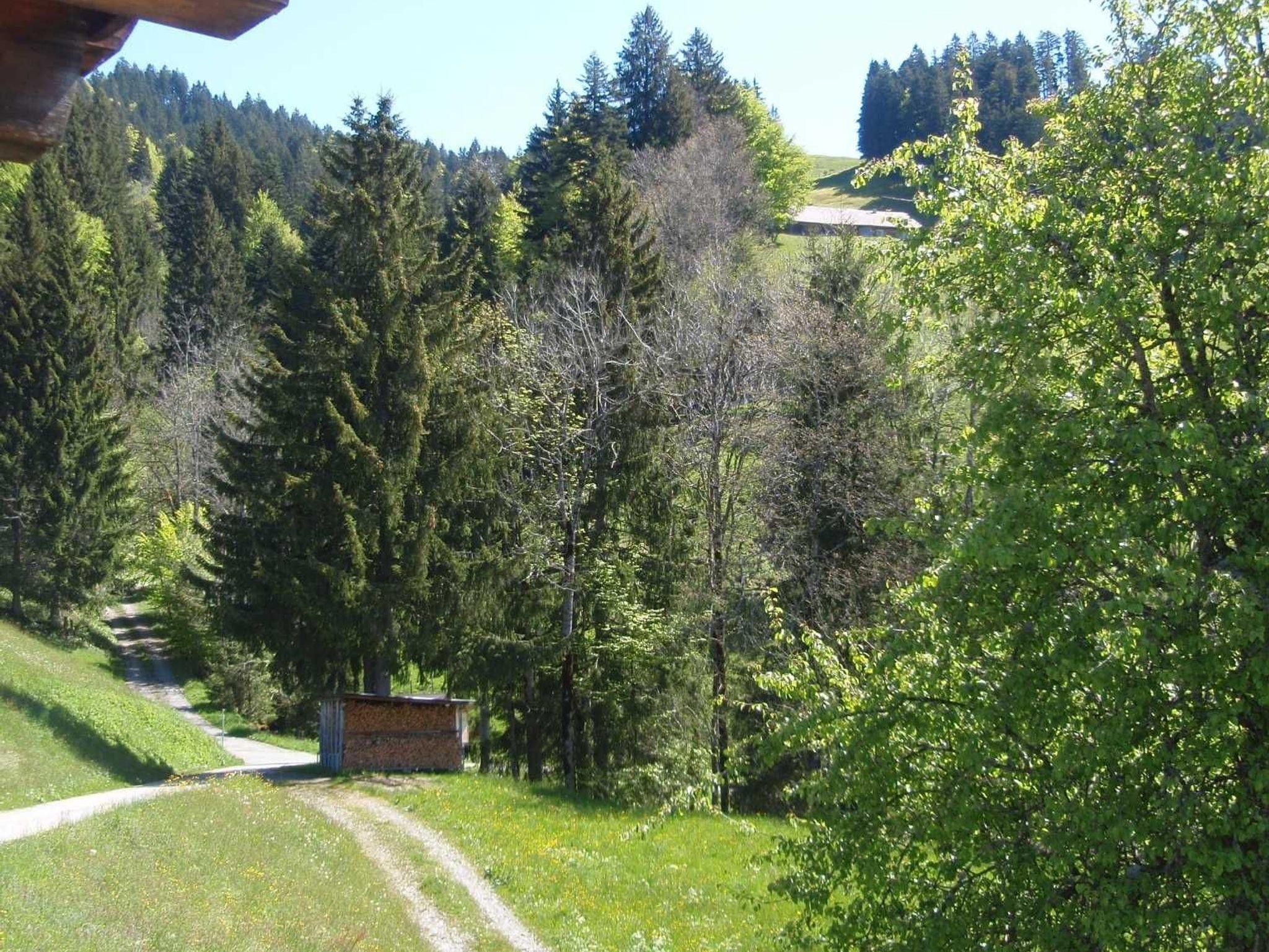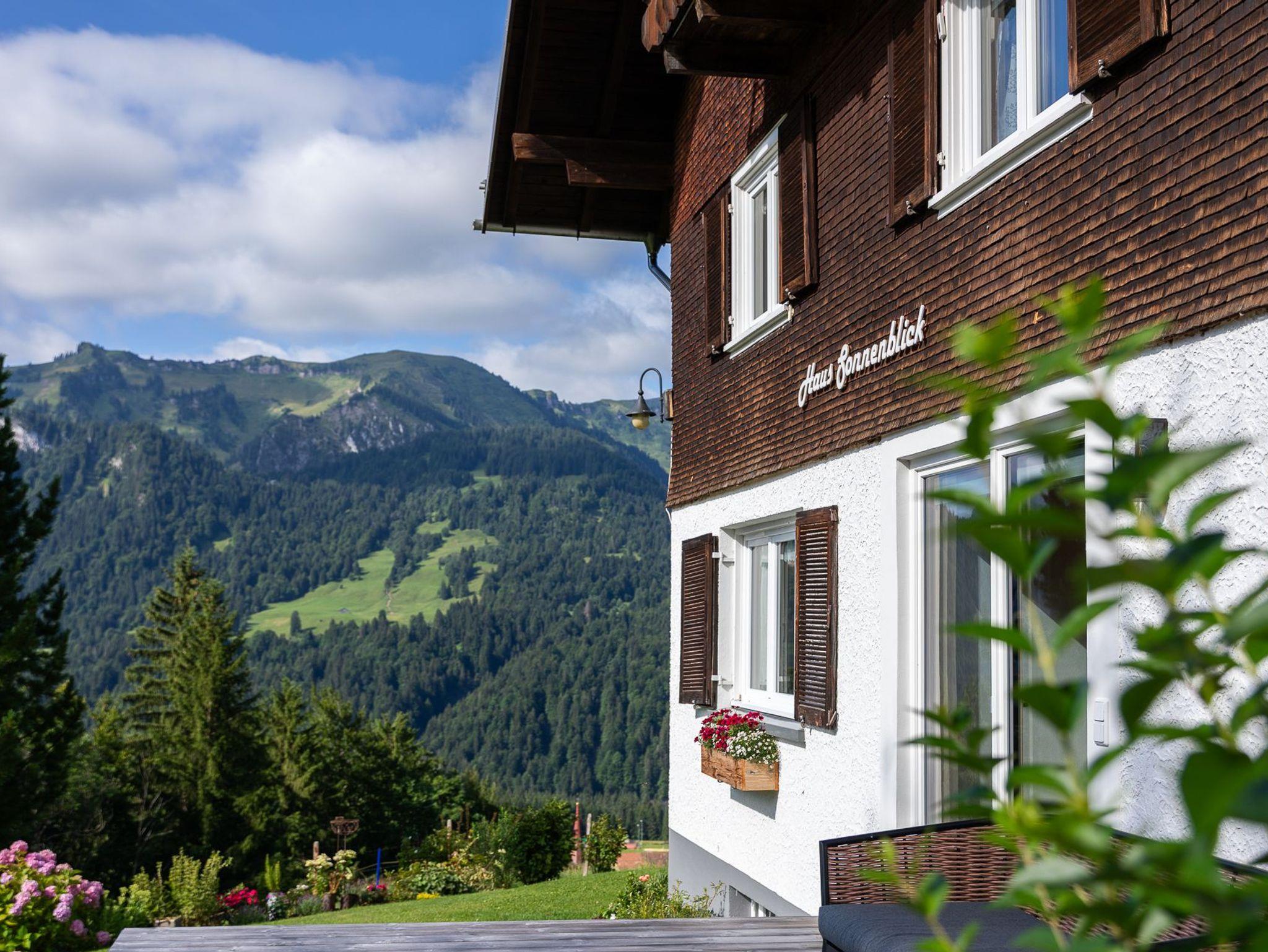 Vom Wohnbereich gelangen Sie auf eine großzügige Holzterrasse. Der ostseitige Blick richtet sich in die Morgensonne. Im Hintergrund sehen Sie die Gottesackerwände, den hohen Ifen, den Diedamskopf und auf der Terrasse auch den Bullerschkopf. Im Vordergrund blicken Sie auf die naheliegenden Wiesen und Alpen von Sibratsgfäll und Umgebung. Von Frühjahr bis in den Frühherbst können, grasende Kühe und Jungvieh Ihnen ein Gefühl von Urlaub auf der Alm verleihen.