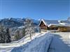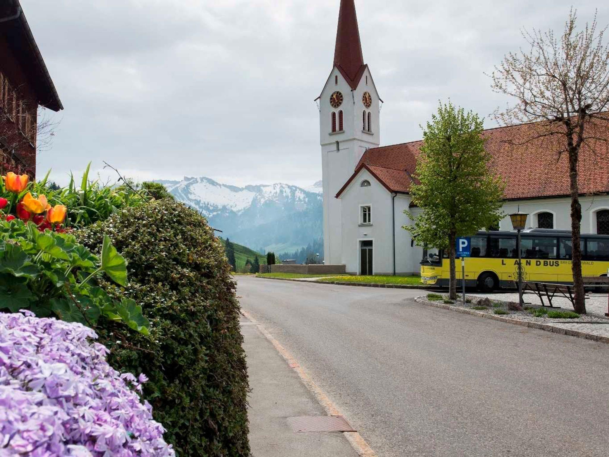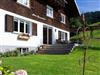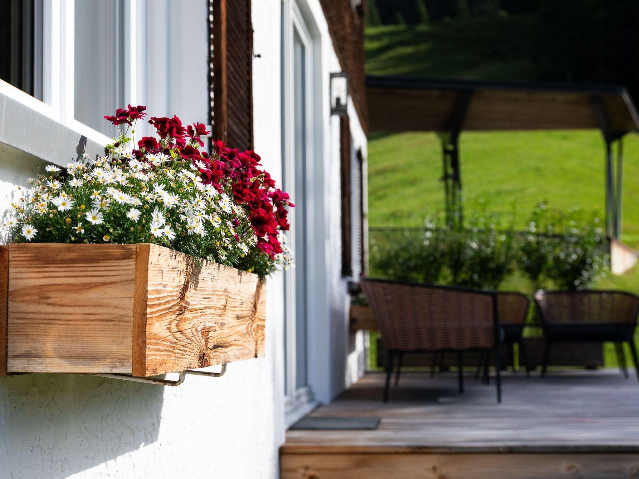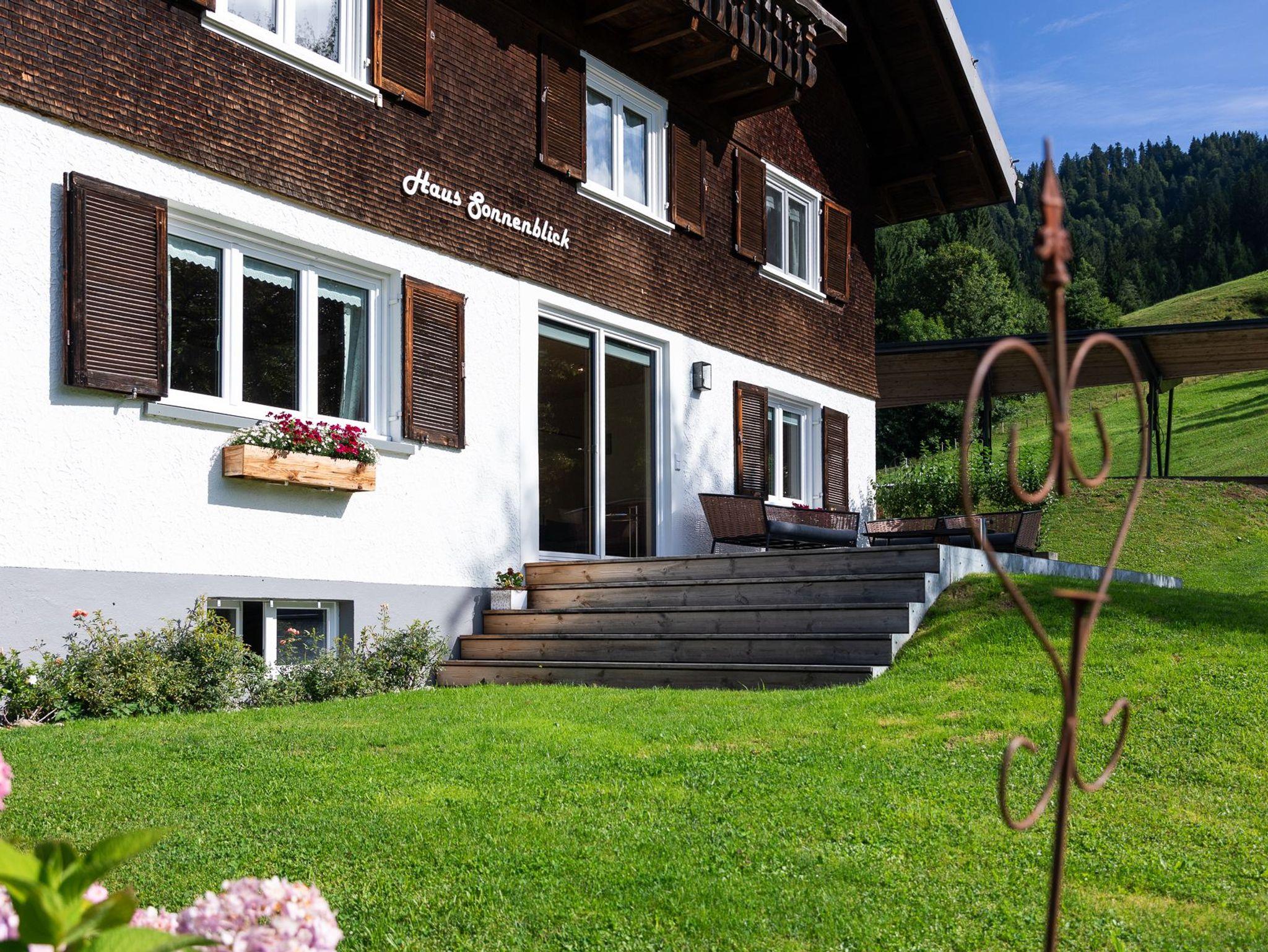 Vom Wohnbereich gelangen Sie auf eine großzügige Holzterrasse. Der ostseitige Blick richtet sich in die Morgensonne. Im Hintergrund sehen Sie die Gottesackerwände, den hohen Ifen, den Diedamskopf und auf der Terrasse auch den Bullerschkopf. Im Vordergrund blicken Sie auf die naheliegenden Wiesen und Alpen von Sibratsgfäll und Umgebung. Von Frühjahr bis in den Frühherbst können, grasende Kühe und Jungvieh Ihnen ein Gefühl von Urlaub auf der Alm verleihen.