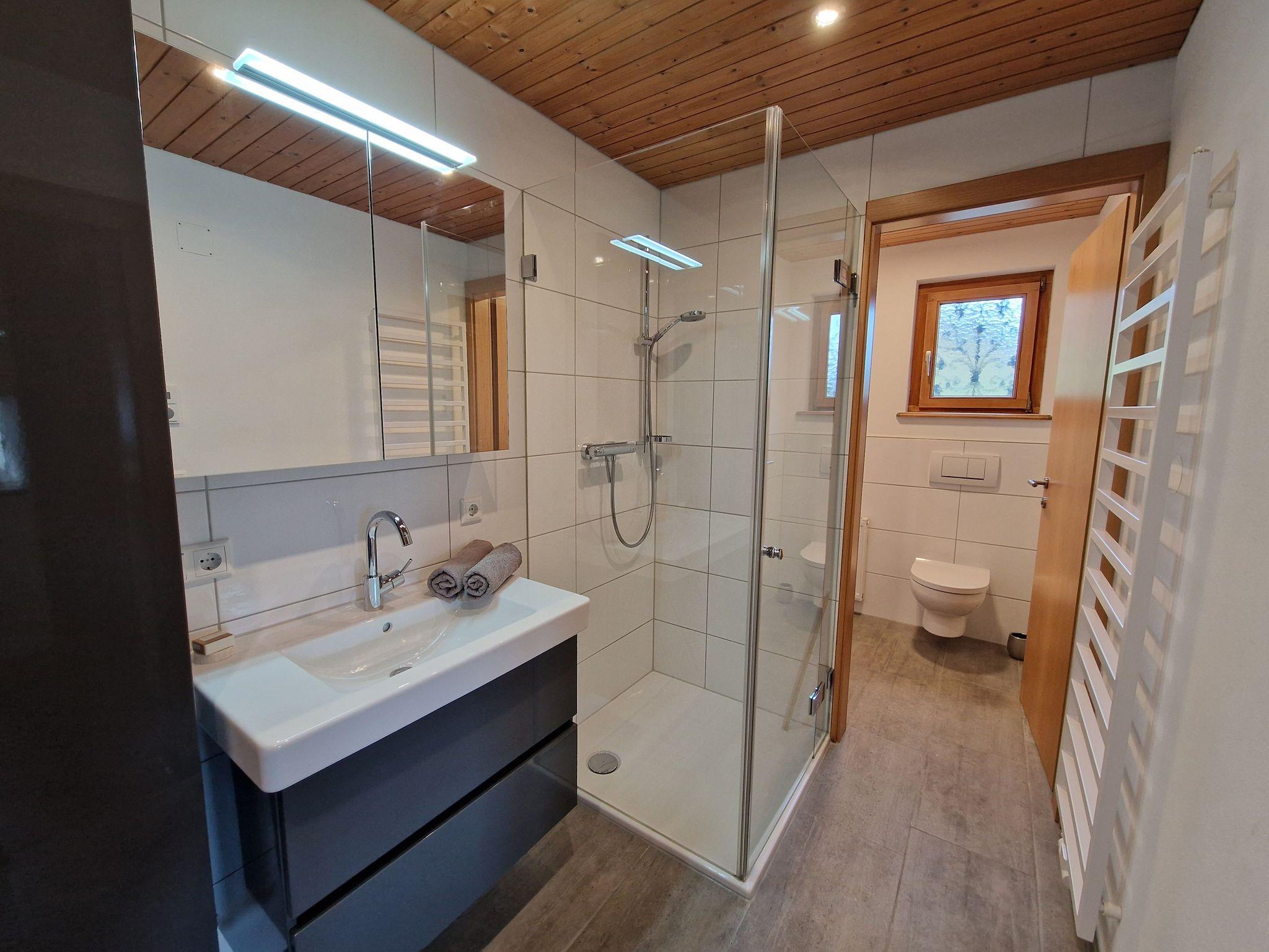 1 Badezimmer mit Dusche und separatem WC, 1 großes Wohnzimmer mit TV und