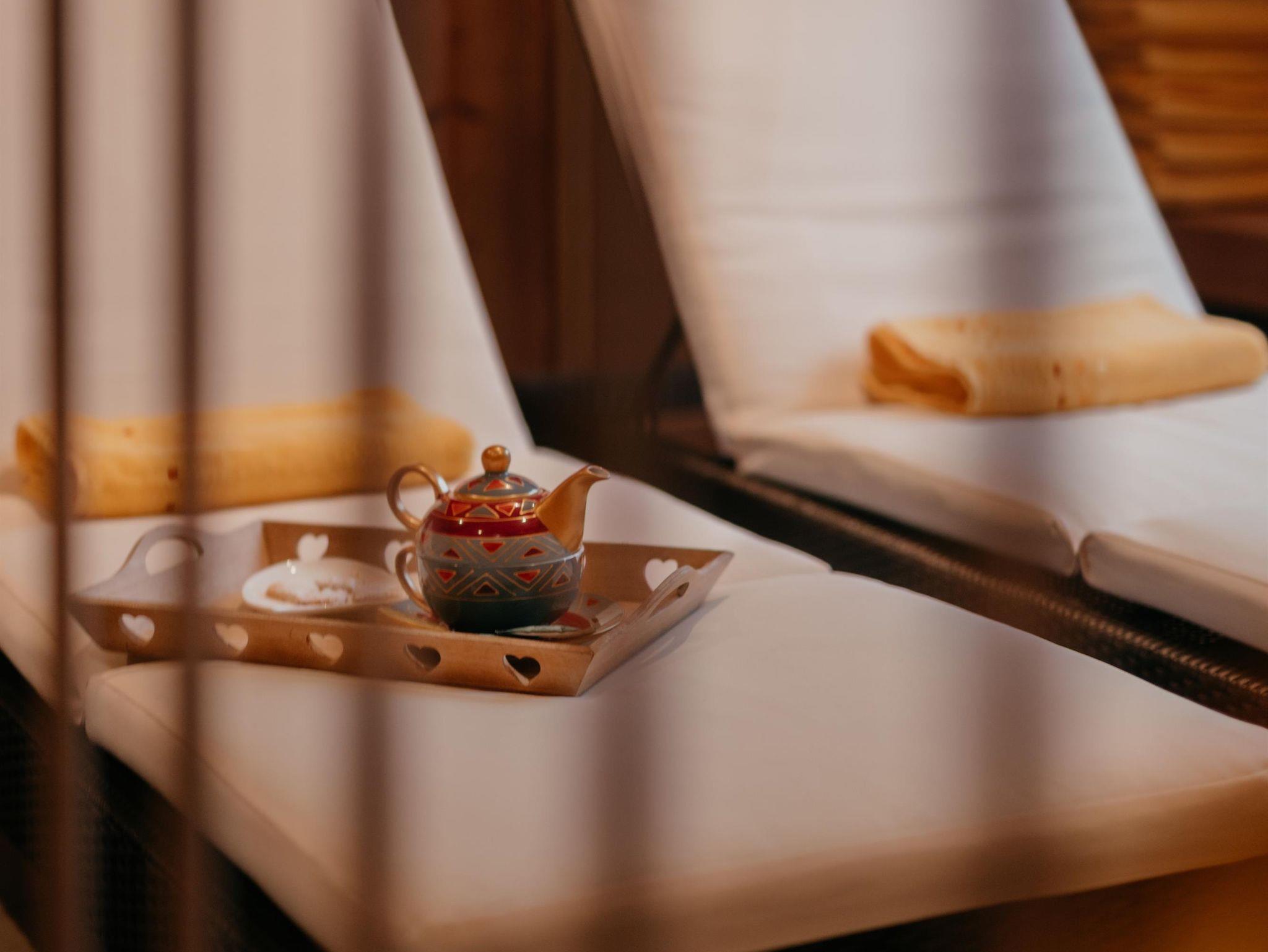 Sauna oder Kräuterdampfbad, Ruheraum.