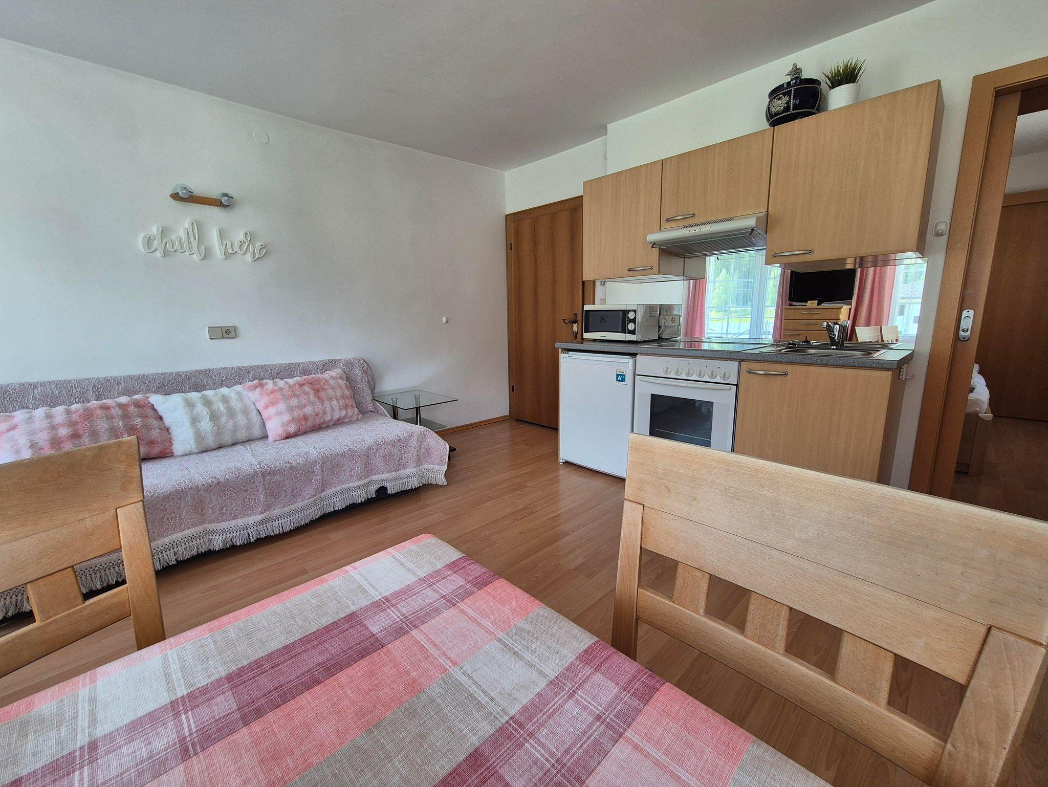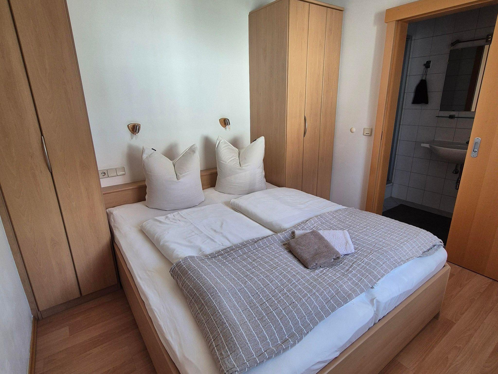 Das Appartement besteht aus Wohnküche mit Flachbild-Sat-TV, kostenfreies W-Lan, Couch, kleiner Balkon, Doppelzimmer mit Dusche/WC.